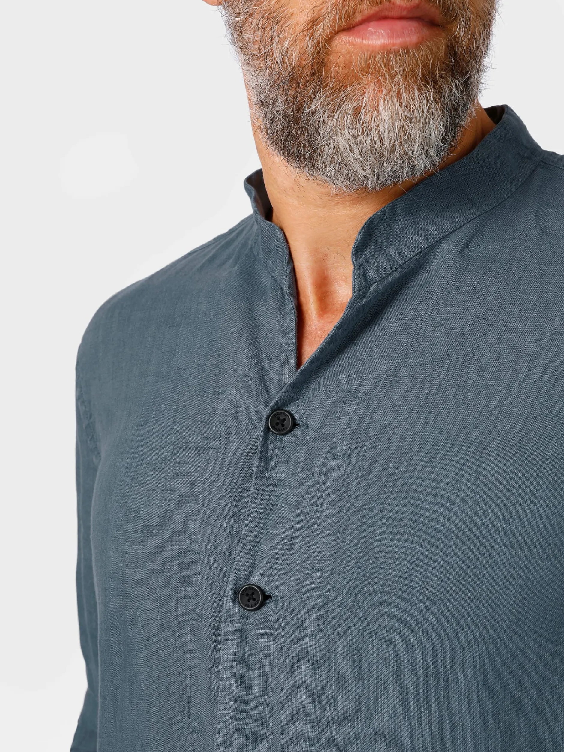 Das lässig-entspannte Erscheinungsbild dieses Hemds wird durch seine durchdachten Details geprägt. Das beginnt beim Stoff, der aus reinem Leinen besteht. Das markante Gewebe ist nicht nur strapazierbar und kühlend, es besitzt auch eine leicht unregelmäßige Struktur und den materialtypischen Edelknitter. Passend dazu zeigt es einen stark ausgewaschenen Effekt. Der Schnitt des Hemds ist gerade und locker fallend, der schmale Stehkragen bewusst ohne Knopf gearbeitet. Die Machart ohne Brusttasche kommt dem lässigen Look ebenfalls zugute, zugleich verstärkt sie den puristischen Gesamteindruck.