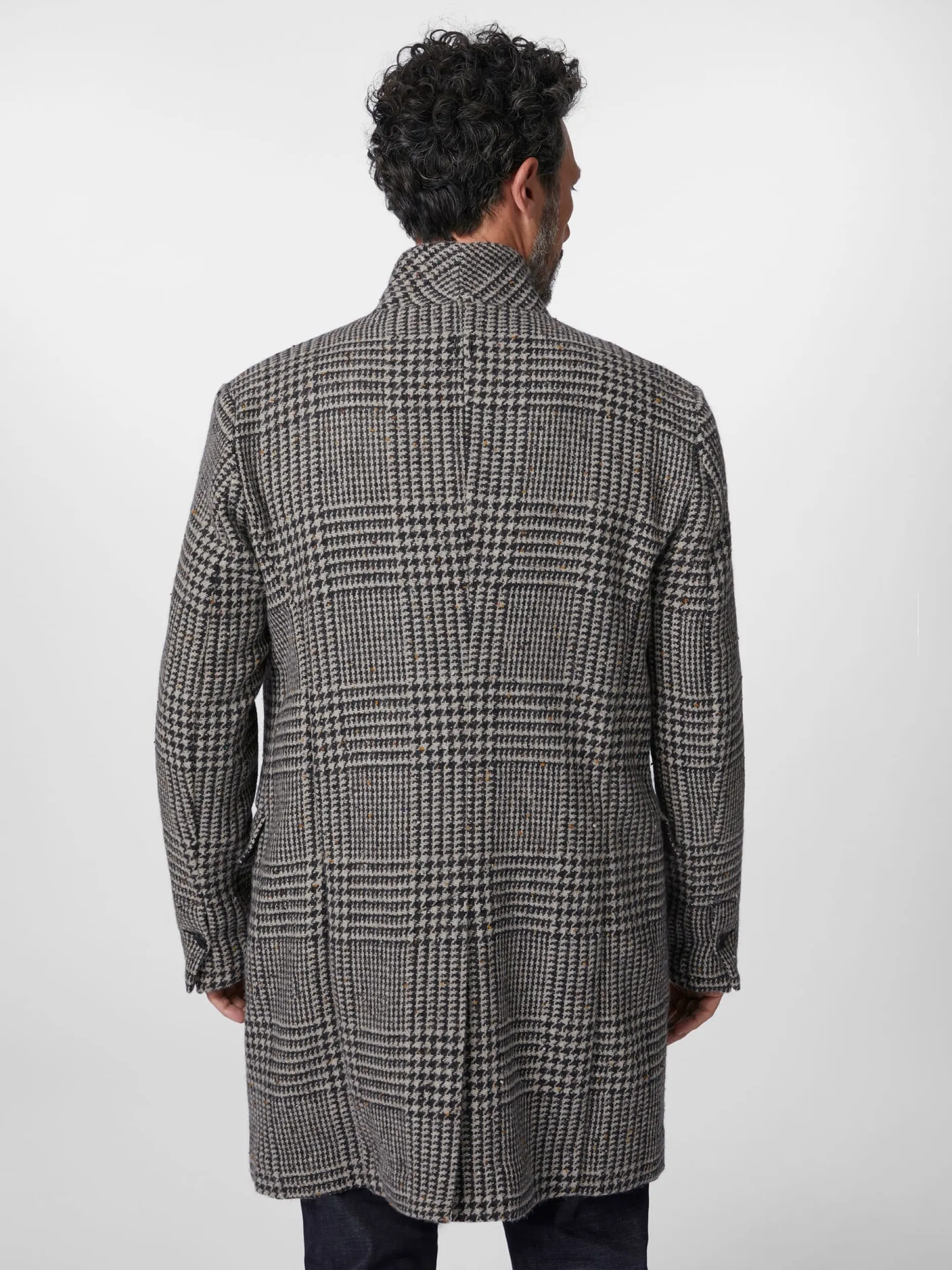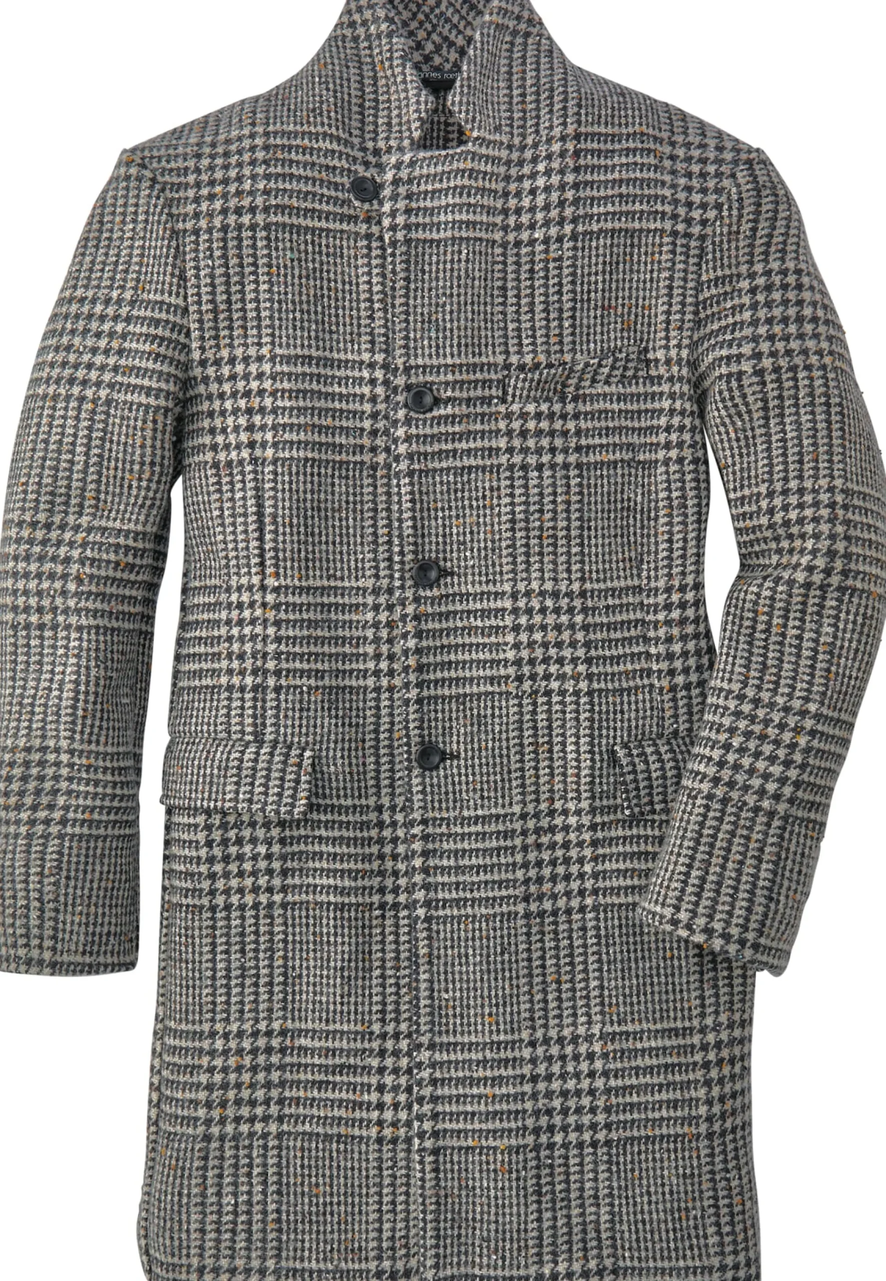 Das griffige wärmende Gewebe dieses Mantels zeigt nicht nur ein klassisches Glencheckmuster. Es besitzt auch farbige Einsprengsel, deren Fasern wie die „flecks“ beim berühmten irischen Donegal Yarn fest in die Garne eingearbeitet sind. Dies gibt dem Stoff ein besonders markantes Erscheinungsbild. Für die wärmenden Qualitäten sorgt der Umstand, dass der Oberstoff zu 90 Prozent aus Schurwolle besteht, zehn Prozent Polyamid machen ihn strapazierbarer. Der Mantel ist teilgefüttert, wobei das Rumpffutter aus reiner Baumwolle besteht, während die Ärmel mit Polyester gefüttert sind, was das An- und Ausziehen erleichtert. Die Ärmelenden sind geknöpft, ein Rückenschlitz erhöht den Tragekomfort. Zwei eingesetzte Taschen mit Patten sowie eine Innentasche nehmen Kleinteile des täglichen Bedarfs auf.