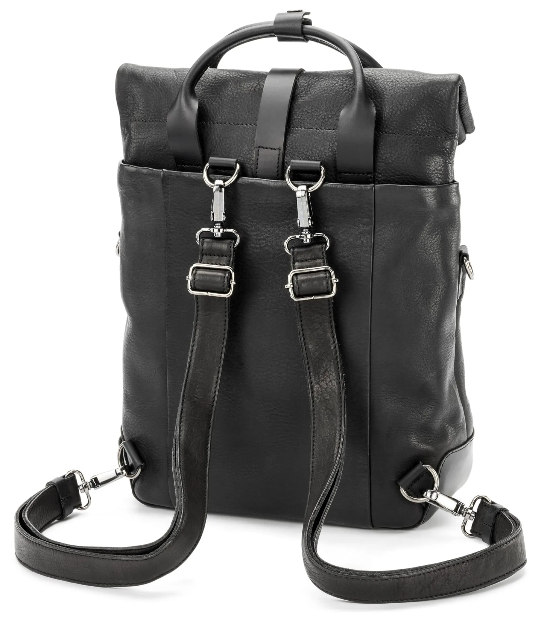 Diese Tasche aus samtig-griffigem, gewachstem Rindleder kann sowohl als Rucksack wie auch über der Schulter oder an den Handgriffen getragen werden. Mit ihrer außergewöhnlichen, gleichzeitig sachlich-funktionalen Gestaltung und einem gepolsterten Laptop-Fach im Inneren wird sie zur perfekten Business-Tasche und ist überdies für jedes Transportmittel, insbesondere auch für kurze Fahrradstrecken, tauglich. Dafür kann der zusätzliche Baumwollgurt mittels Karabiner angebracht und als Schulterriemen crossbody gelegt werden. Zudem ist das Volumen dank des Umschlags variabel, wobei sich die Tasche auch bei maximaler Befüllung noch schließen lässt. Für ein bequemes „Be- und Entladen“ des Rucksacks ist der Überschlag mit zwei Reißverschlüssen versehen, mit denen die Öffnung vergrößert werden kann. Sattlerleder-Riemen mit Patronentaschenverschluss schließen Haupt- und Laptop-Fach. Innen ist die Tasche mit einem graumelierten Futterstoff ausgeschlagen, der zu gleichen Teilen aus Baumwolle und aus recyceltem PET besteht. Außen auf der Rückseite verfügt der Rucksack über ein breites Reißverschlussfach und ein kleineres an der Vorderseite, in das zwei kleine Steckfächer integriert sind.