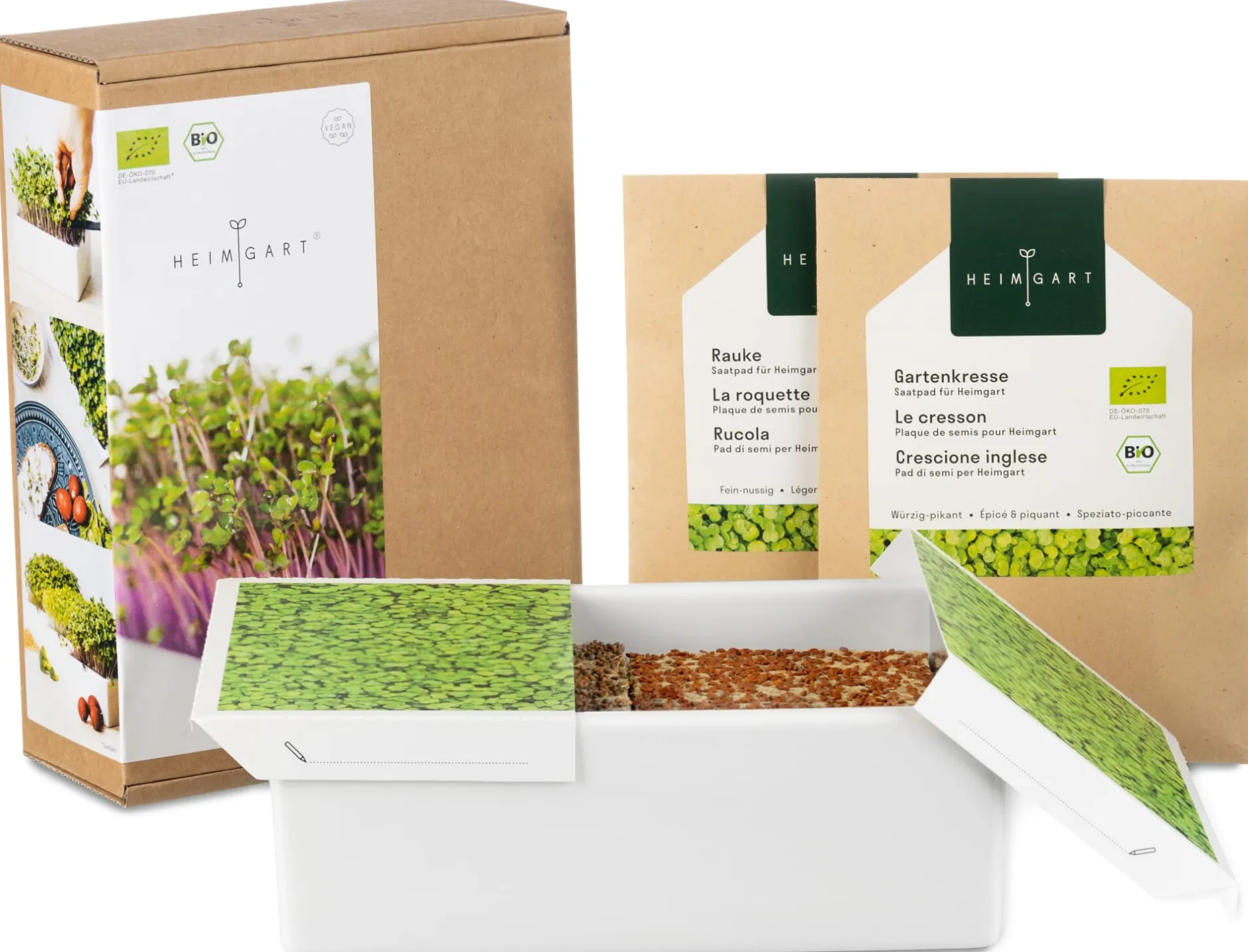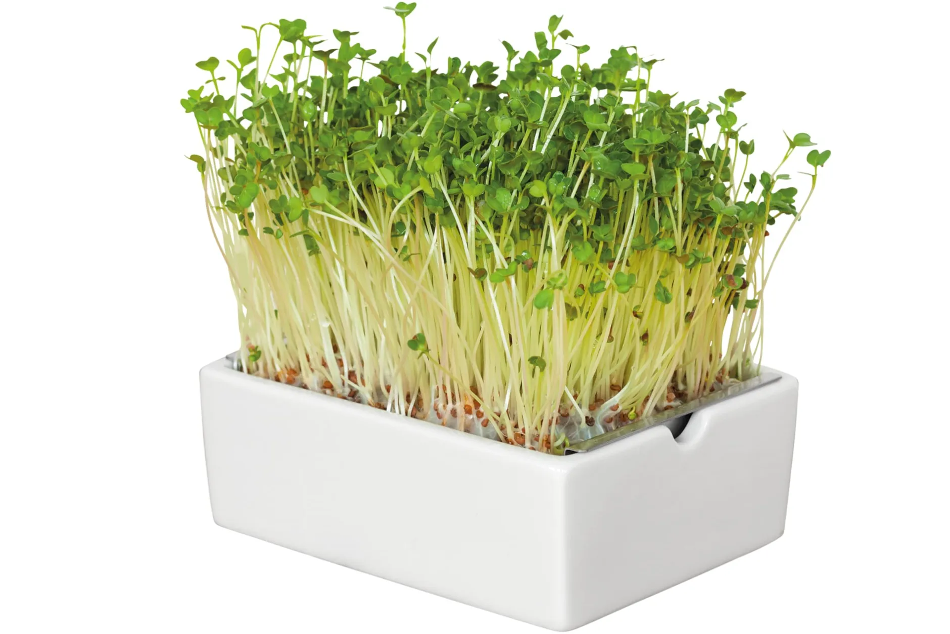 Mit diesem Set lässt sich das gesunde Grün einfach selbst ziehen. Es besteht aus zwei Teilen: aus einer kompakten, als Wasserbehälter dienenden Schale aus Porzellan und einem Siebeinsatz aus Edelstahl. Das Porzellan wird bei Seltmann Weiden, Porzellanmanufaktur in der Oberpfalz seit 1910, produziert, und auch der Edelstahleinsatz wird noch in Deutschland hergestellt.