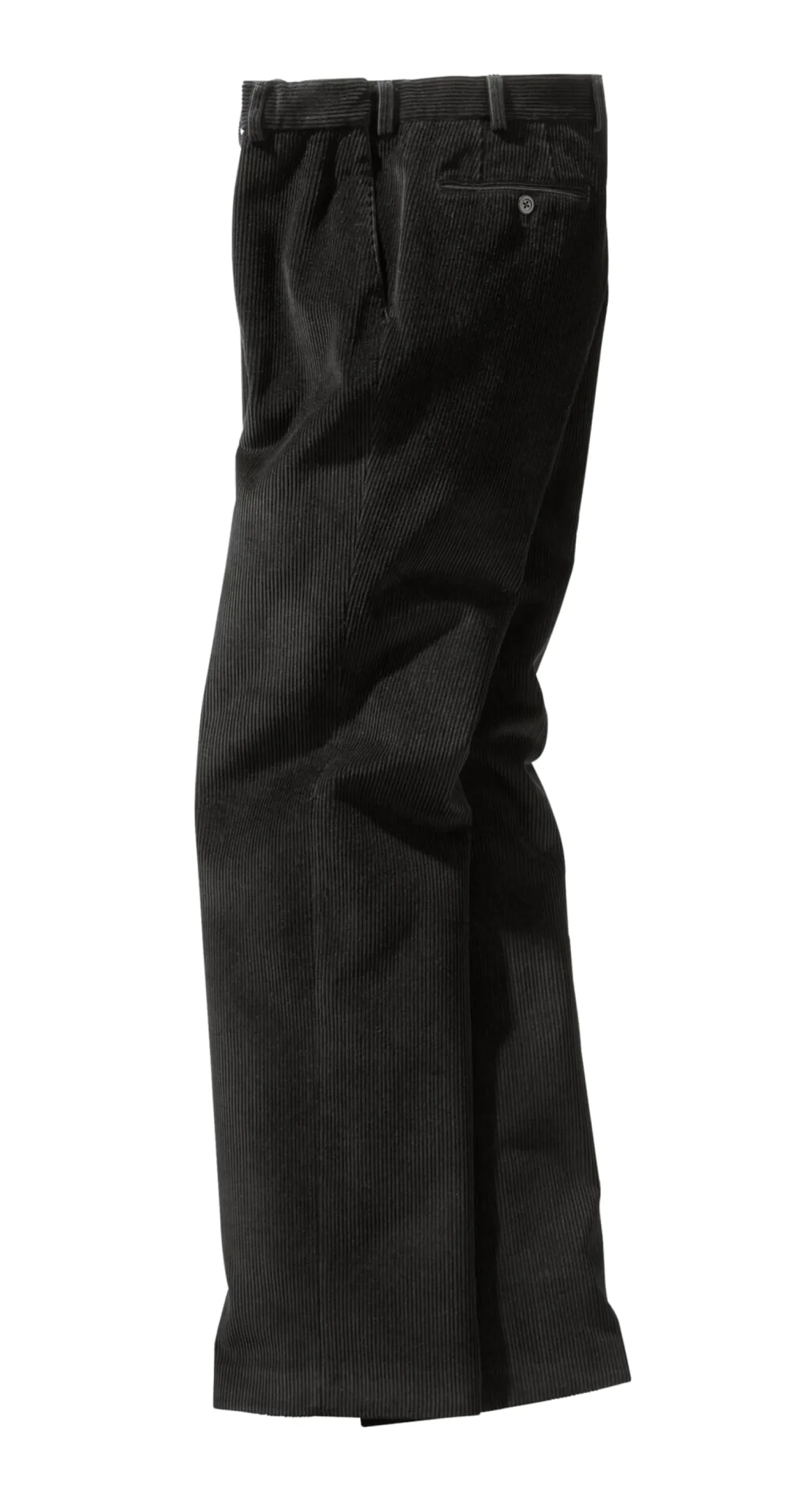 Aus diesem Cord wird üblicherweise Berufsbekleidung gefertigt – extremer Beanspruchung hält das unanfällige Material bestens stand. In der Kette kommt ein kräftiger Zwirn zum Einsatz; im Zusammenspiel mit der hohen Schussfadendichte – 55 Fäden pro Zentimeter – entsteht ein schwergewichtiges, sehr belastbares Gewebe (500 g/qm) von hoher Florfestigkeit. Diese ergibt sich zum einen aus der Art der Verankerung des Florfadens im Gewebe – aus der sogenannten VW-Bindung – und zum anderen aus der großen Anzahl Schussfäden. Herrenhosenspezialist Hiltl lässt daraus in Rumänien diese mäßig weite Herrenhose ohne Bundfalte und Aufschlag konfektionieren. Der seitliche Dehnbund ist mit Oberstoff gedoppelt. Die Hose ist mit französischen Seitentaschen und zwei paspelierten Gesäßtaschen mit Echthornknöpfen ausgestattet.