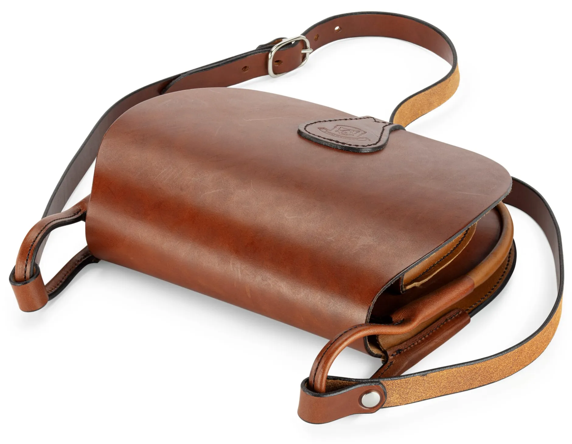 Für den Jäger aus Kurpfalz haben wir sie nicht gemacht, er würde typische Details wie die Patronenhalter oder auch den „Hühnergalgen“, an dem das erlegte Wild befestigt wird, vermissen. Statt dessen haben wir hier von klassischen Jagdtaschen die auf das Wesentliche konzentrierte Funktionalität übernommen. Im Verbund mit dem robusten Material Rindleder entstand dieses in einer westfälischen Sattlerei in Handarbeit gefertigte, für den Alltag nachgerade prädestinierte Modell. Vom Rücken bis zur vorderen Klappe ist der Korpus aus einem zusammenhängenden Stück Leder geschnitten; der Lederriemenverschluss mit Schnalle ist auf die Klappe aufgenäht. Das Hauptfach bietet den Stauraum für die Utensilien täglichen Bedarfs, während die kleinere Vordertasche (11,5 x 18 cm), deren eigene Klappe mit einem Patronenknopf fest verschlossen wird, sensible Gegenstände wie Mobiltelefon oder Geldbörse verwahrt. Ein markantes Detail sind die rundgenähten Lederbügel, an denen der längenverstellbare Trageriemen befestigt ist. Wer mag, macht’s wie ein Jäger und befestigt in diesen Bügeln zum Beispiel die Strick- oder Regenjacke.