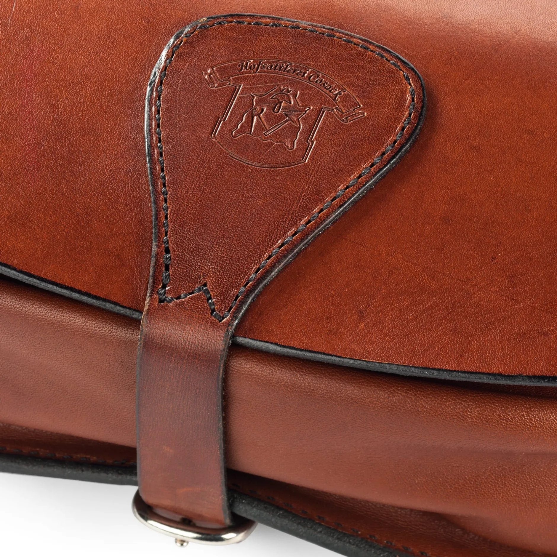 Rindleder (Stärke 2,5–3 mm), vegetabil gegerbt, ungefüttert. Mit einem längenverstellbaren Trageriemen, Länge 1,28–1,37 m, Breite 2 cm. Hergestellt in Deutschland.