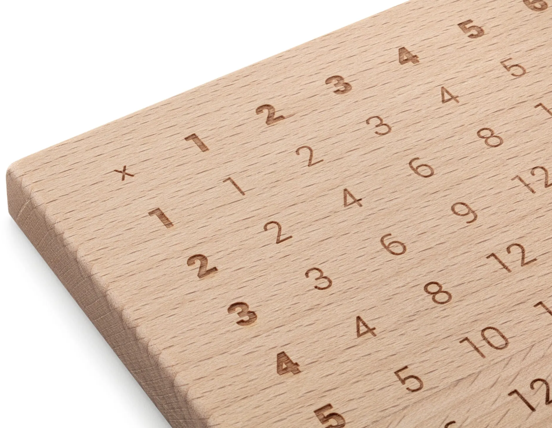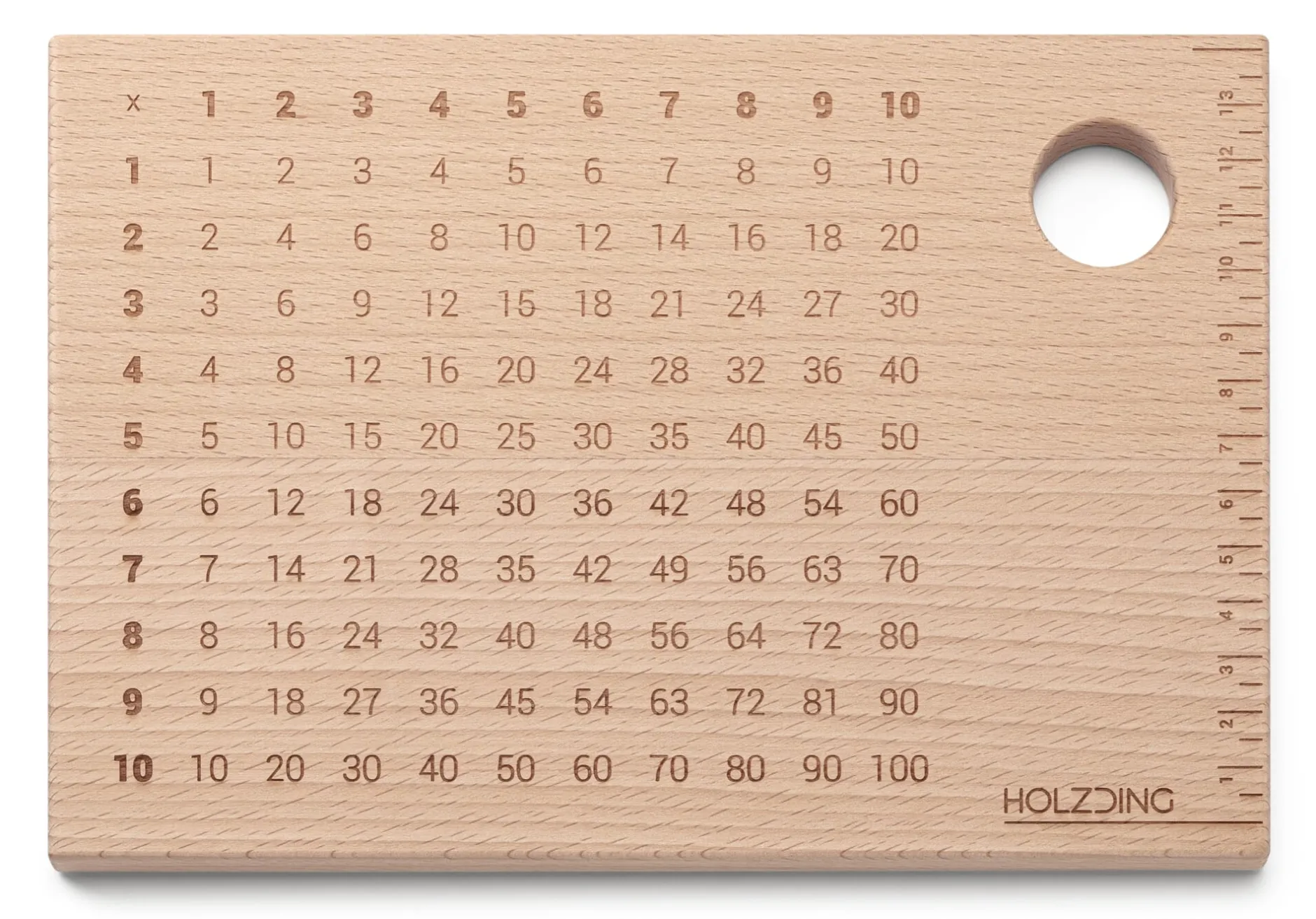 In einer Werkstatt für Menschen mit Behinderung werden diese Brettchen von Hand aus solidem heimischem Buchenholz gefertigt, alle Kanten säuberlich abgerundet und glattgeschliffen. Mit dem Laser eingraviert, sind Matrix und Lineal äußerst präzise abgebildet und auch bei ausgiebigem Gebrauch dauerhaft lesbar. Die Anwendung der Zahlentabellen ist kinderleicht – und perfekt für Mathe-Anfänger, um spielerisch das kleine Einmaleins beziehungsweise Einspluseins zu verinnerlichen. Im Schnittpunkt von Zeile und Spalte der Zahlen 1 bis 10, die multipliziert beziehungsweise addiert werden sollen, findet sich das jeweils richtige Ergebnis. Und natürlich können im Umkehrschluss auch Dividieren beziehungsweise Subtrahieren geübt werden. Zusätzlich können Ihre Sprösslinge mithilfe des seitlich eingravierten Lineals ausmessen, wer den größten Bissen vom Brot nimmt, ob der Löffel über Nacht gewachsen oder die Banane wirklich länger als das Salatblatt ist. Genährter Geist, genährter Körper: Zu guter Letzt findet sich in der oberen rechten Ecke der robusten Brettchen ein sauber ausgefrästes Loch, in dem das Frühstücksei fixiert werden kann.