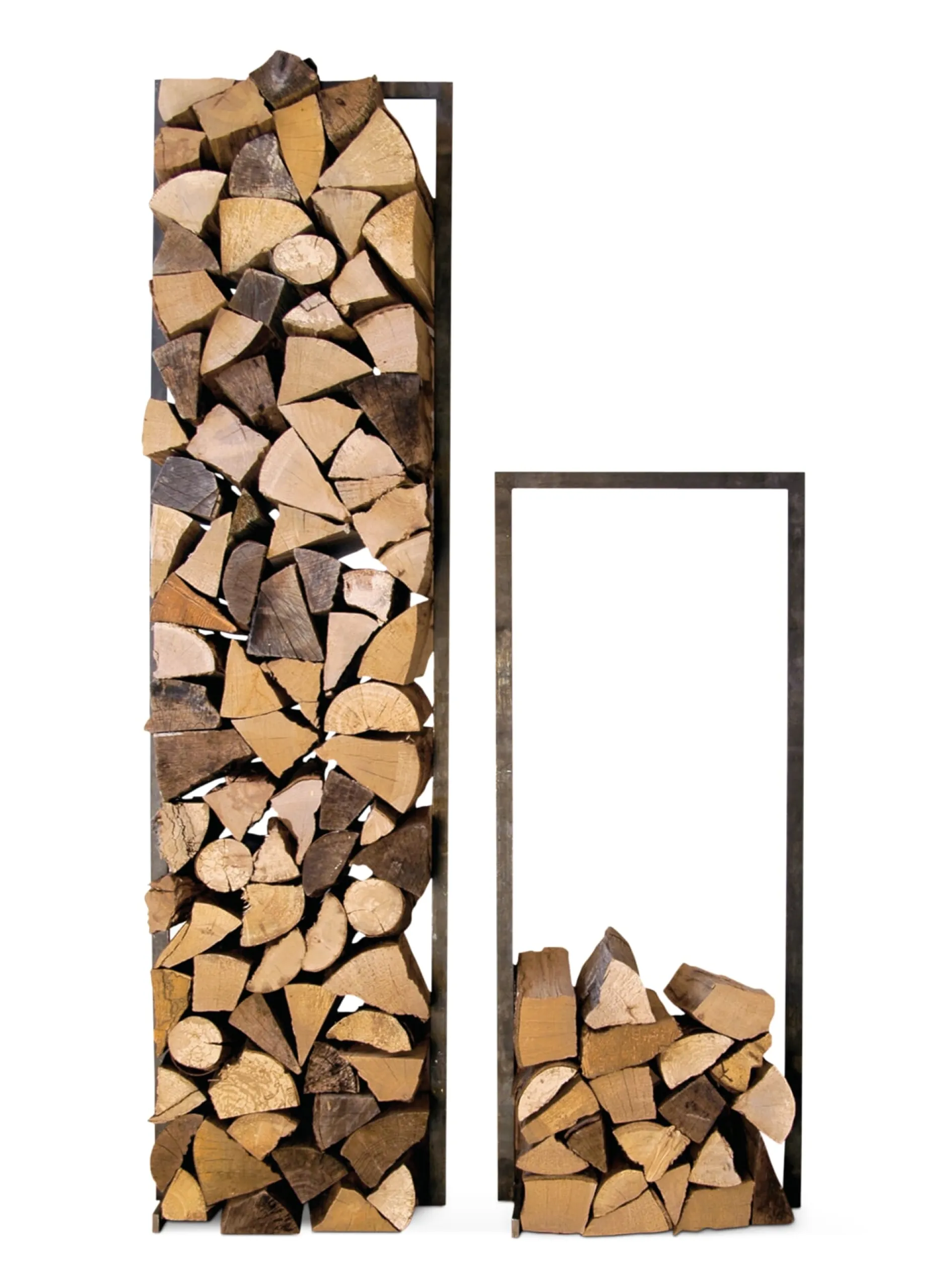 Ein Rahmen aus rohem verzundertem Stahl gibt dem Brennholz seitlichen Halt. In zwei verschiedenen Höhen gestapelt, steht das Holz sicher und ist auch als Raumteiler einsetzbar.