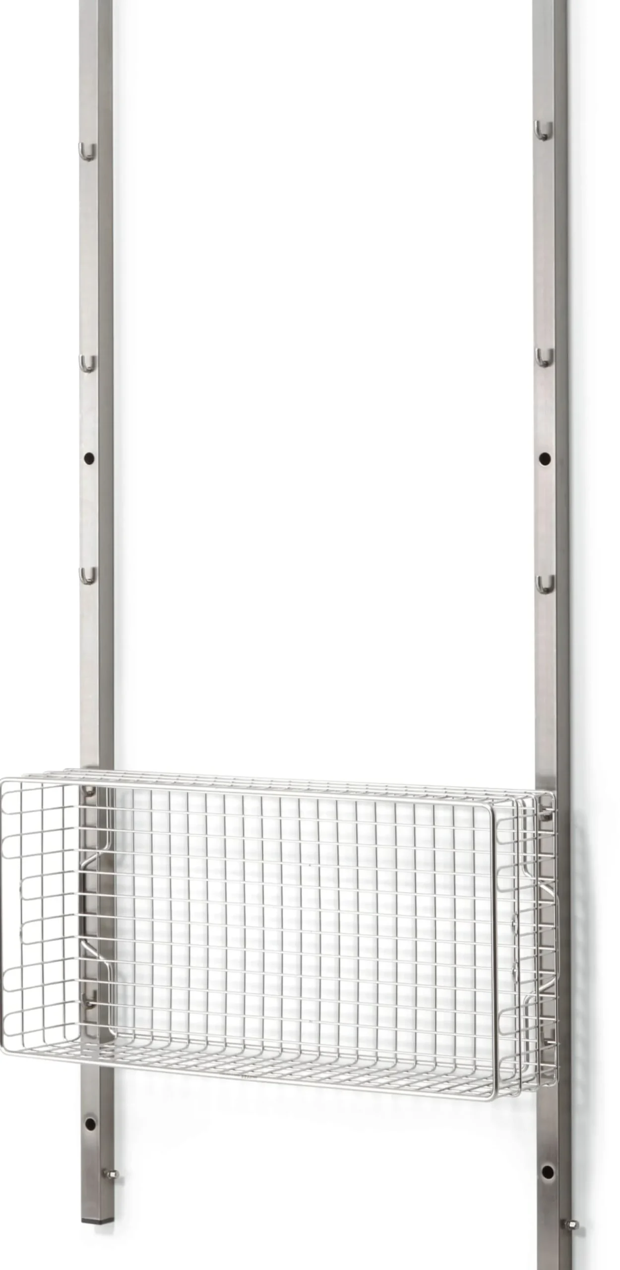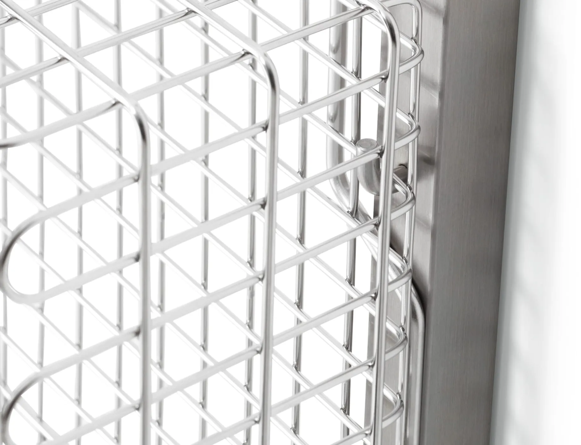 Das Regalsystem INOX wurde als Stauraumsystem für Sterilgut und Sterilkleidung entwickelt und hängt als solches in Laboren und anderen sterilen Räumen. Diese zum System gehörenden Gitterkörbe bieten viel Platz für allerlei Staugut und werden werkzeugfrei in die zugehörigen Wandschienen eingehängt. Ob Handtücher im Badezimmer, Geschirr in der Küche oder Schals und Fahrradhelme in der Garderobe: In den Gitterkörben findet alles einen gut durchlüfteten und einsehbaren Platz. Die Körbe sind aus hochwertigem, elektrolytisch polierten Edelstahl-Rundmaterial aus dem Medizinalbereich gefertigt, nahezu unkaputtbar und leicht zu reinigen. Der stirnseitige Tragegriff sorgt für gute Handhabung, die Form des Rahmens macht die Körbe stapelbar.