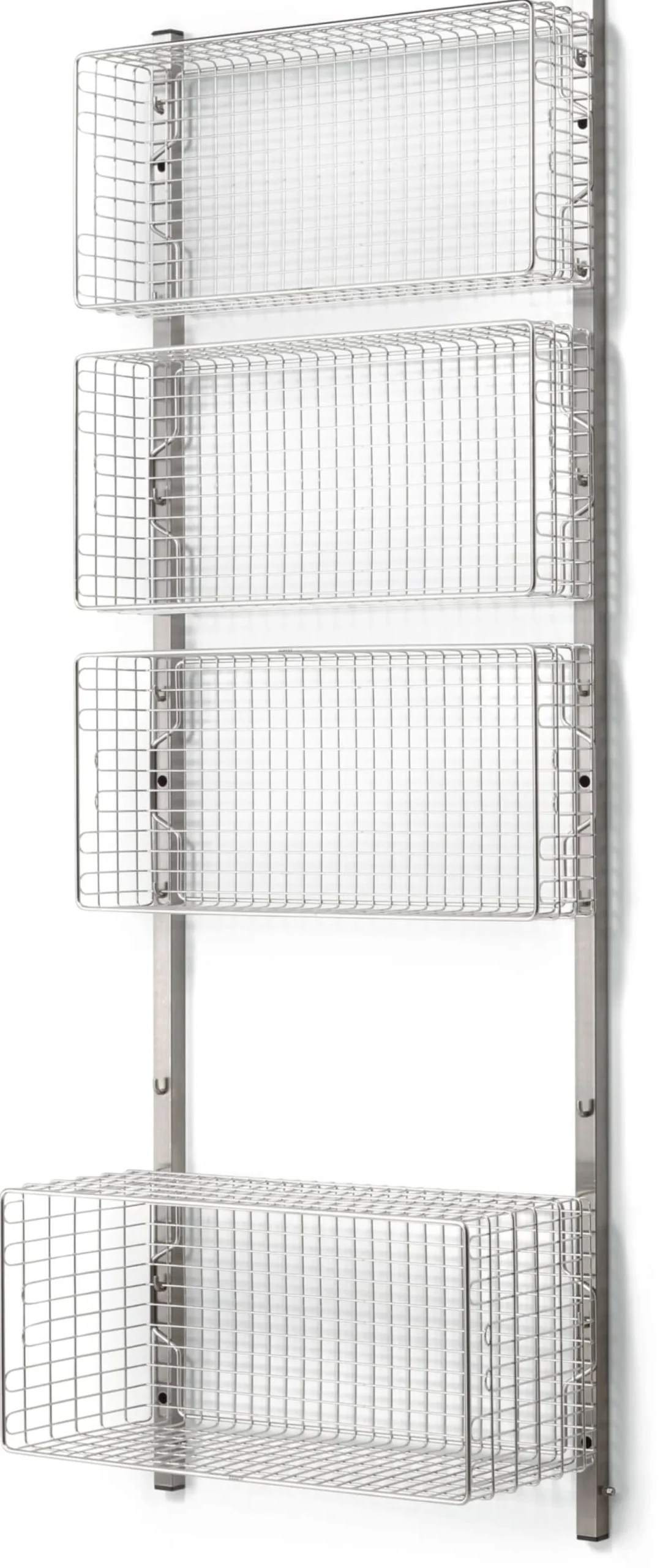 Das Regalsystem INOX wurde als Stauraumsystem für Sterilgut und Sterilkleidung entwickelt und hängt als solches in Laboren und anderen sterilen Räumen. Wir nutzen es kurzer Hand für den Wohnraum: als variables Staumöbel für Wohnbereich, Bad, Küche, Flur oder Schlafzimmer. Hier im Set aus zwei Wandhakenschienen, drei kleinen Körben (Höhe 13,5 cm) und einem großen Korb (Höhe 26,5 cm). Sie bieten belüfteten und gut einsehbaren Stauraum für allerlei Dinge: von Handtüchern, über Büromaterial bis hin zu Schals oder Fahrradhelmen. Praktisch: Bringt man die Körbe um 90 Grad gekippt, also mit der Öffnung nach vorne an, entsteht ein luftiges Regal mit Fächern in zwei unterschiedlichen Tiefen (13,5 cm und 26,5 cm) und industrieller Wirkung.