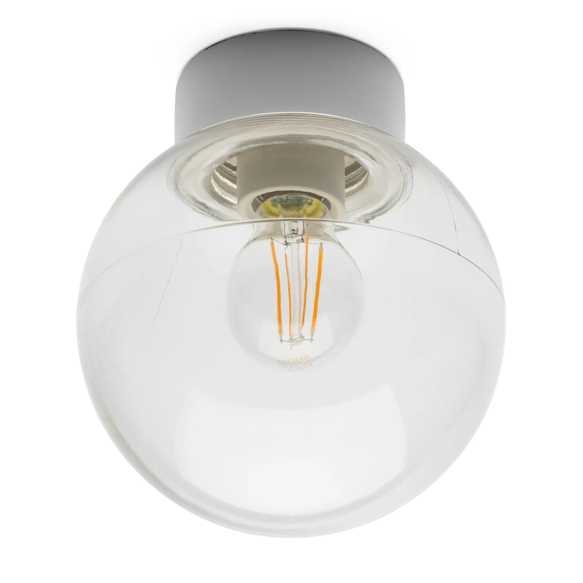 Weißer Porzellansockel, Ø 10 cm. Kuppel aus mundgeblasenem Klarglas, Ø 18 cm. Kunststoffdichtung. Höhe 20,5 cm. Gewicht 1,1 kg. Keramikfassung E27 (max. 75 W). Lieferung ohne Leuchtmittel.