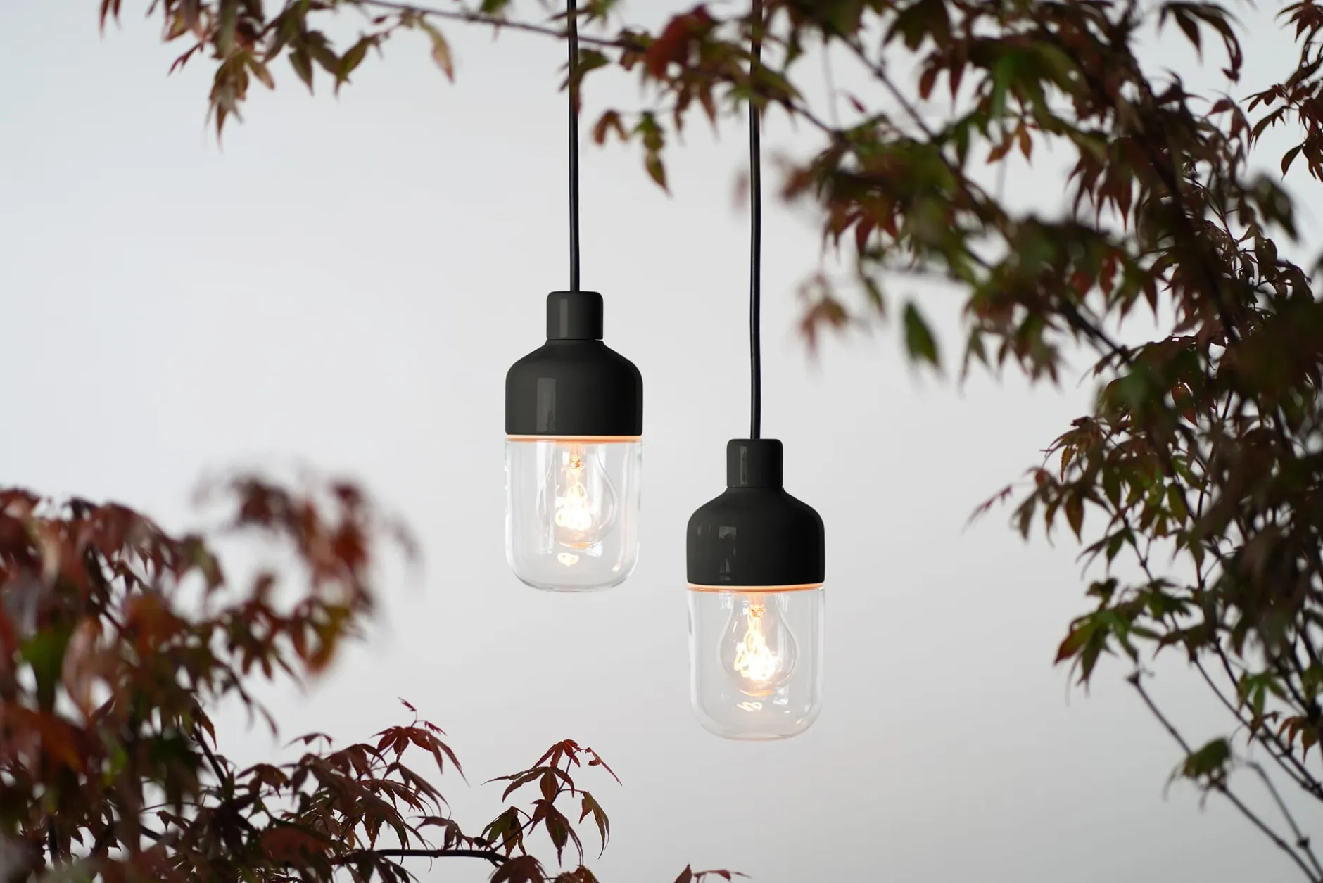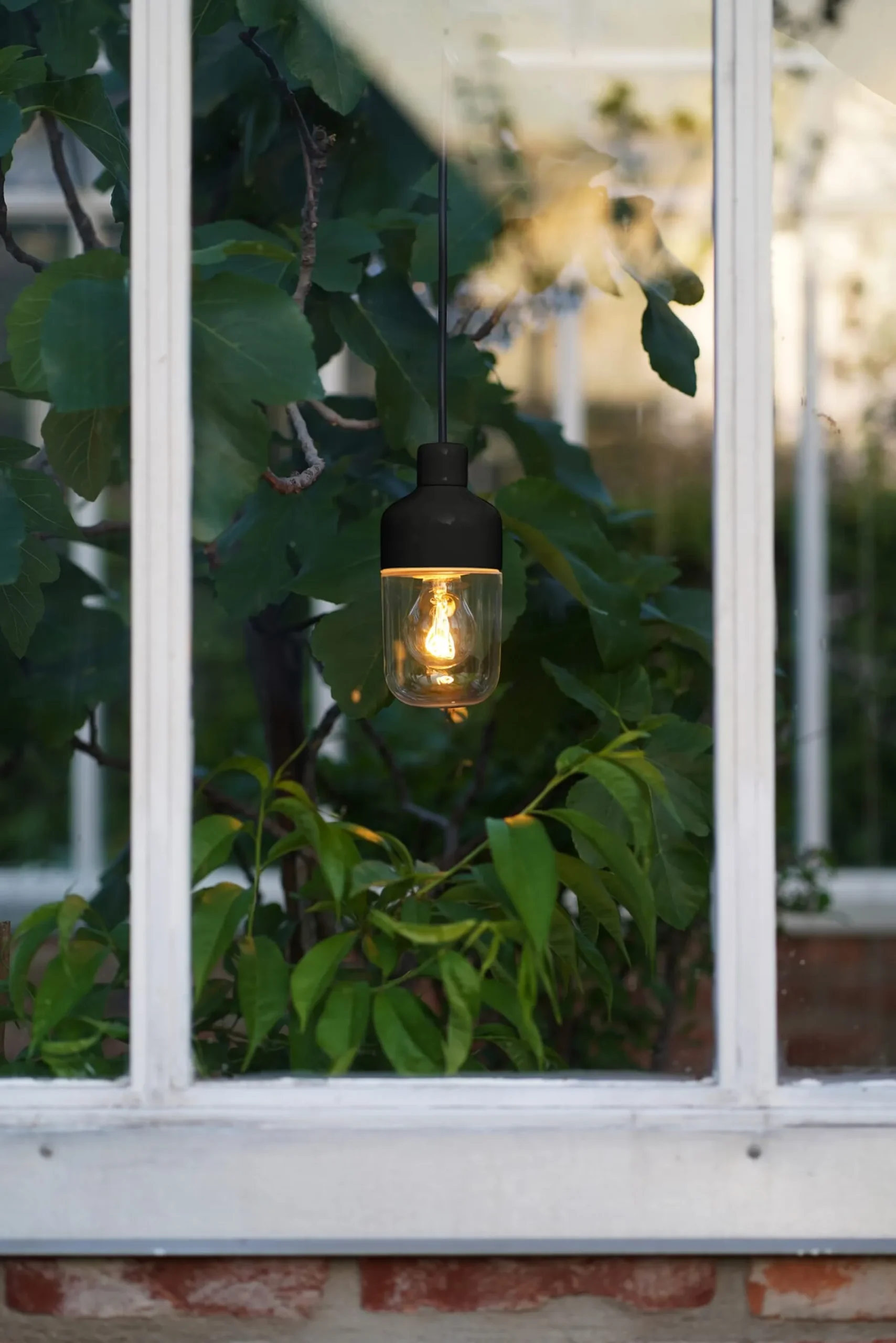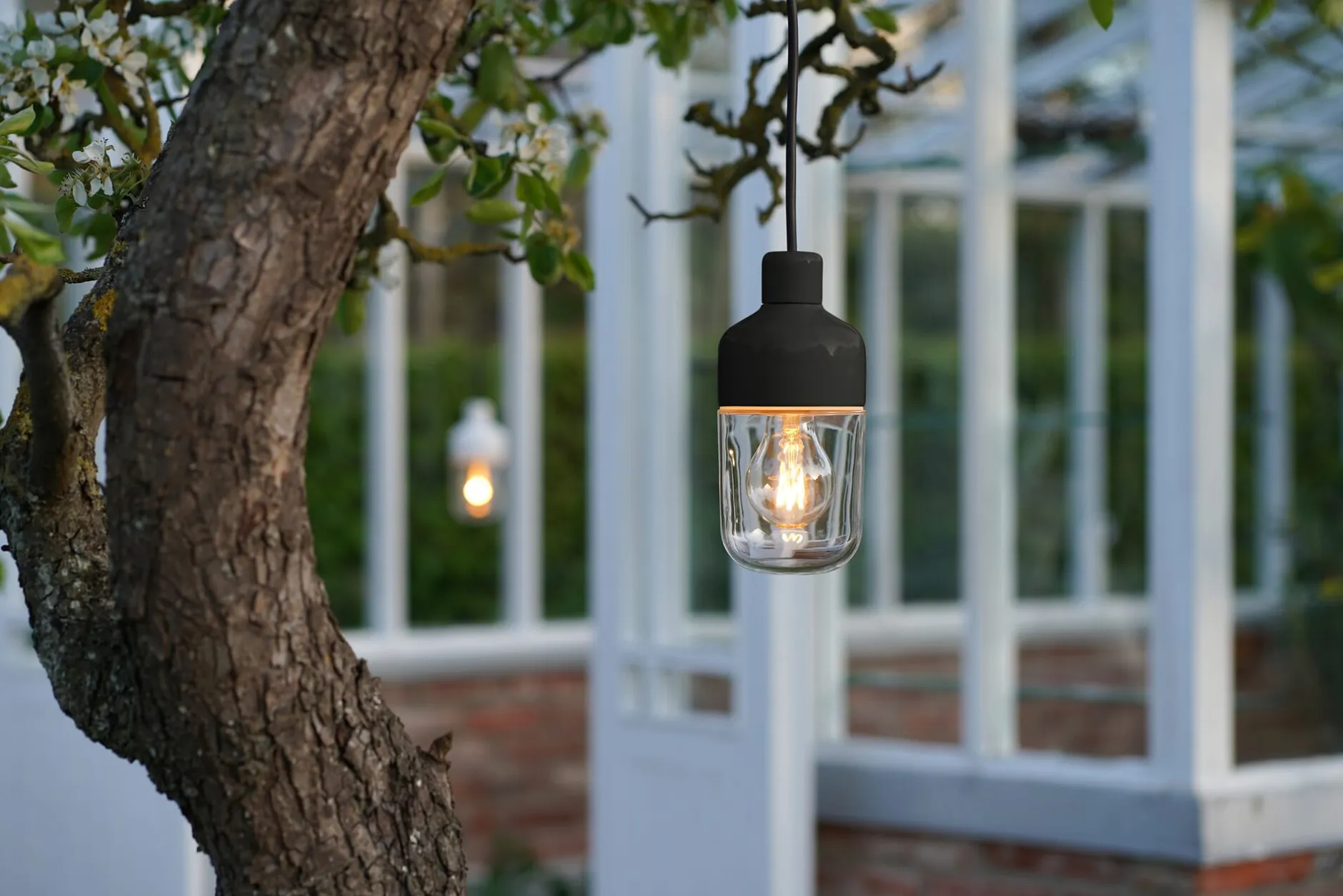 Formschöne, zierliche Pendelleuchte mit einem Porzellan- und Glaskörper. Die Leuchte ist mit einem langen Kabel und Schukostecker bestückt, kann somit überall platziert werden – am Baum, an der Pergola oder an einem Haken im Fenster – und liefert durch den klaren Glasschirm ein allseitig abstrahlendes Licht.