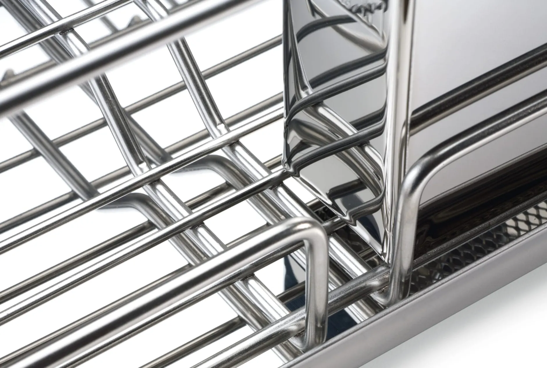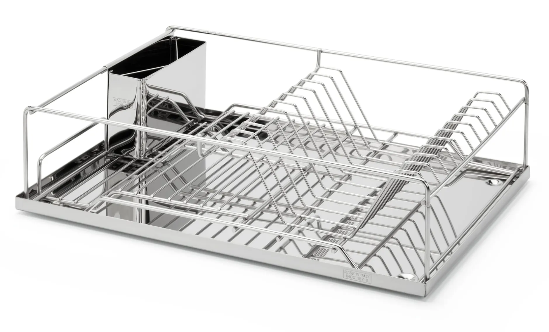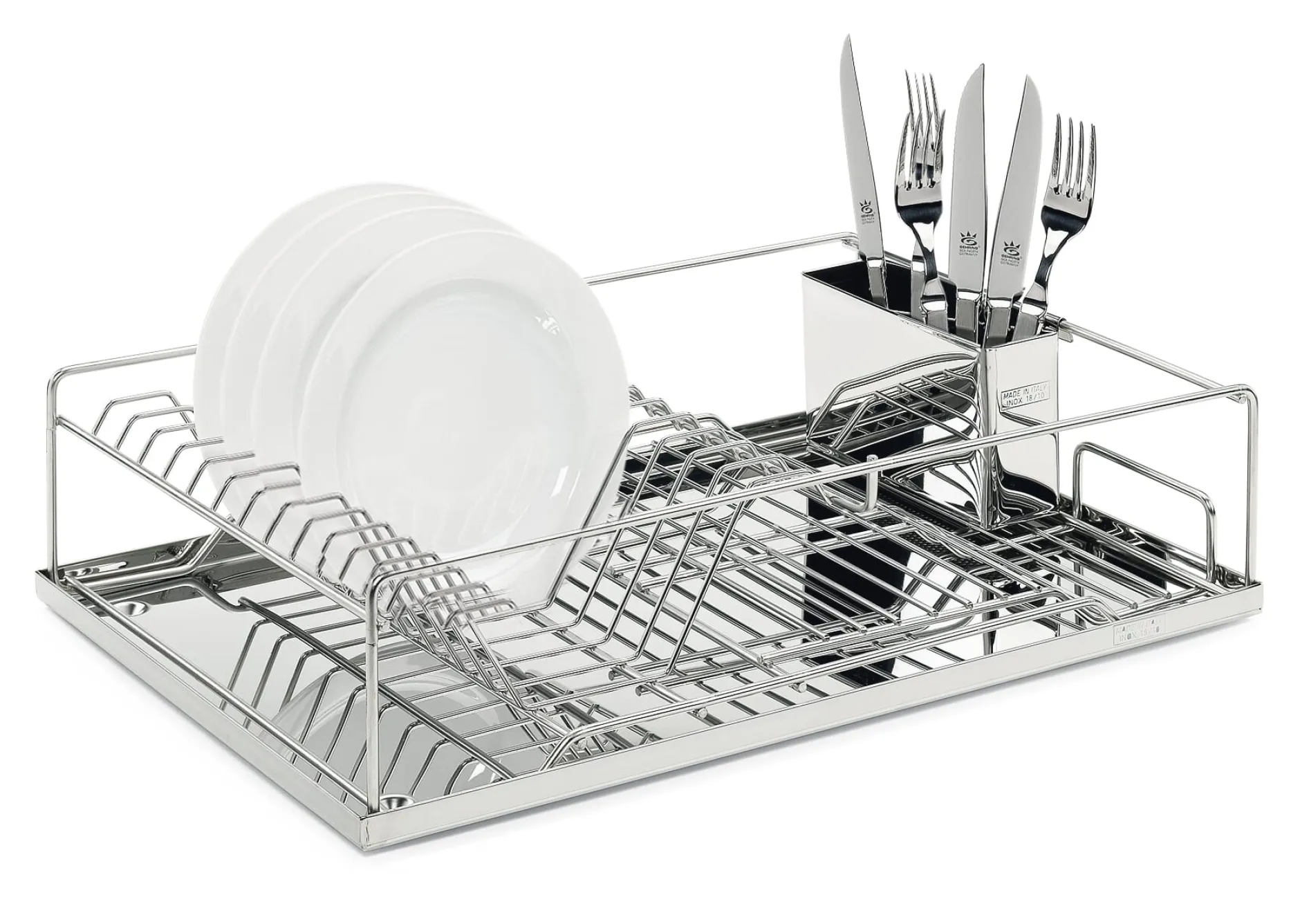 In Italien wird dieses solide und sauber verarbeitete Abtropfgestell hergestellt: aus rostfreiem Edelstahl. Das Gitter besteht aus 5 mm starkem Rahmendraht und steht auf einer komplett geschlossenen Abtropfwanne. Der Besteckkasten lässt sich platzsparend innen oder auch außen einhängen.