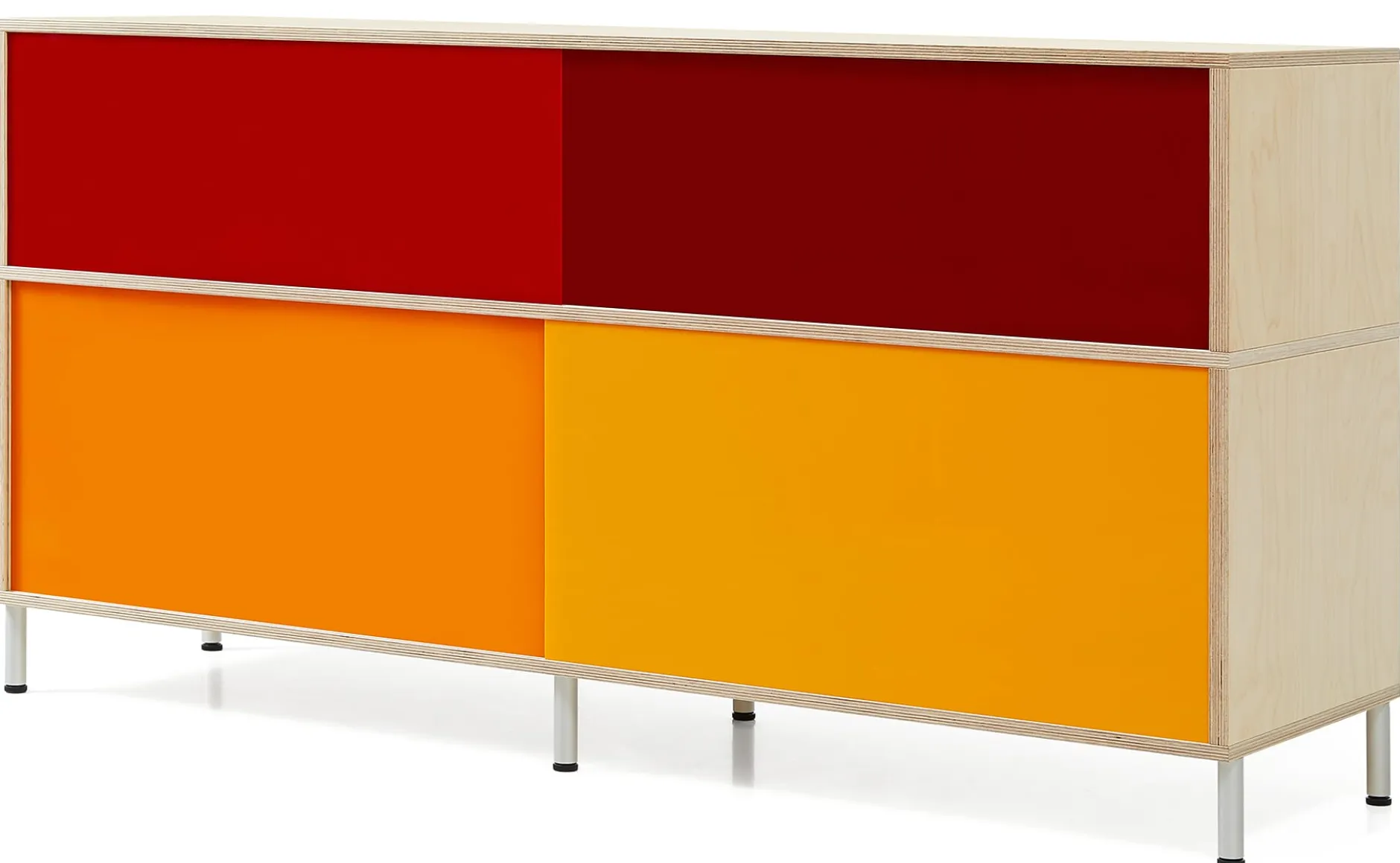 Satz von vier Schiebetüren in den Farben Dunkelrot, Rot, Orange und Hellorange oder in einem neutralen, fast lichtundurchlässigen Weißton zum Einsatz im Sideboard IRION HOCH. Die Schieber werden werkzeugfrei in die Führungsschienen des Korpus eingesetzt.