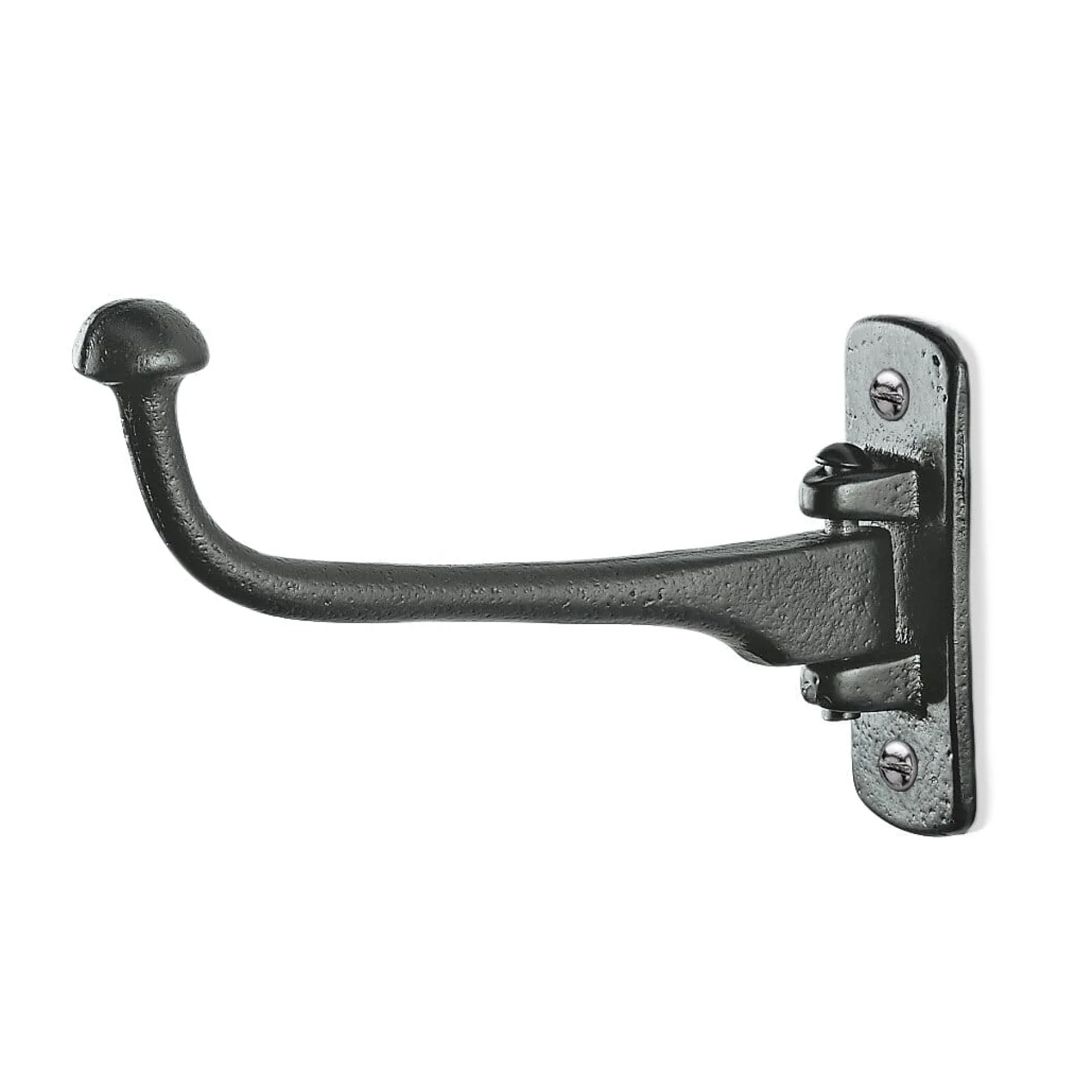 Gußeisen schwarz. Der Haken kann zu beiden Seiten weggeklappt werden. Höhe 6 cm, Breite 2,5 cm, Ausladung 10,5 cm. Gewicht 90 g. Ohne Befestigungsmaterial.