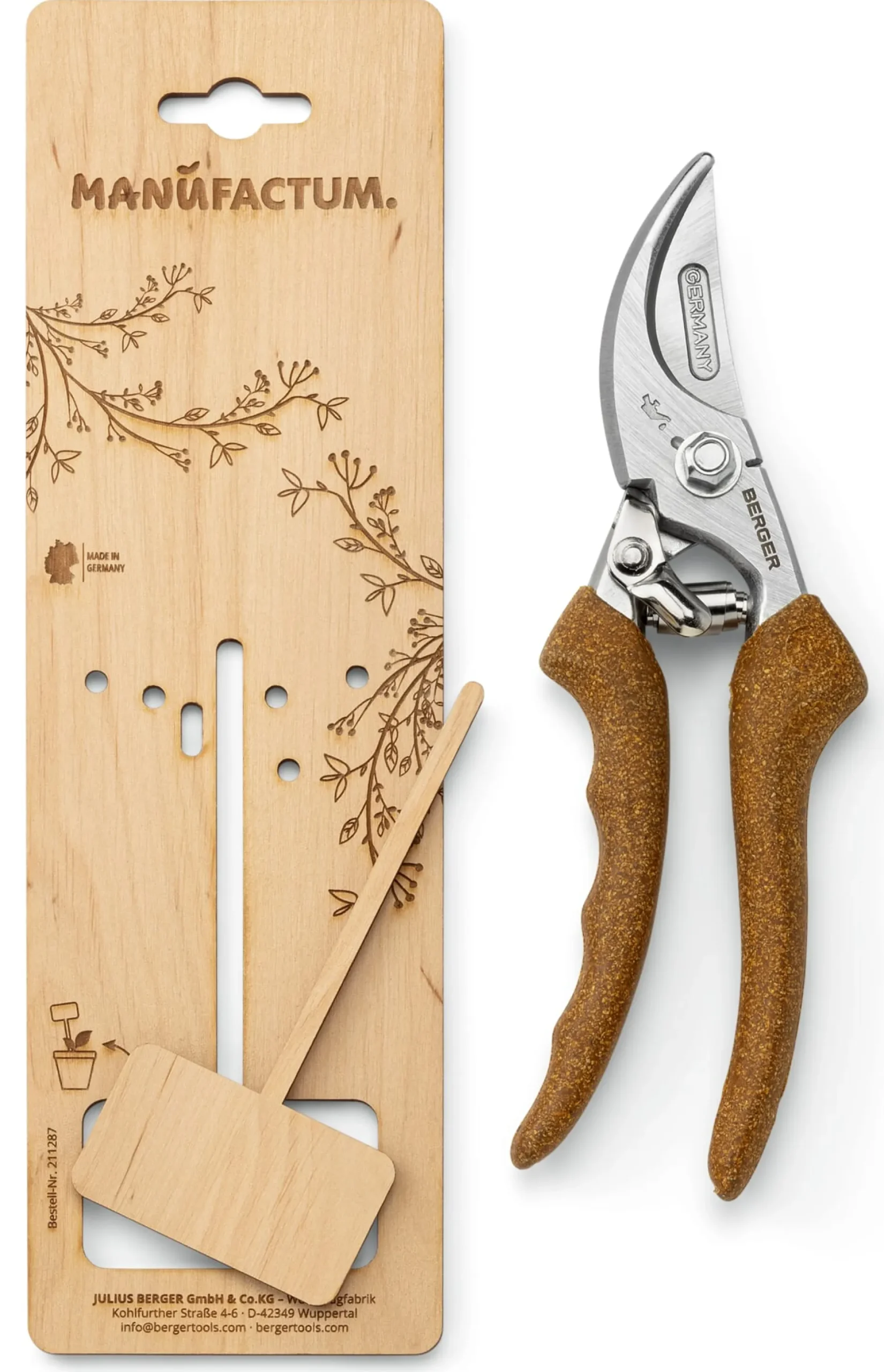 Die Klingen unserer Gartenschere mit Korkgriff sind nicht austauschbar, sie lassen sich aber jederzeit nachschärfen. Der eingeschmiedete Ölungspunkt vereinfacht das Schmieren der Mechanik ohne Demontage des gesamten Scherenkopfes. Ein Tropfen Ballistol oder Werkzeugpflegeöl, und schon lässt sich die Schere (wieder) so leichtgängig bedienen wie eh und je. Eine eingebaute Drahtkerbe erleichtert zudem das Durchtrennen von weichem Blumendraht. Anstelle des üblichen Kunststoffblisters setzen wir bei dieser Gartenschere auf eine einladende Art der Verpackung: Geliefert wird das Werkzeug auf einer Vollholzplatte aus Erlenholz mit ansprechendem Blumendekor. Am Kopf dieser Platte ist eigens unser Logo eingelasert, aus dem unteren Ende lässt sich zusätzlich ein beschreibbares Pflanzenetikett herausdrücken.