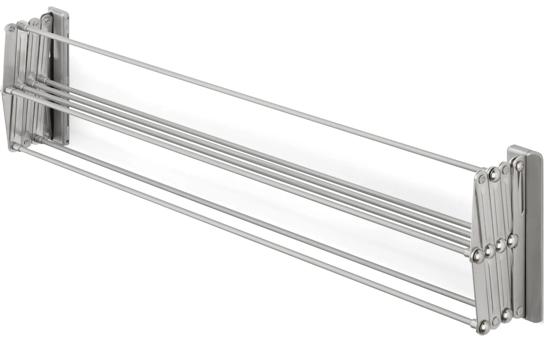 Scherenkonstruktion und Wandschienen aus Aluminium. Stäbe Stahl kunststoffummantelt. Hergestellt in der Slowakei. Höhe 18,5 cm, Breite 79,5 cm, Ausladung 9–46 cm. Gewicht 1,6 kg. Belastungsgewicht max. 20 kg. Montagezubehör und -anleitung liegen bei.