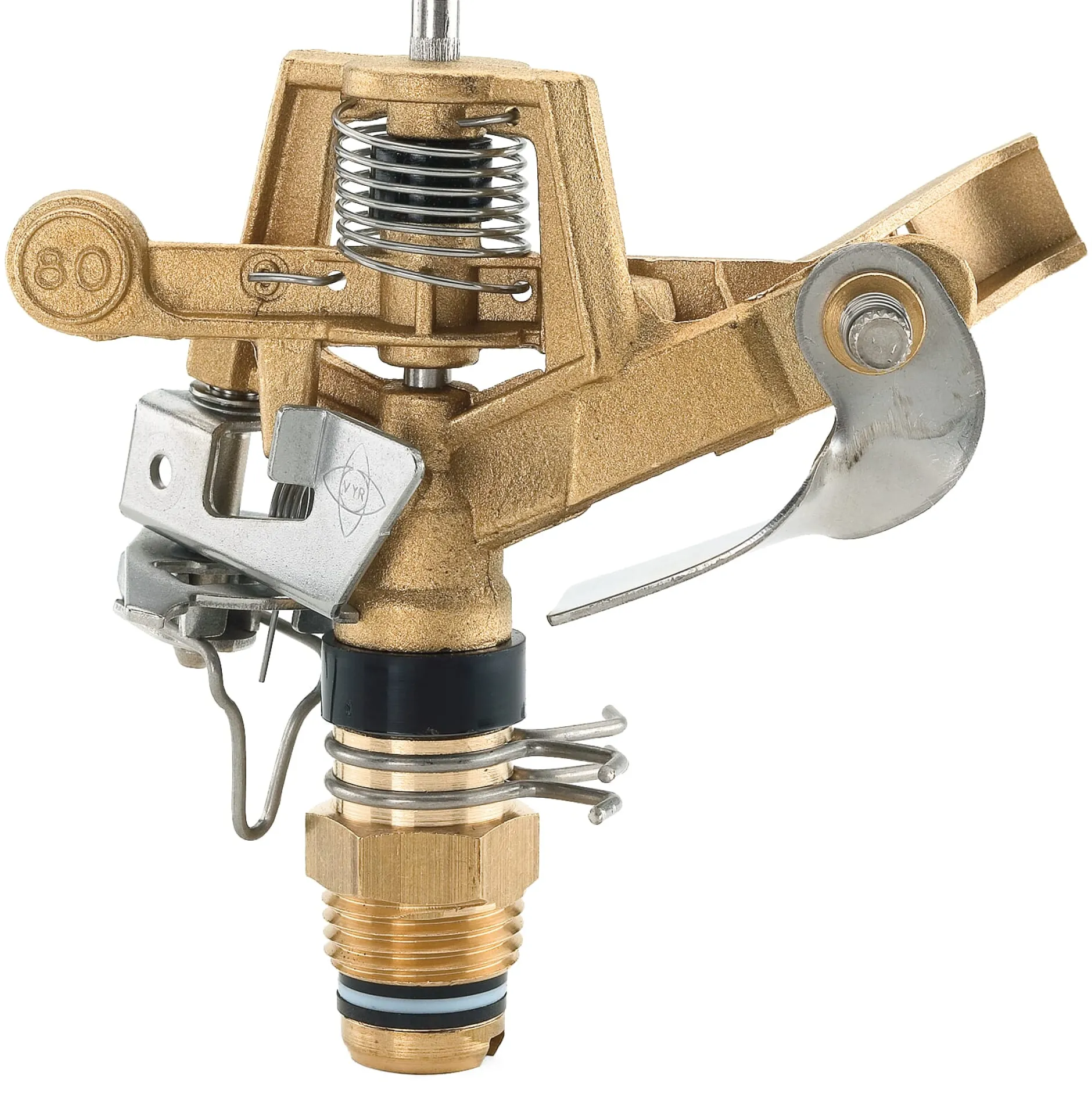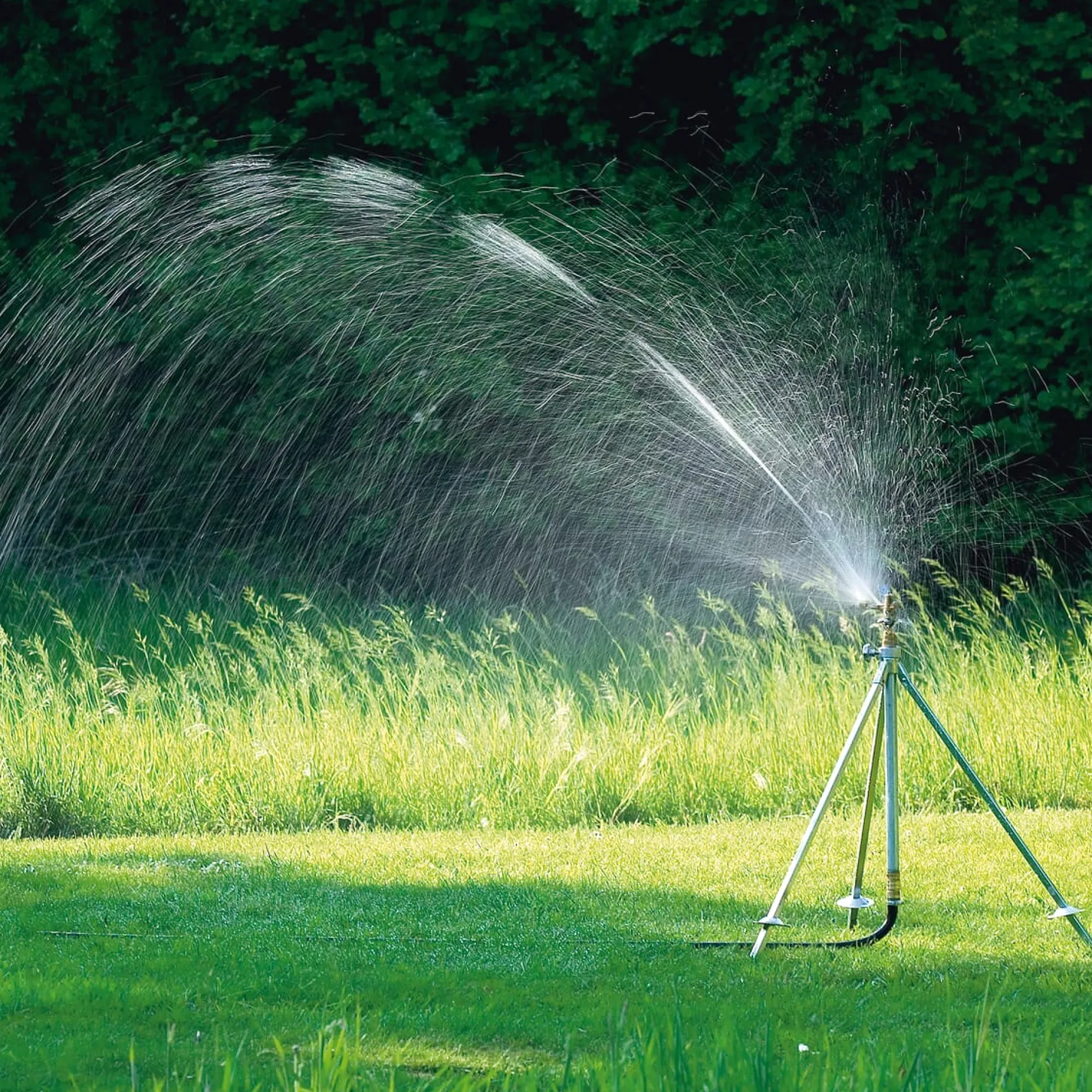 Tadellos gearbeiteter Kreisregner, der auf Voll- oder Teilkreisflächen von 20° bis 360° einstellbar ist. Die Wurfweite ist abhängig vom Wasserdruck und beträgt zum Beispiel bei 4 bar 13 m. Mit Hilfe einer sogenannten Strahlstörschraube kann sie verringert werden, wobei sich gleichzeitig der Wasserstrahl verbreitert. Die Ausbringhöhe lässt sich mit einem Prallteller regulieren.