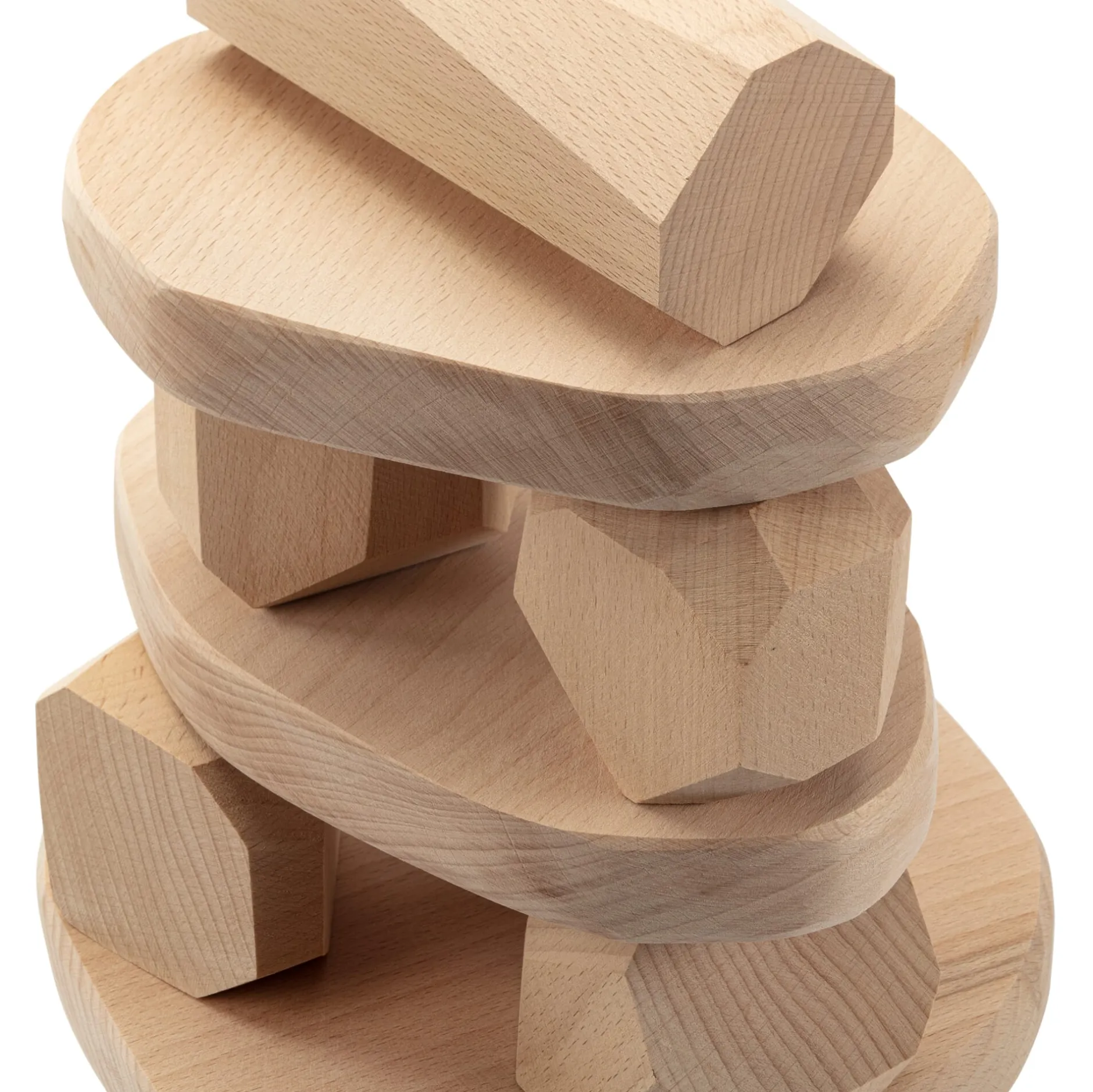 Kein Stein ist wie der andere – und doch bleibt (mit ein wenig Geduld) ein Stein auf dem anderen. Was stimuliert Sie und Ihr Kind wohl eher zum Ausprobieren: die Stereotypie eines exakt zugeschnittenen, immer gleichen Quaders – oder die unberechenbare Unregelmäßigkeit eines Bruchsteins? Keine Frage, die Herausforderung, diese Holzbausteine in Naturformen zu einer stabilen Konstruktion zu stapeln, ist ungleich größer als beim klassischen Turm aus identischen Holzbauklötzen. Anstelle von geraden Kanten willkürlich wirkende Schnittflächen, statt kerzengerader Türme wogende Stapel – hier offenbart sich das Wesen des freien Spiels.