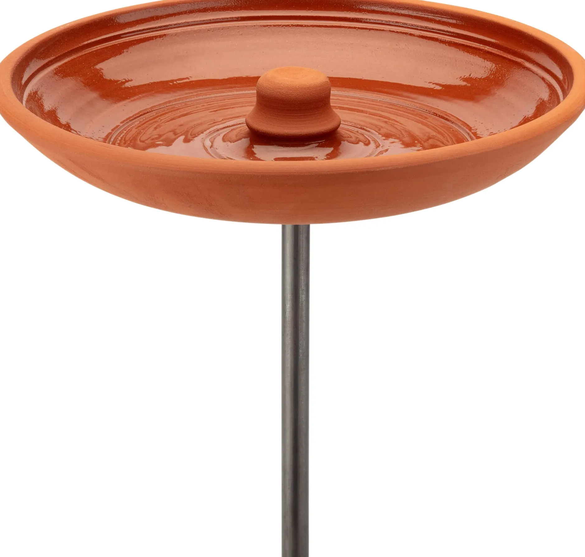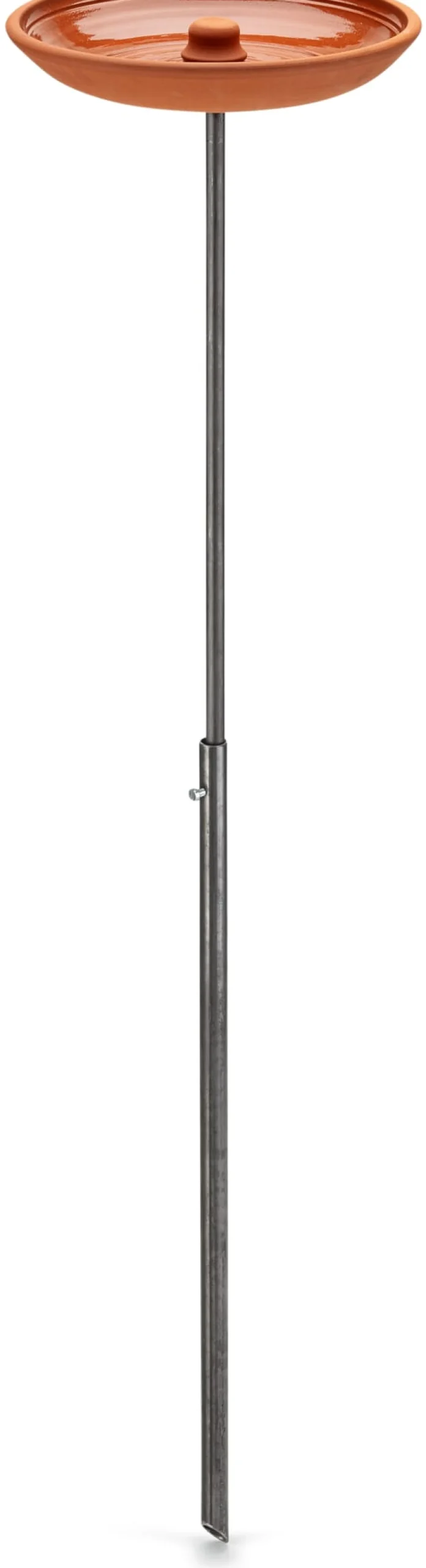 Schale aus Keramik, innen glasiert, Ø 28 cm, Höhe 5 cm, Gewicht 1,5 kg. Stab (Ø 14 mm) und Rohr (Ø 21,5 mm), zweiteilig, aus unbehandeltem Stahl, Gesamthöhe 1,36 m. Gesamtgewicht 2,9 kg. Form und Maße können leicht variieren.