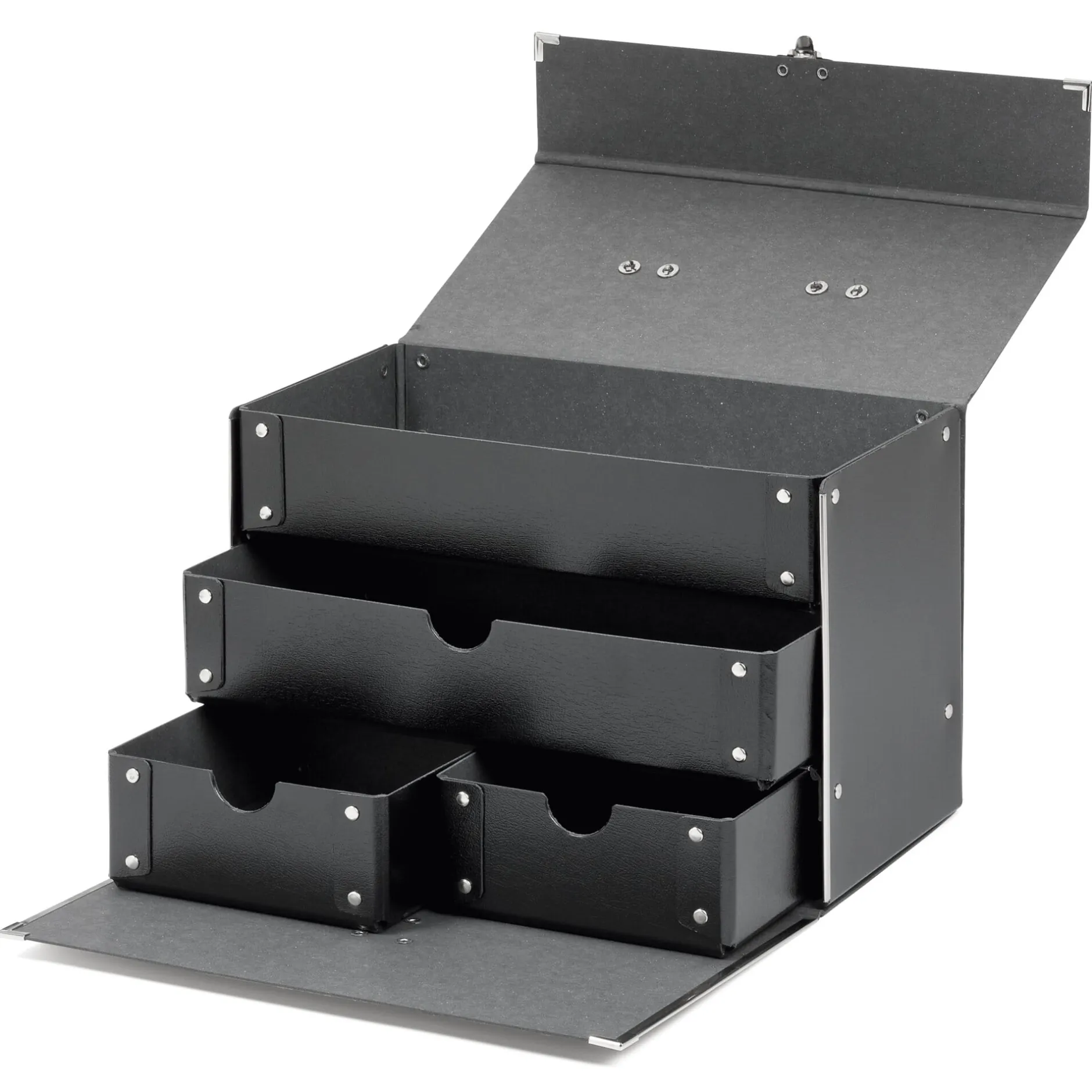 Ein festes Fach und 3 Schubfächer – in der Mitte eines in ganzer Breite, unten 2 mit halber Breite des Koffers – bieten Stauraum für allerlei Krimskrams.