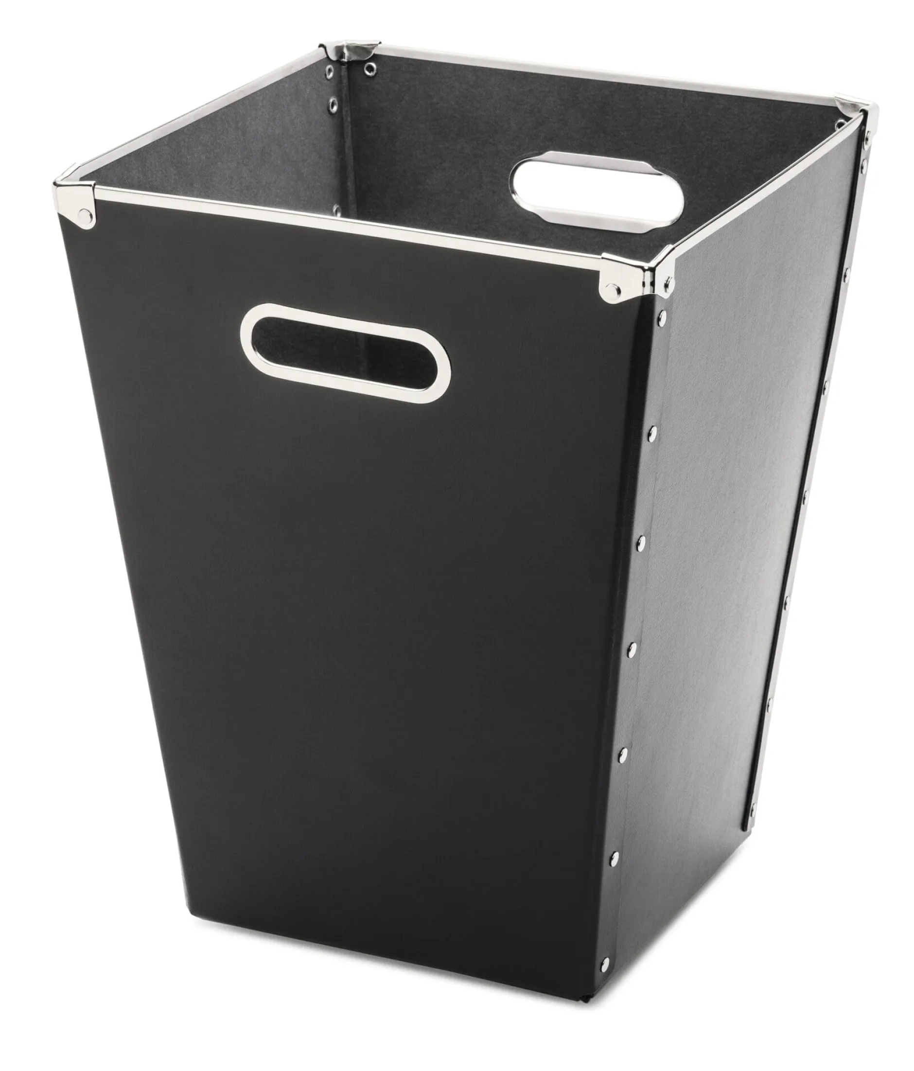 Aus mattlackierter, genieteter 1,4-mm-Pappe; offene Kanten und Ecken sowie die beiden Grifflöcher sind stahlblechverstärkt. Volumen 12 l. Höhe 32 cm, Breite 25 cm, Tiefe 25 cm. Gewicht 425 g.