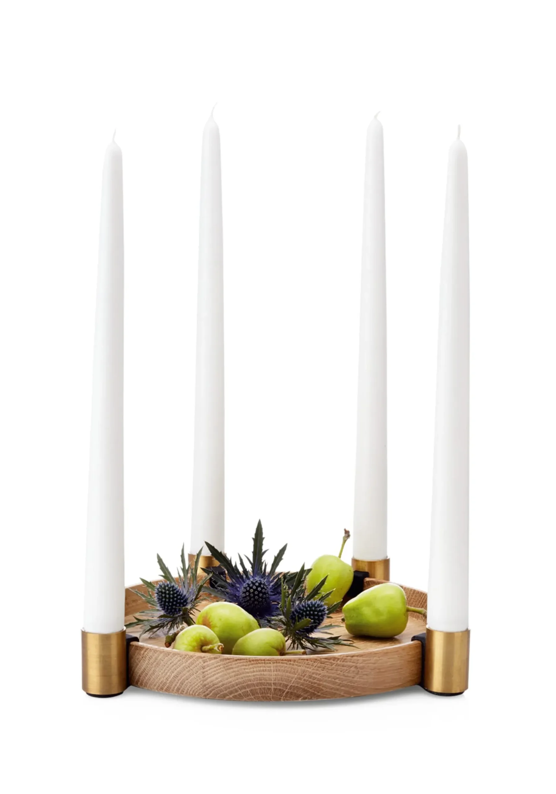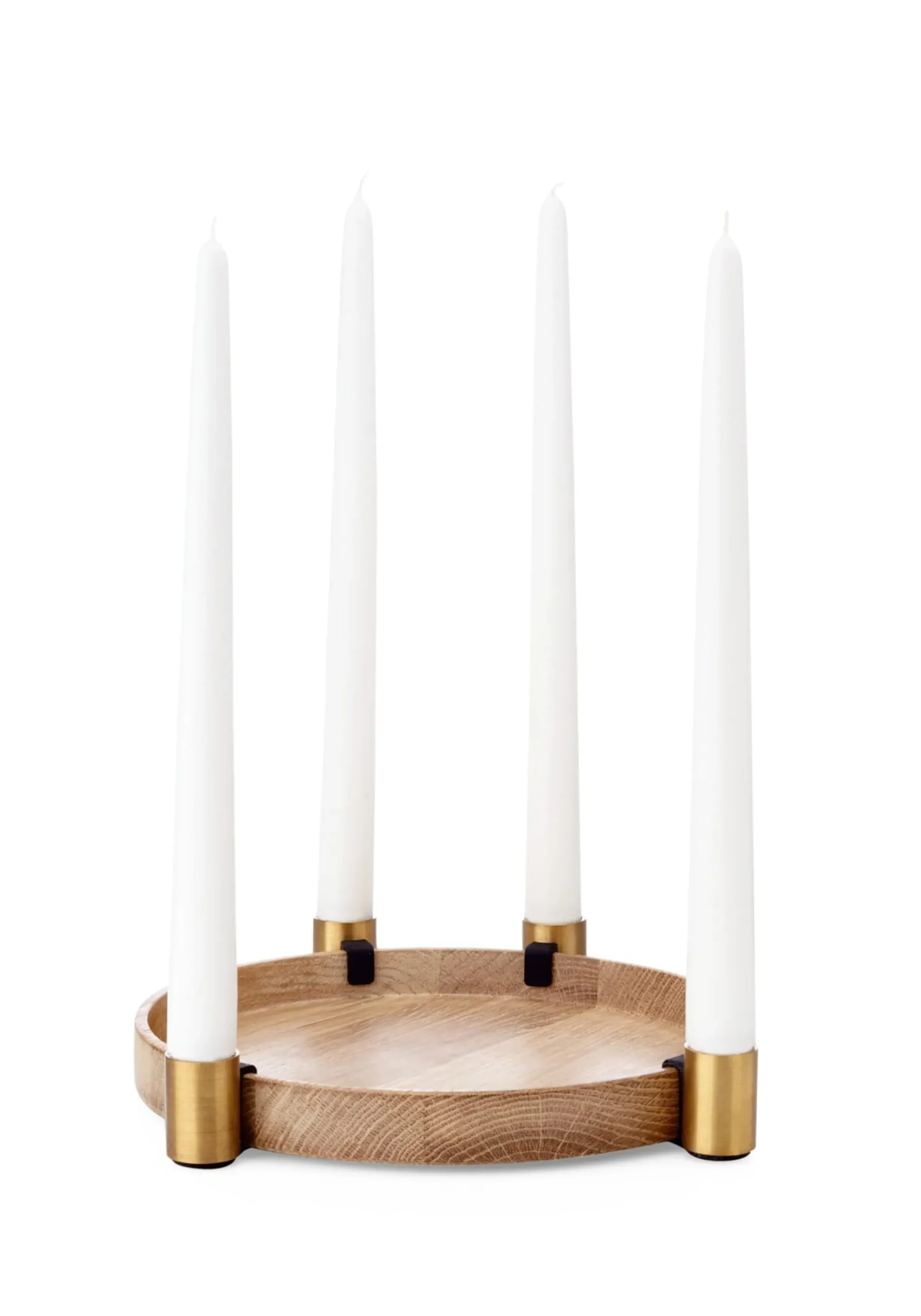 Ein hölzernes Tablett mit an beliebiger Stelle ergänzbaren Kerzenhaltern: LUNA ist somit rund ums Jahr nützliches Tischzeug und schmuckvolles Objekt. Die Kerzenhalter sind in Messing oder schwarzem Stahl lieferbar.