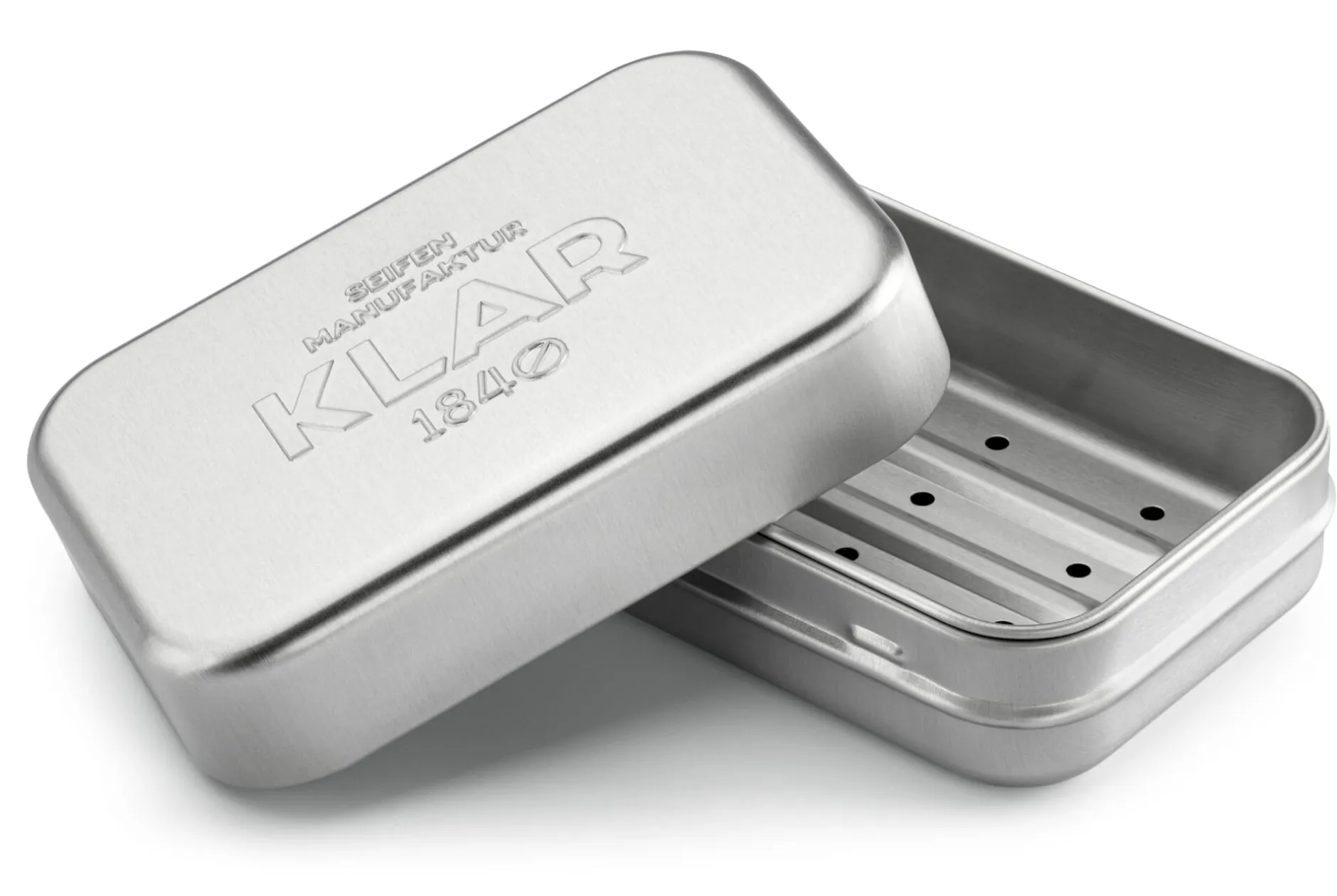 Diese Aluminiumdose ist ganz für die Maße der festen 100-Gramm-Seifen aus der Manufaktur Klar dimensioniert. So passen beispielsweise die Gewürzseifen, die Herren-, Damen- oder Kinder-Seife wie auch die Funktionsseifen perfekt hinein – und natürlich andere Seifen bis etwa 9,5 × 6 × 3 cm. Im Gegensatz zu anderen Seifendosen ist sie nicht nur aus Aluminium (statt Plastik) gefertigt, sondern beherbergt in ihrem Inneren auch ein herausnehmbares Abtropfgitter. Dieses können Sie unterwegs als Seifenschale nutzen, und wenn es am Morgen direkt mit der Reise weitergeht, sorgt es dafür, dass die Seife nicht in der Nässe liegt – vorausgesetzt, die Dose liegt nicht auf dem Kopf. Die Seifendose schließt dicht ab, sodass eventuelle Restfeuchtigkeit unterwegs nicht auslaufen kann.