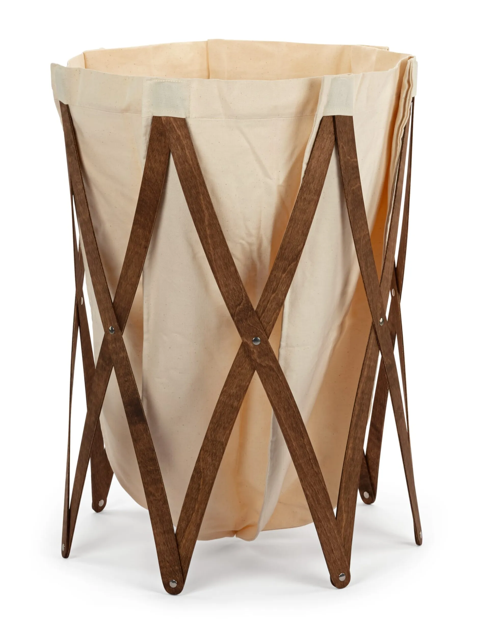 Gestell aus Sperrholz, Ø 15 bis max. 50 cm, Höhe 70 cm. Wäschebeutel aus 100% Baumwolle in Polen konfektioniert, Volumen ca. 130 l. Gewicht 1,5 kg. Hergestellt in Deutschland.