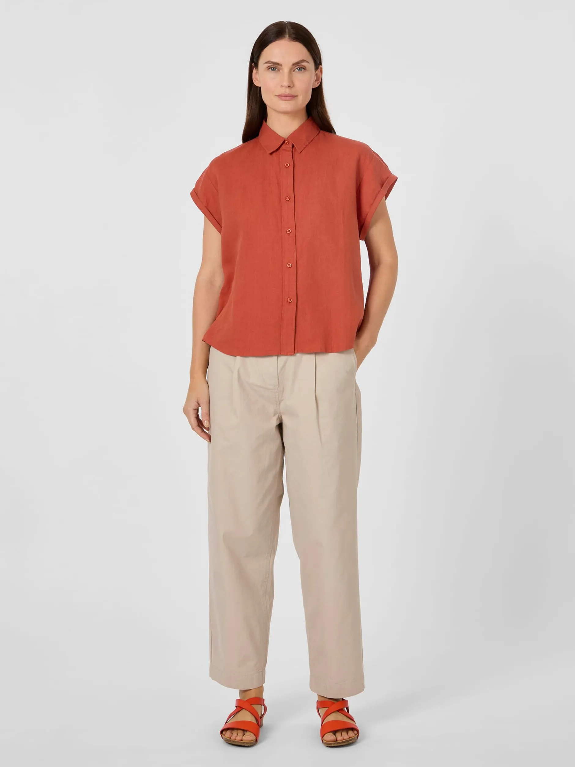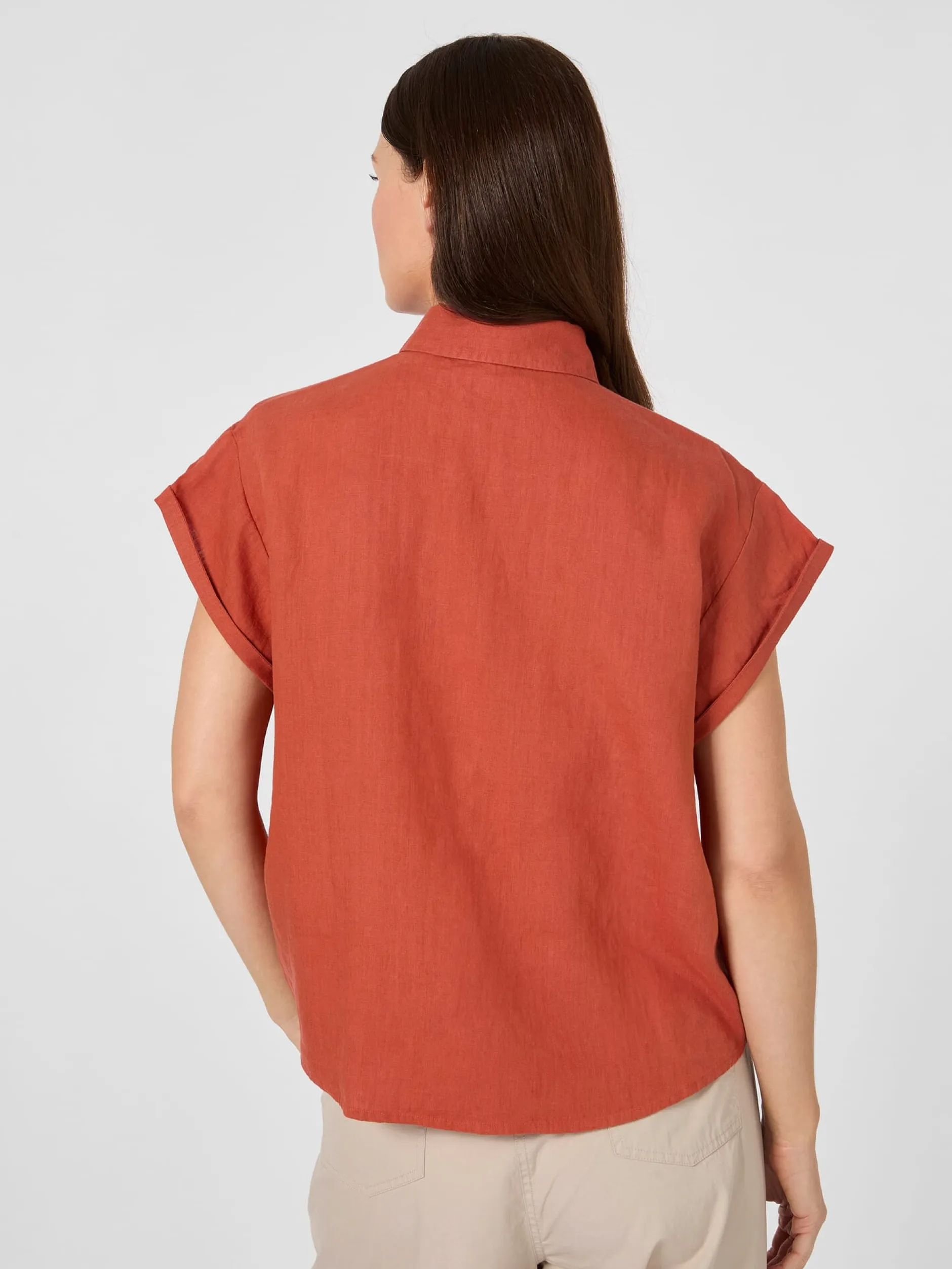 Leinen ist dank seiner kühlenden Trageeigenschaften das Material der Wahl für die warme Jahreszeit. Bei dieser gerade geschnittenen Bluse verwendet Knowledge Cotton Apparel Leinen aus kontrolliert biologischem Anbau. Gearbeitet ist sie mit überschnittenen Schultern, sehr kurzen Ärmeln mit Aufschlag und rundem Saum. Das Gewebe ist leicht und luftig und zeigt den materialtypischen Edelknitter.