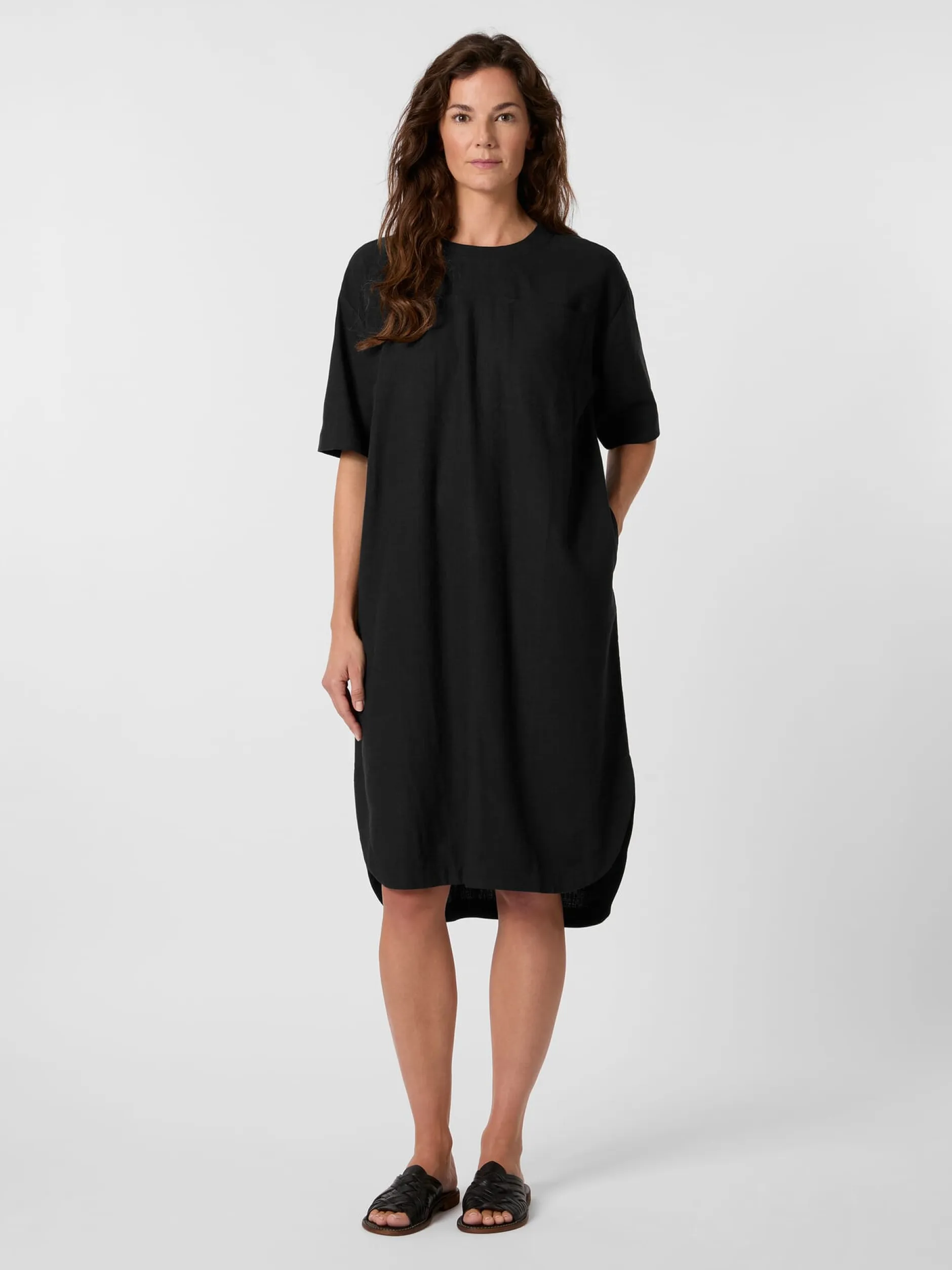 Dieses zeitlos schöne Sommerkleid besteht zu einem Gutteil aus Lyocell, einer Regeneratfaser, die aus Holz gewonnen wird. Dank dieser hautsympathischen und atmungsaktiven Faser liegt das Gewebe schmiegsam und angenehm luftig auf der Haut und hat einen schönen fließenden Fall. Der Leinen-Anteil begünstigt die atmungsaktiven Eigenschaften noch. Geschnitten ist das Kleid in lockerer, leicht ausgestellter Passform, die für viel Bewegungsfreiheit sorgt und die Figur weich umspielt. Es ist mit Rundhalsauschnitt, kurzen Ärmeln und eingesetzter Brusttasche ausgestattet und wird im Nacken mit Knopf und Schlaufe geschlossen. Der Saum ist hinten länger als vorn gearbeitet. Das Kleid wird von Knowledge Cotton Apparel exklusiv für uns produziert. In dieser Materialkombination und Farbe erhalten Sie es ausschließlich bei Manufactum.