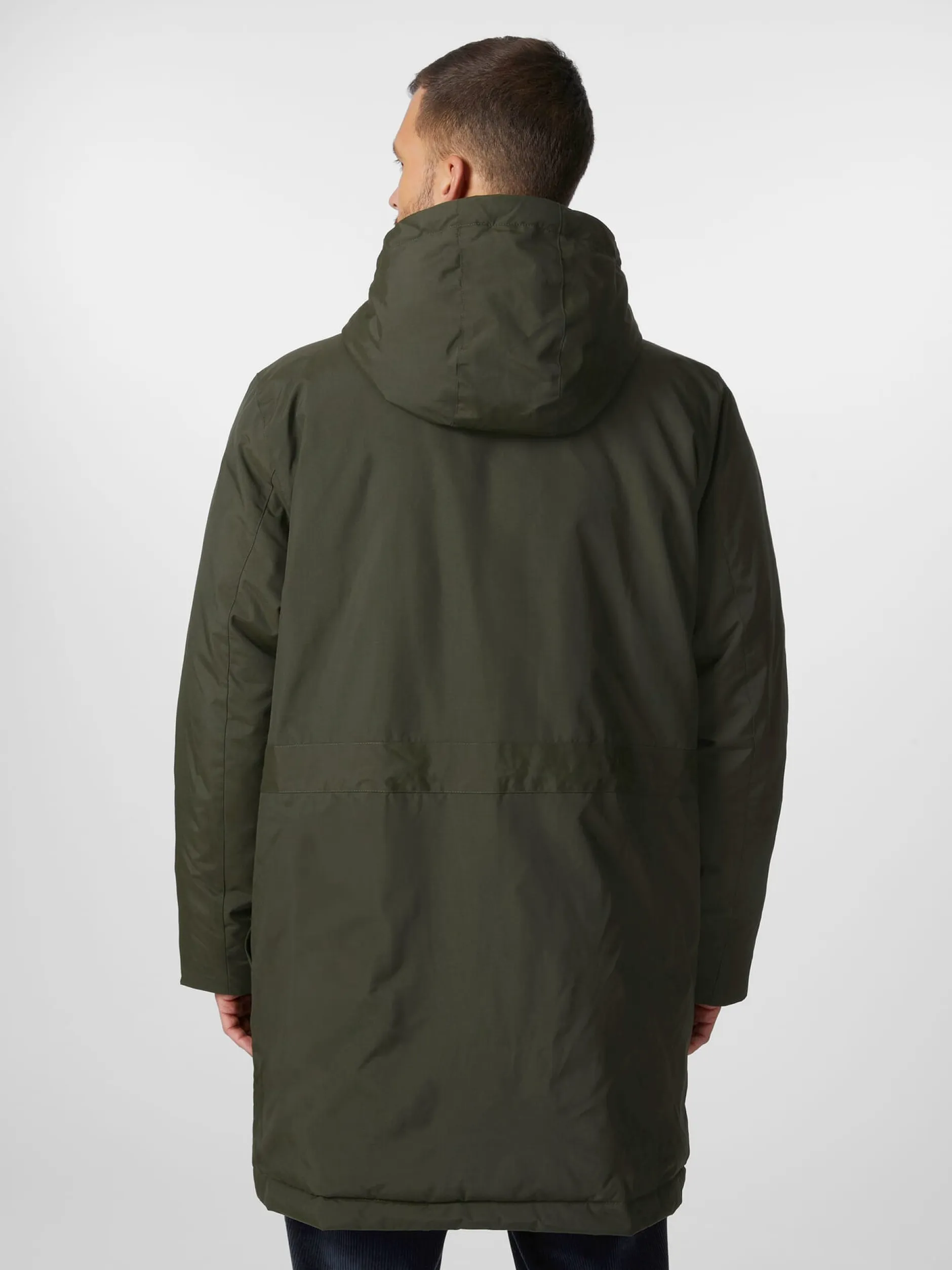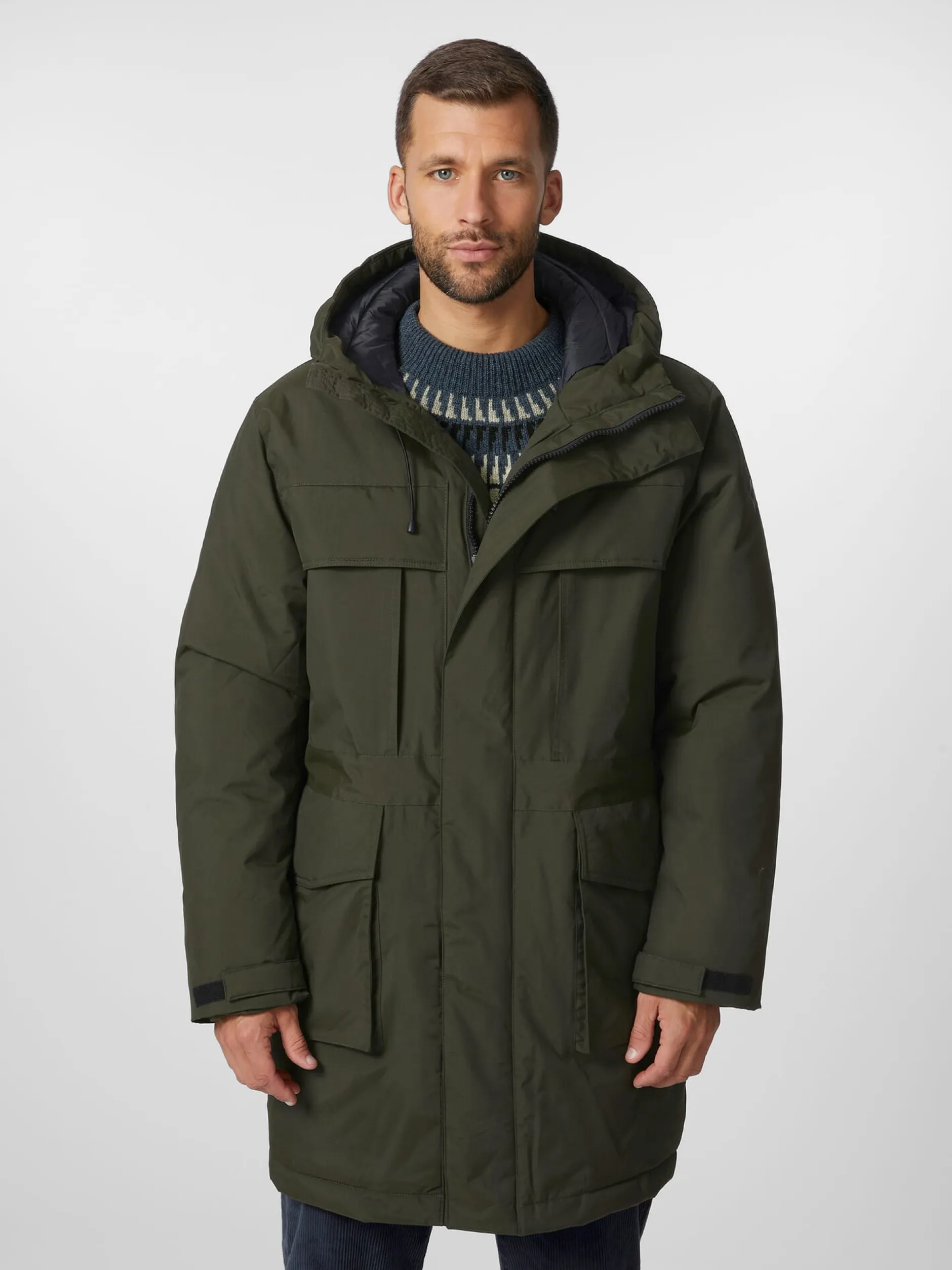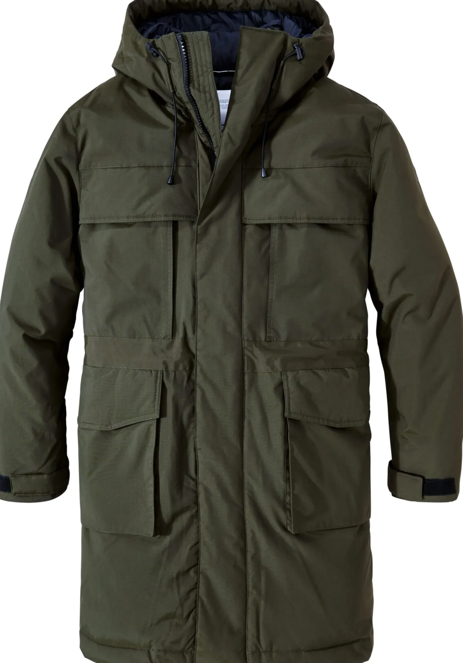 Oberstoff, Futter und Füllung dieses wärmenden Parkas stehen ganz im Zeichen von Recycling. Der Oberstoff ist ein sogenannter Apex Canvas™, der dicht gewebt, dabei atmungsaktiv, wind- und wasserabweisend ist. Er besteht ebenso wie das abgesteppte Futter aus Recycling-Polyamid, die wattige Sugenro®-Füllung ist aus Recycling-Polyester. Auch funktional überzeugt das durchdachte Stück: Der markante Zweiwegereißverschluss lässt sich hoch schließen. Über ihm liegt eine breite windabweisende Blende mit verdeckten Magnetknöpfen. Gut anliegende Strickbündchen in den Ärmelöffnungen halten wirksam Wind und Kälte ab, die Weite der Ärmelöffnungen lässt sich zusätzlich über verstellbare Riegel mit Klettverschluss anpassen. Eine innenliegende Gummikordel mit Kordelstoppern auf Taillenhöhe erlaubt eine Weitenanpassung, die Öffnung der Kapuze lässt sich ebenfalls mittels Gummikordel im Tunnelzug und Kordelstoppern regulieren. Etliche Taschen bieten Platz für Kleinteile des täglichen Bedarfs: Außen befinden sich zwei große aufgesetzte Pattentaschen mit verdeckten Magnetknöpfen, zwei schräge Eingrifftaschen sowie zwei eingesetzte Brusttaschen mit senkrechtem, verdecktem Reißverschluss. Innen kommen noch zwei Taschen mit senkrechtem, nahtverdecktem Reißverschluss sowie eine aufgesetzte Tasche mit Patte und Klettverschluss hinzu.