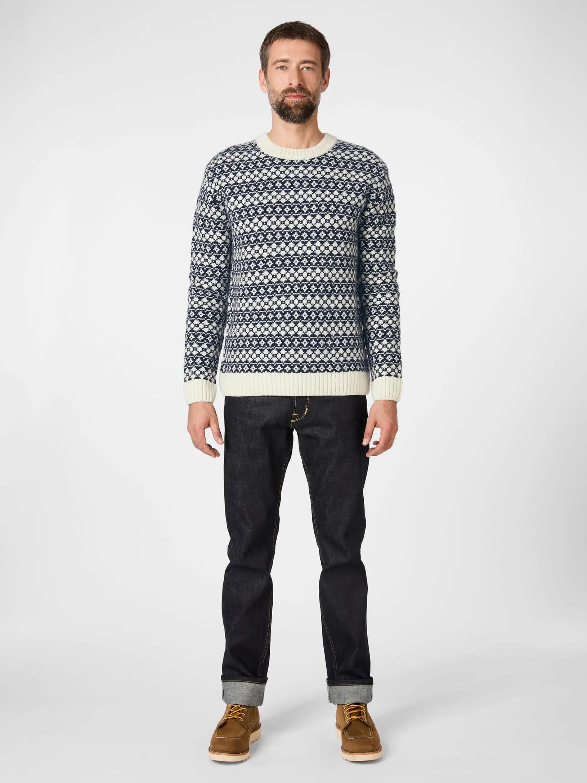 Dieser glattgestrickte Pullovers zeigt ein markantes, komplexes Muster aus geometrischen Formen, das den berühmten Fair-Isle-Mustern nicht unähnlich ist. Im Griff ist der Pullover wärmend und hautsympathisch, da Knowledge Cotton Apparel hier auf weiche Lammwolle aus kontrolliert biologischer Tierhaltung zurückgreift. Kontrastierende breite Rippenstrickbündchen bilden den Abschluss an Hals, Ärmeln und Rumpf.