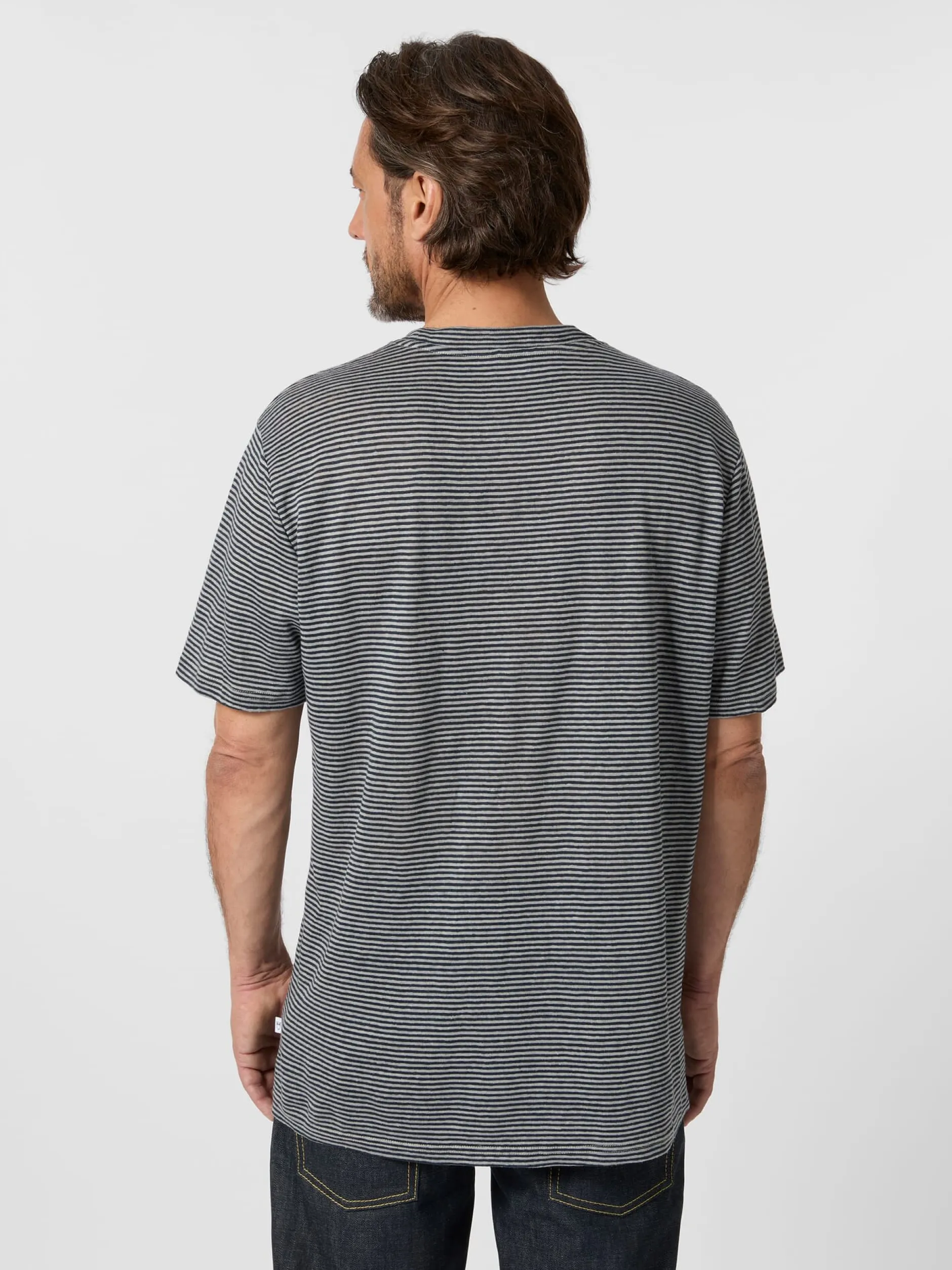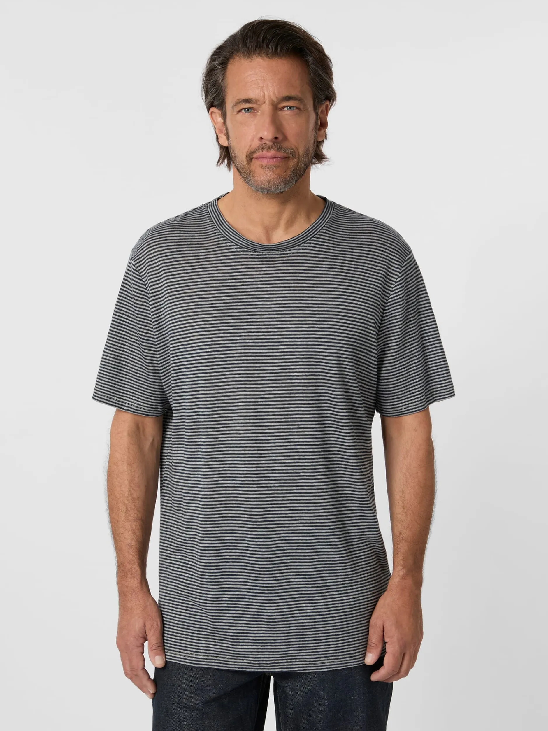 Leichtes, locker fallendes Shirt aus reinem Leinen. Es ist in klassischer T-Shirt-Form geschnitten und zeigt ein feines Ringelmuster. An den Abschlüssen von Ärmeln und Rumpf ist der Stoff umgelegt und mit Flatlocknähten fixiert, der Rundhalsausschnitt schließt mit einer umlaufenden gestreiften Blende. Die Flachsfasern für den Stoff stammen aus kontrolliert biologischem Anbau.