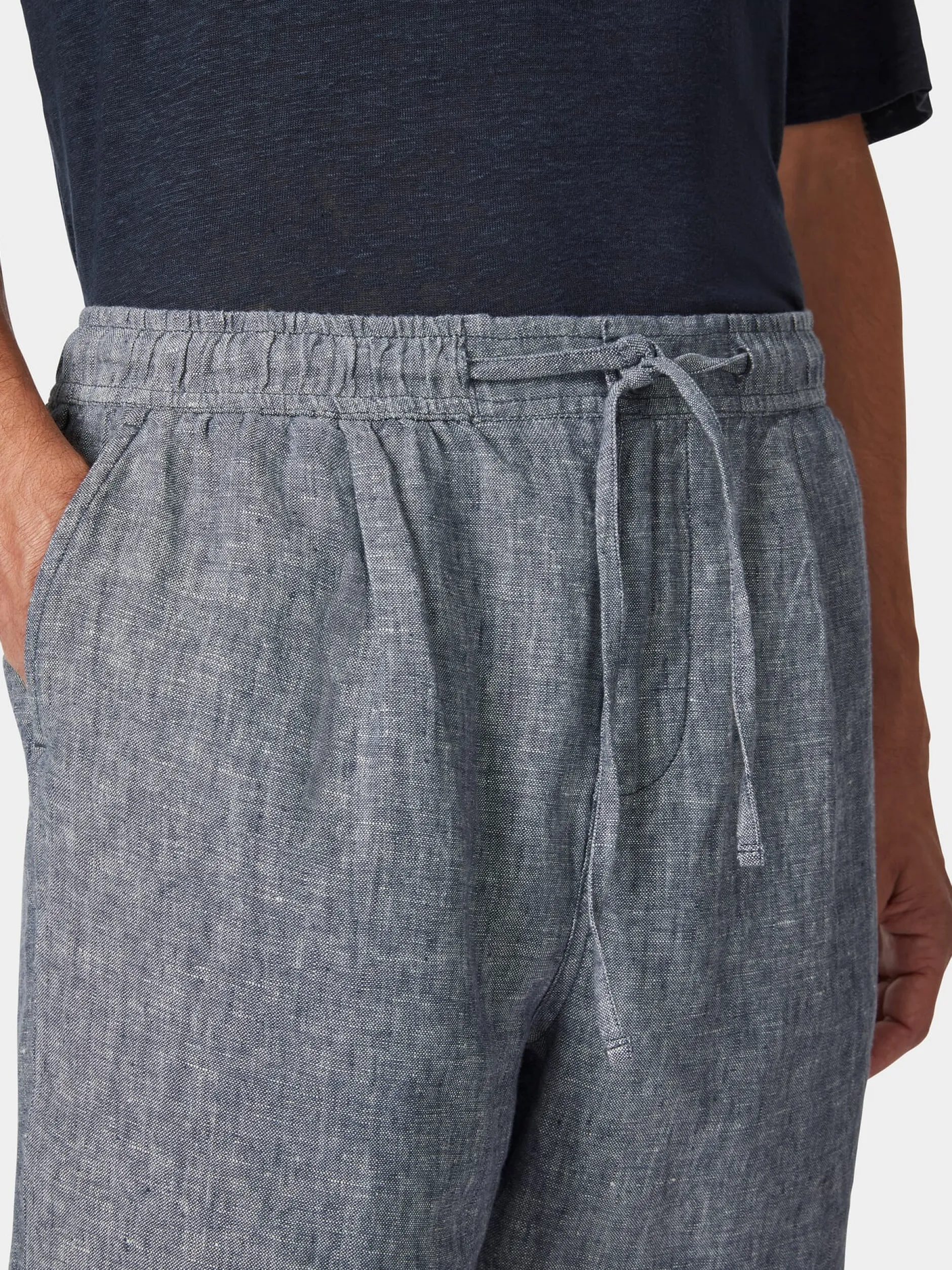 100% Leinen. Reißverschluss und Knopf aus Kunststoff. Tunnelzug mit Bindeband und Gummi im Bund. Hergestellt in Indien. Innenbeinlänge bei Größe L = 22 cm.