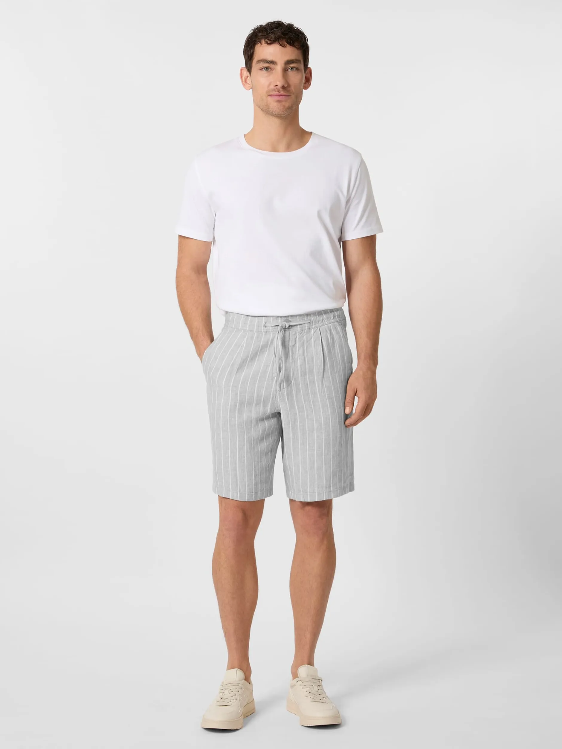Lässige Shorts, deren gestreifter Stoff aus strapazierbarem, kühlendem Leinen besteht. Das Gewebe zeigt neben den Streifen die leinentypischem Fadenverdickungen und einen schönen Melangeeffekt. Die Shorts wird wird mittels Reißverschluss und Knopf geschlossen, ein Gummibund mit Bindeband im Tunnelzug erhöht den Tragekomfort. Je zwei Seitentaschen und eingesetzte Gesäßtaschen nehmen Kleinteile des täglichen Bedarfs auf. Die Flachsfasern für den Stoff stammen aus kontrolliert biologischem Anbau