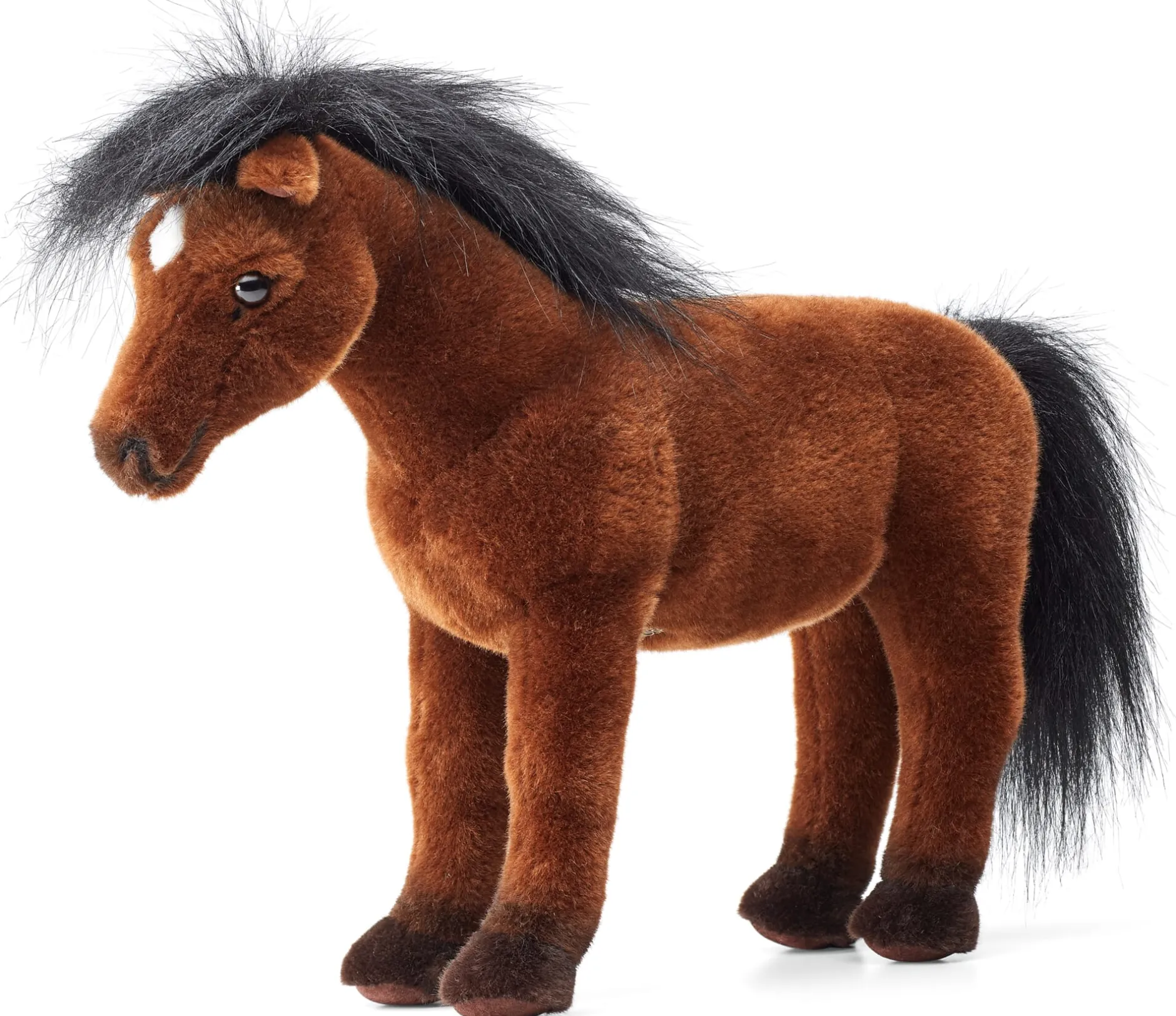 Fell Webplüsch, Mähne Langhaarwebplüsch. Hufe aus Kunstleder. Hergestellt in Deutschland. Länge 38 cm, Breite 12 cm, Höhe 28 cm. Gewicht 410 g.