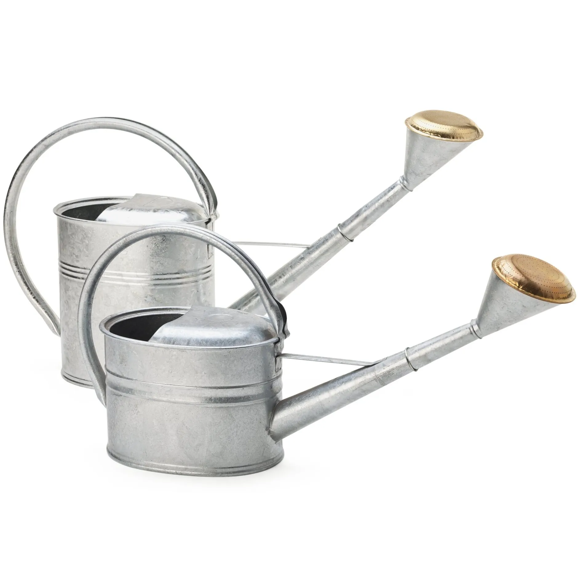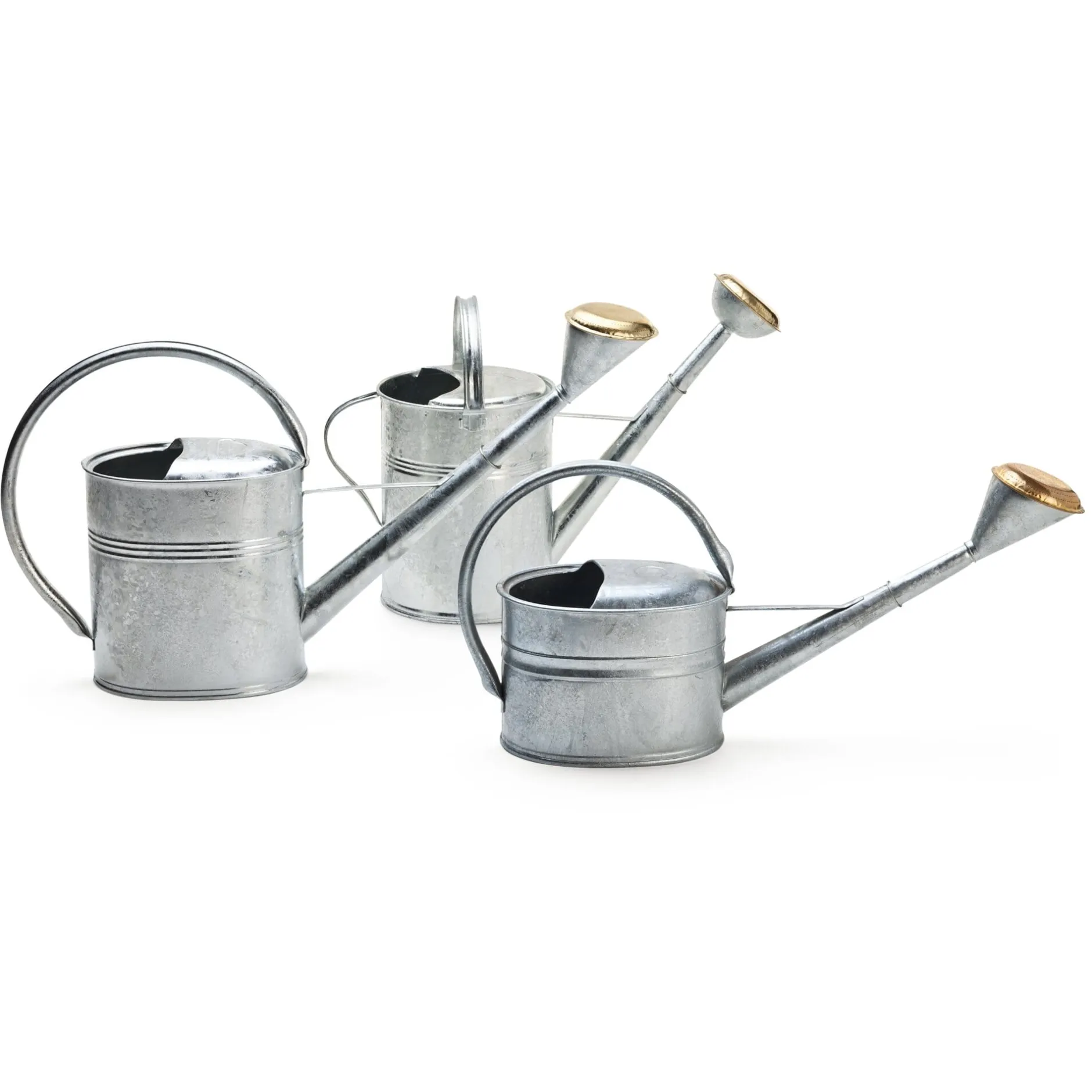 Drei Gießkannen aus feuerverzinktem, 0,5 mm starkem Stahlblech. Im Tauchbad erhalten sie eine dicke Zinkschicht, die sie dauerhaft vor äußeren Einwirkungen schützt. Bei allen Kannen ist die abnehmbare Brause aus Messing und mit einem umlaufenden Gummiring (UV-stabil und frostbeständig) zur Dichtung ausgestattet, der sich bei Bedarf ebenfalls abnehmen lässt.