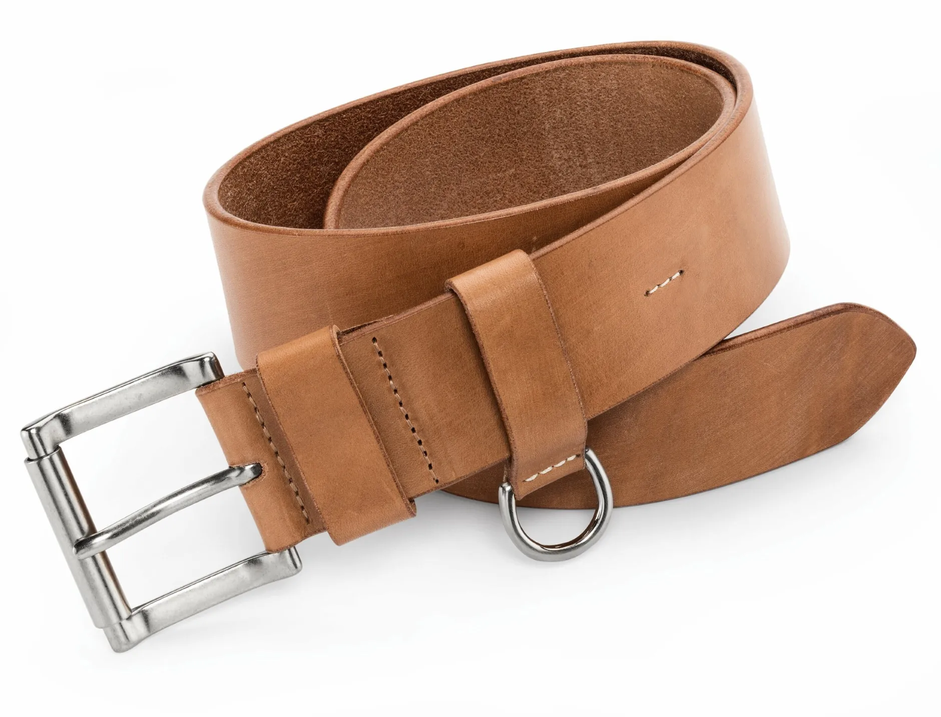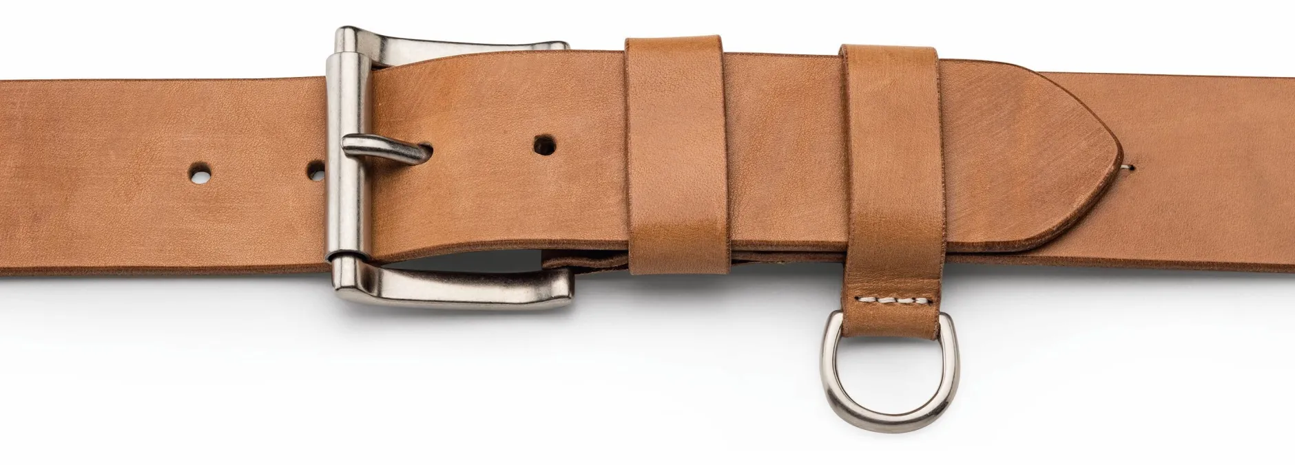 Das Rindleder für diesen Gürtel stammt aus dem Rückenbereich der Tiere (den sogenannten Croupons, dem wertvollsten und besten Teil). Es wird in einer deutschen Gerberei über wenigstens zwei Monate pflanzlich gegerbt und anschließend anilingefärbt und mit Bienenwachs behandelt. Die Rollschließe und der D-Ring werden in einem italienischen Familienbetrieb aus Messing gegossen und galvanisch versilbert. In der Ledermanufaktur Kreis in Offenbach werden nach dem Lederzuschnitt die Kanten gefräst, in mehreren Durchgängen geschliffen, in Lederfarbe gebeizt und anschließend mit Hartwachs poliert. Diese traditionelle Arbeitsweise ist aufwendig, dafür industrieller Beschichtung weit überlegen – und diese echte Sattlerkante kann bei Bedarf einfach mit farbloser Schuhcreme poliert werden.
