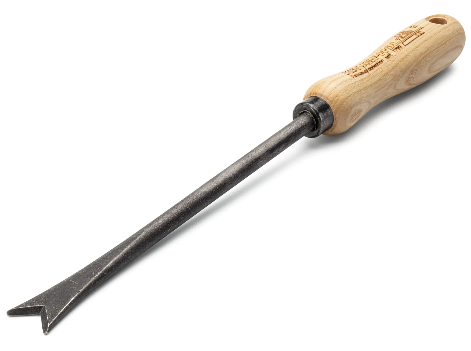 Werkzeugkopf mit eingekerbtem Blatt und geschärften Kanten aus Mangan-Bor-Stahl (L 22 × B 2,5 cm). Griff Eschenholz lackiert. Gesamtlänge 36 cm. Gewicht 220 g.