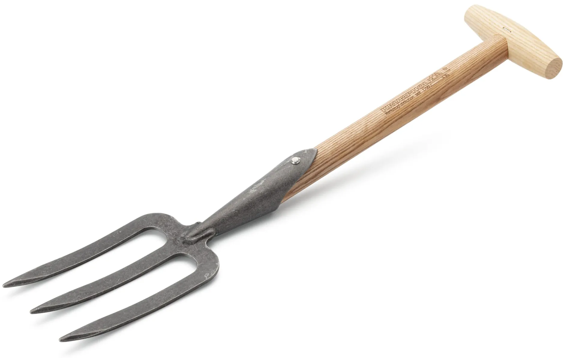 Sie ist das ideale Gartengerät für alle Arbeiten in kniender Haltung und in engen, dicht bepflanzten Beeten, in denen vorsichtig um flach wachsende Wurzeln herum gejätet und gelockert werden muss. Der Form nach schlägt die Staudengabel mit ihren urtümlichen geschmiedeten Zinken aus Mangan-Bor-Stahl eine Brücke zwischen Spaten und Blumenkelle, sie kann daher auch beim Umpflanzen von Stauden oder Ausstechen von Wurzeln eine gute Hilfe sein. Bestens eignet sie sich auch zum Auflockern des Bodens oder Vorbereiten von Pflanzlöchern in schon bepflanzten Beeten. Bei all diesen Tätigkeiten ermöglichen das geringe Gewicht und der Aufbau des Werkzeugs mit dem verkürzten Stiel und dem gerade angesetzten Funktionsteil ein handgelenkschonendes Arbeiten.