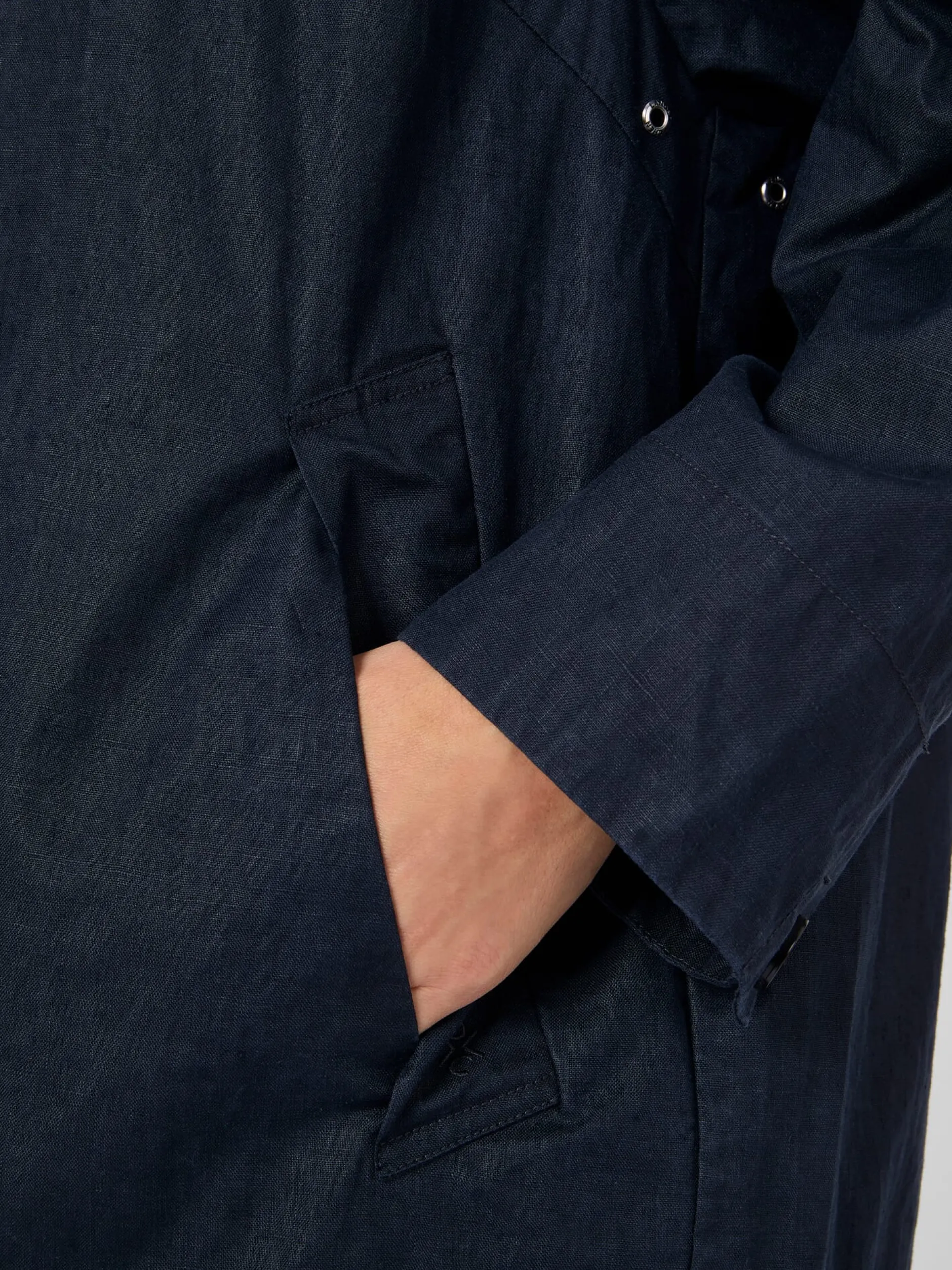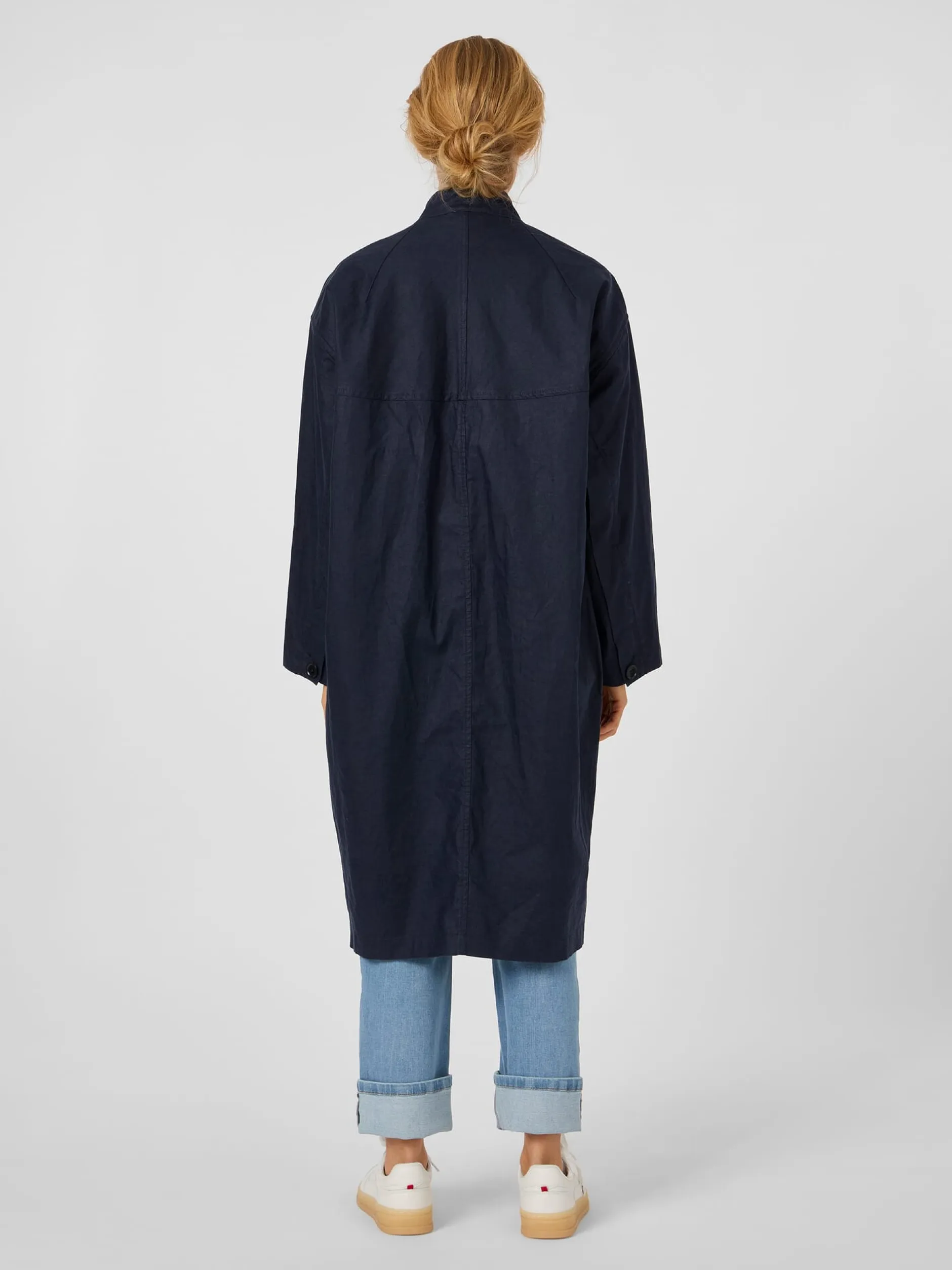 Den Oberstoff dieses bequemen Mantels fertigt LangerChen aus reinem, kontrolliert biologisch angebautem Leinen. Das hautsympathische Gewebe ist leicht und atmungsaktiv und zeigt die materialtypischen Fadenverdickungen. Noch dazu ist es dank der PFC-freien Polyurethan-Beschichtung auf der Innenseite winddicht und wasserabweisend. So ist der Mantel ein idealer Begleiter für die Übergangszeit, der mit seiner legeren Passform mit überschnittenen Schultern viel Bewegungsfreiheit bietet. Lüftungsösen unter den Achseln erhöhen den Tragekomfort noch. Ausgestattet ist der ungefütterte Mantel mit Stehkragen, durchgehender Knopfleiste und knöpfbaren Ärmelabschlüssen. Eine Längsteilungsnaht im Rücken verschlankt die Silhouette optisch. Zwei schräg eingesetzte Schubtaschen und eine Innentasche mit Reißverschluss nehmen Kleinteile des täglichen Bedarfs auf.