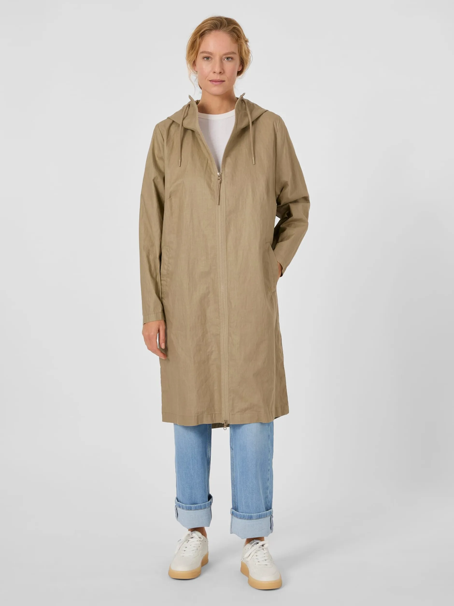 Der Oberstoff dieses Mantels besteht vollständig aus kontrolliert biologisch angebautem Leinen. Das Gewebe ist angenehm leicht und zeigt einen schönen Melangeton. Innen ist das Material mit einer PFC-freien Polyurethan-Beschichtung versehen, was das Manteltuch wind- und wasserabweisend macht. Die geräumige Kapuze ist mittels Tunnelzug in der Weite anpassbar und bietet so einen zusätzlichen Schutz vor unbeständigem Wetter. Der Zweiwegereißverschluss lässt sich hoch bis zum Kinn schließen und die Ärmelabschlüsse können dank eines Druckknopfs weit oder eng anliegend getragen werden. Zwei Seitentaschen mit Druckknöpfen und eine Innentasche mit Reißverschluss nehmen Kleinteile des täglichen Bedarfs auf. Die legere Passform sorgt zusammen mit den langen Seitenschlitzen, die mit Druckknöpfen zu schließen sind, für viel Bewegungsfreiheit. Belüftungsösen unter den Achseln erhöhen den Tragekomfort. Damit ist der Mantel nicht nur alltagstauglich, sondern auch gut für sportliche Aktivitäten wie Wandern oder Fahrradfahren geeignet.