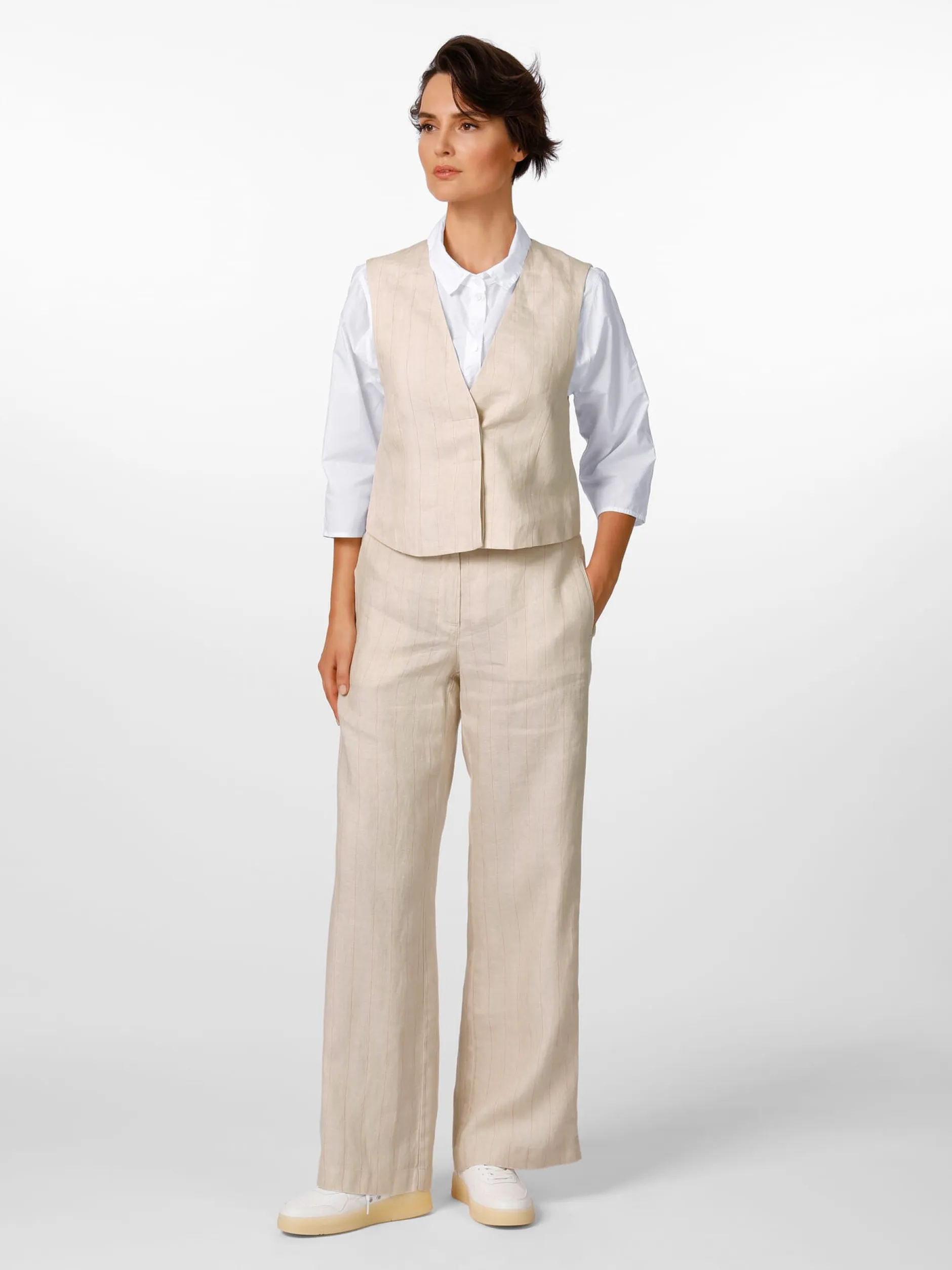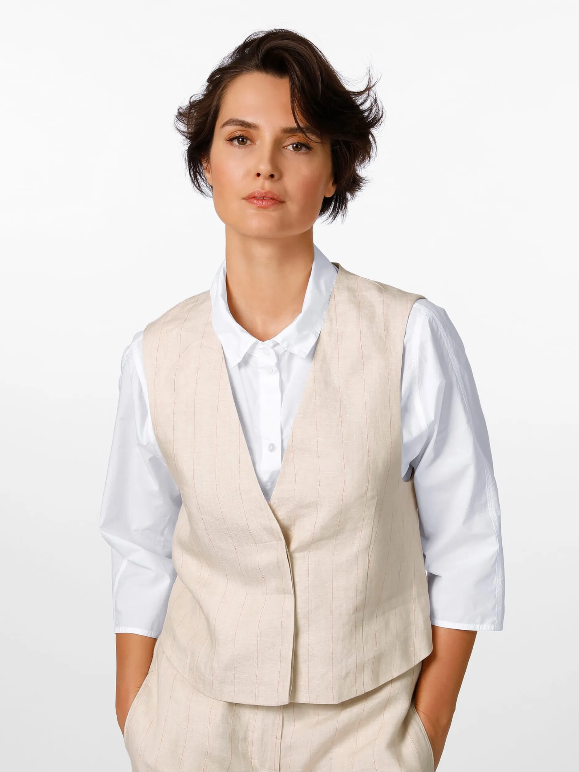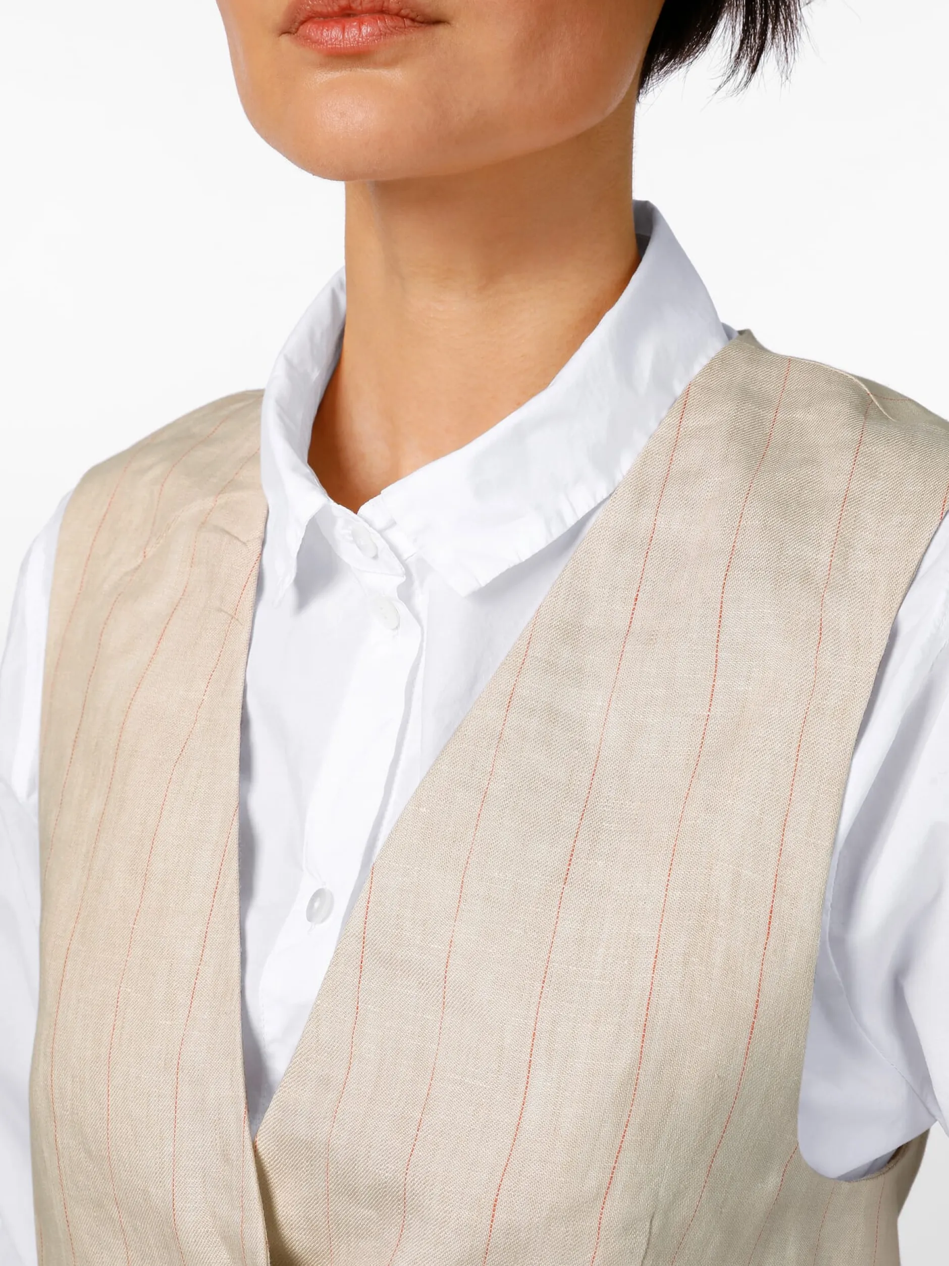 Früher gehörte zur Weste auch zwingend der passende Anzug, heute ist sie ein vollwertiges Kleidungsstück, das vielfältig kombiniert werden kann – mit Shirt oder Bluse, mit Stoffhose oder Jeans. Der Oberstoff dieser verdeckt geknöpften Weste besteht aus reinem Leinen. Dieser wird sowohl für die Front als auch für den Rücken verwendet. Leinen verfügt über herausragende feuchtigkeitsregulierende Eigenschaften und ist daher das Material der Wahl für die warme Jahreszeit. Das leichte Gewebe zeigt neben einem markanten Nadelstreifen die leinentypisch leicht unregelmäßige Struktur. Die Weste ist in lockerer Passform mit tiefem Armloch gearbeitet, was für einen komfortablen Sitz sorgt und ein bequemes An- und Ausziehen ermöglicht. Das Futter ist aus hautsympathischer Baumwolle gefertigt.