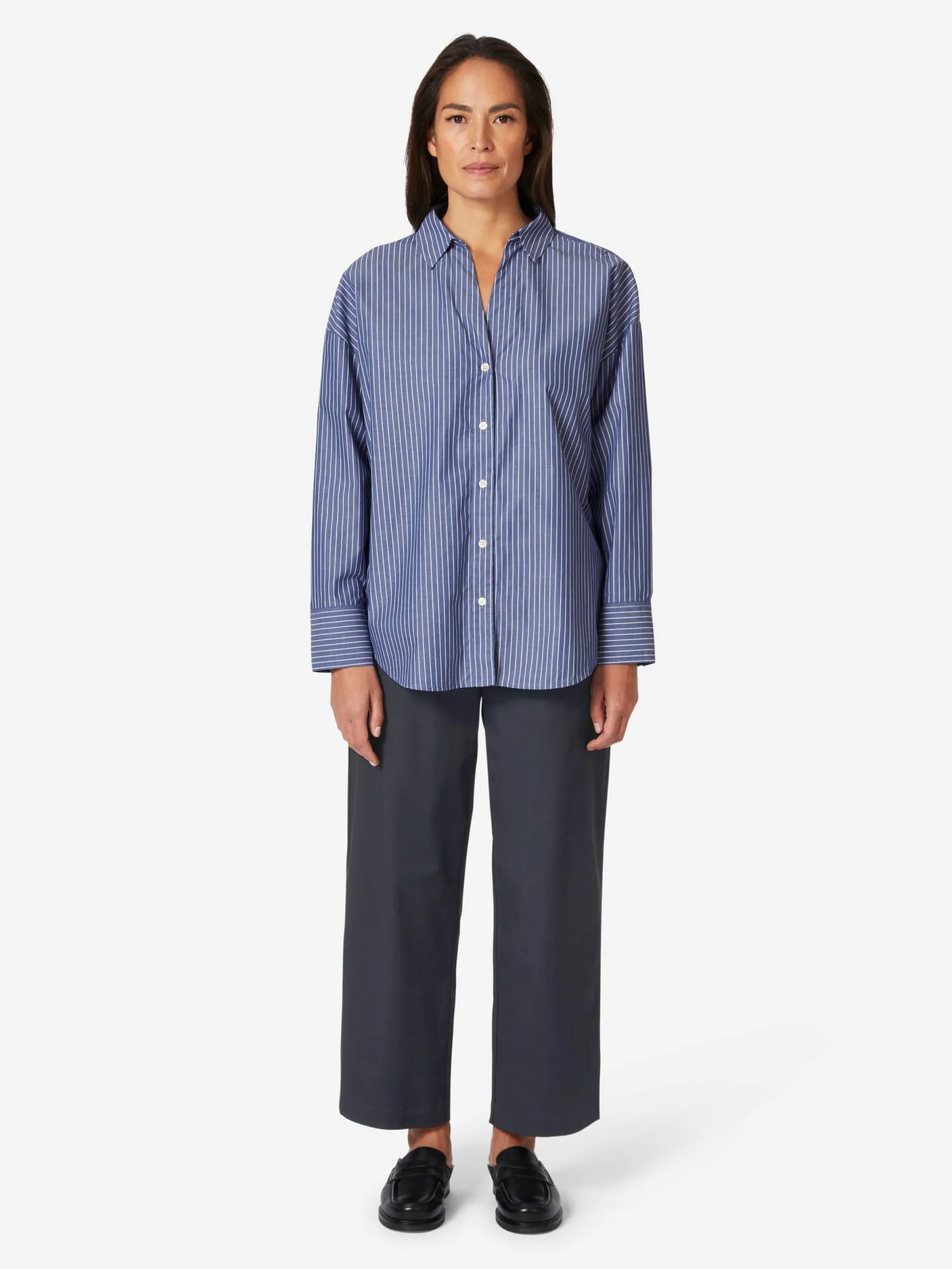Sommerlich-leicht ist diese Bluse und die markanten Nadelstreifen verleihen ihr einen eleganten Look. Lanius fertigt sie aus einem hautsympathischen, angenehm glatt auf der Haut liegendem Chambray. Die verwendete Baumwolle stammt aus kontrolliert biologischem Anbau. Bei Chambray handelt es sich um einen dicht gewebten Stoff, bei dem Kett- und Schussfaden verschiedenfarbig sind, was ihm den charakteristischen Melangeeffekt verleiht. Überdies ist Chambray besonders atmungsaktiv und damit ideal für die warme Jahreszeit. Dank ihrer lockeren Passform mit überschnittenen Schultern und knopflos gearbeitetem Hemdkragen sitzt die Bluse ausgesprochen lässig und bequem. Eine Quetschfalte unter der hinteren Schulterpasse sorgt für noch mehr Bewegungsfreiheit. Die Ärmelmanschetten sind dreifach geknöpft, der Saum ist stark gerundet.