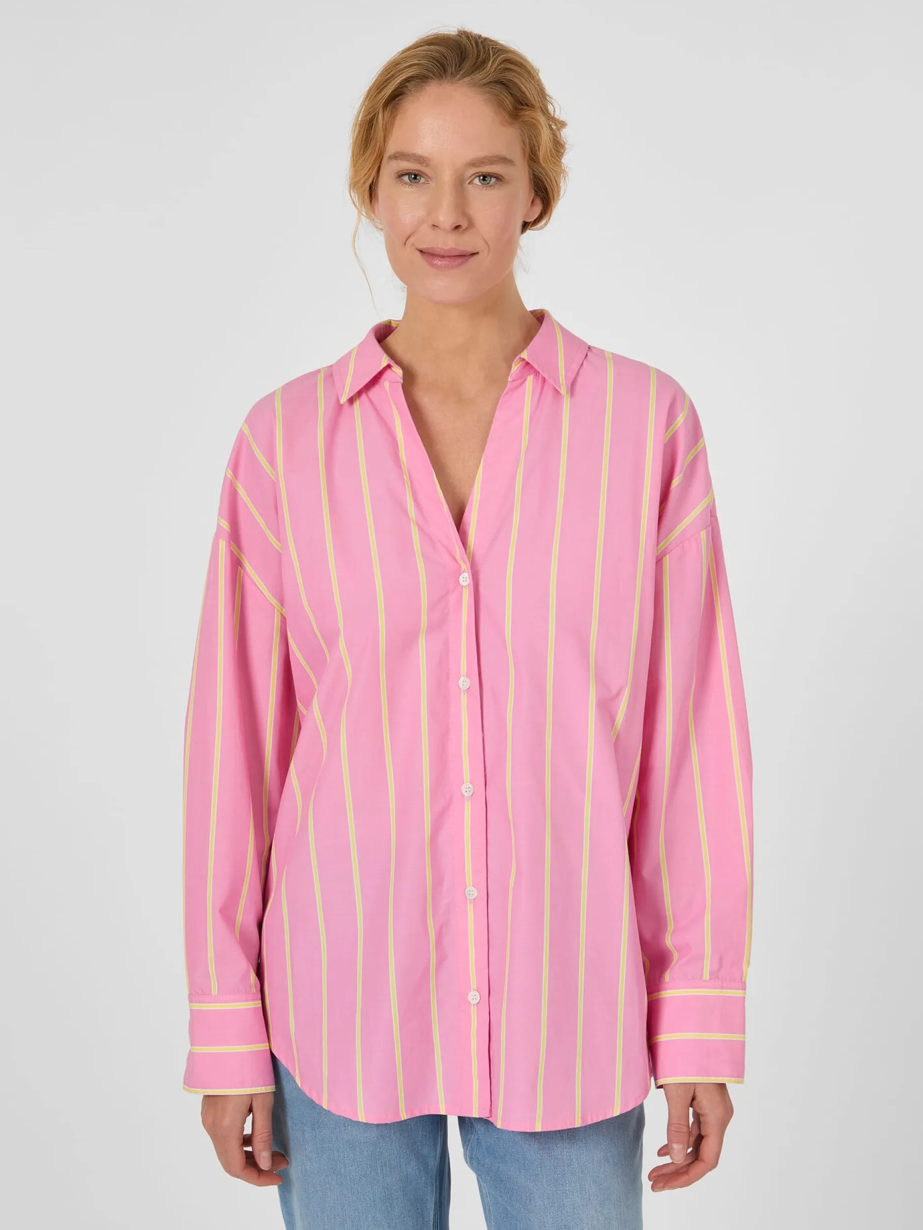 Sommerlich-leicht ist diese Bluse und die markanten Nadelstreifen verleihen ihr einen eleganten Look. Lanius fertigt sie aus einem hautsympathischen, angenehm glatt auf der Haut liegendem Chambray. Die verwendete Baumwolle stammt aus kontrolliert biologischem Anbau. Bei Chambray handelt es sich um einen dicht gewebten Stoff, bei dem Kett- und Schussfaden verschiedenfarbig sind, was ihm den charakteristischen Melangeeffekt verleiht. Überdies ist Chambray besonders atmungsaktiv und damit ideal für die warme Jahreszeit. Dank ihrer lockeren Passform mit überschnittenen Schultern und knopflos gearbeitetem Hemdkragen sitzt die Bluse ausgesprochen lässig und bequem. Eine Quetschfalte unter der hinteren Schulterpasse sorgt für noch mehr Bewegungsfreiheit. Die Ärmelmanschetten sind dreifach geknöpft, der Saum ist stark gerundet.