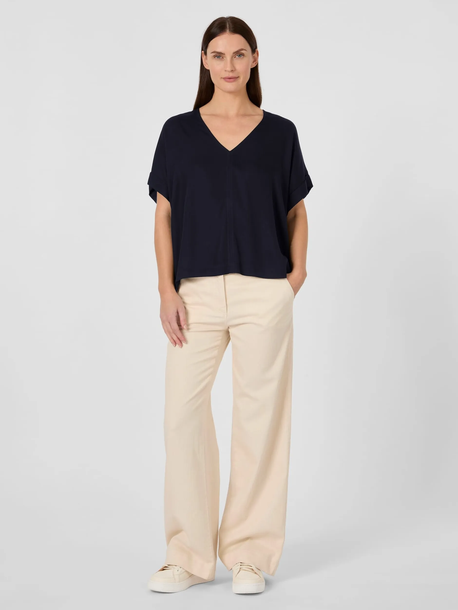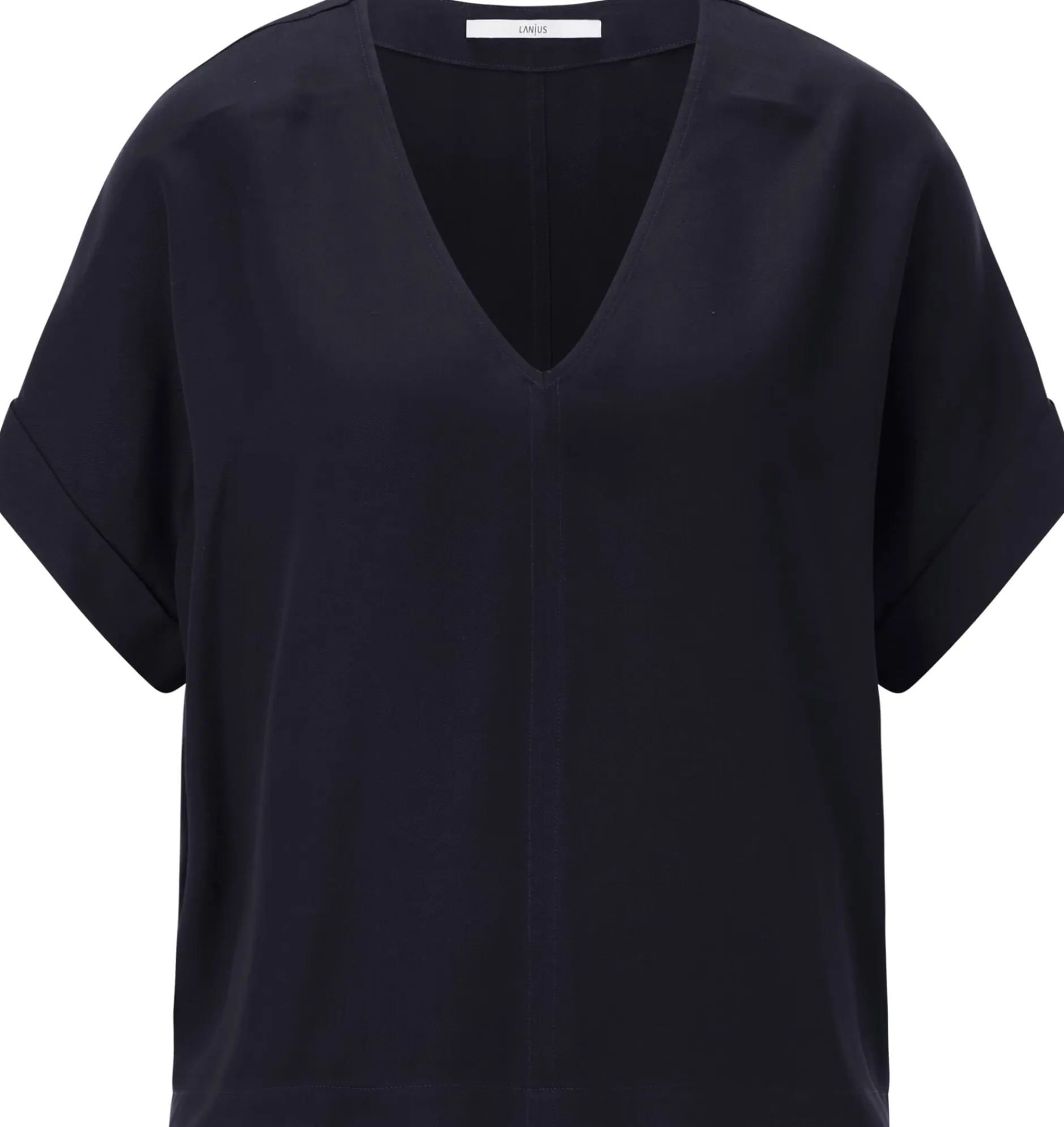 Mit seiner zart glänzenden Oberfläche mit leicht changierender Optik und seiner weichen Haptik wirkt der Stoff dieser Bluse fast wie Seide. Er besteht jedoch aus reinem Lyocell (TENCEL™), einer regenerativen Zellulosefaser, die aus Holz gewonnen wird, das aus kontrollierten Quellen stammt. Das hautsympathische und atmungsaktive Gewebe liegt angenehm glatt und schmiegsam auf der Haut und hat einen schönen, weich fließenden Fall. Gearbeitet ist die Bluse in lockerer, figurumspielender Passform mit überschnittenen Schultern, tiefem V-Ausschnitt und kurzen Ärmeln mit Aufschlag. Längsteilungsnähte vorn und hinten verschlanken die Silhouette.