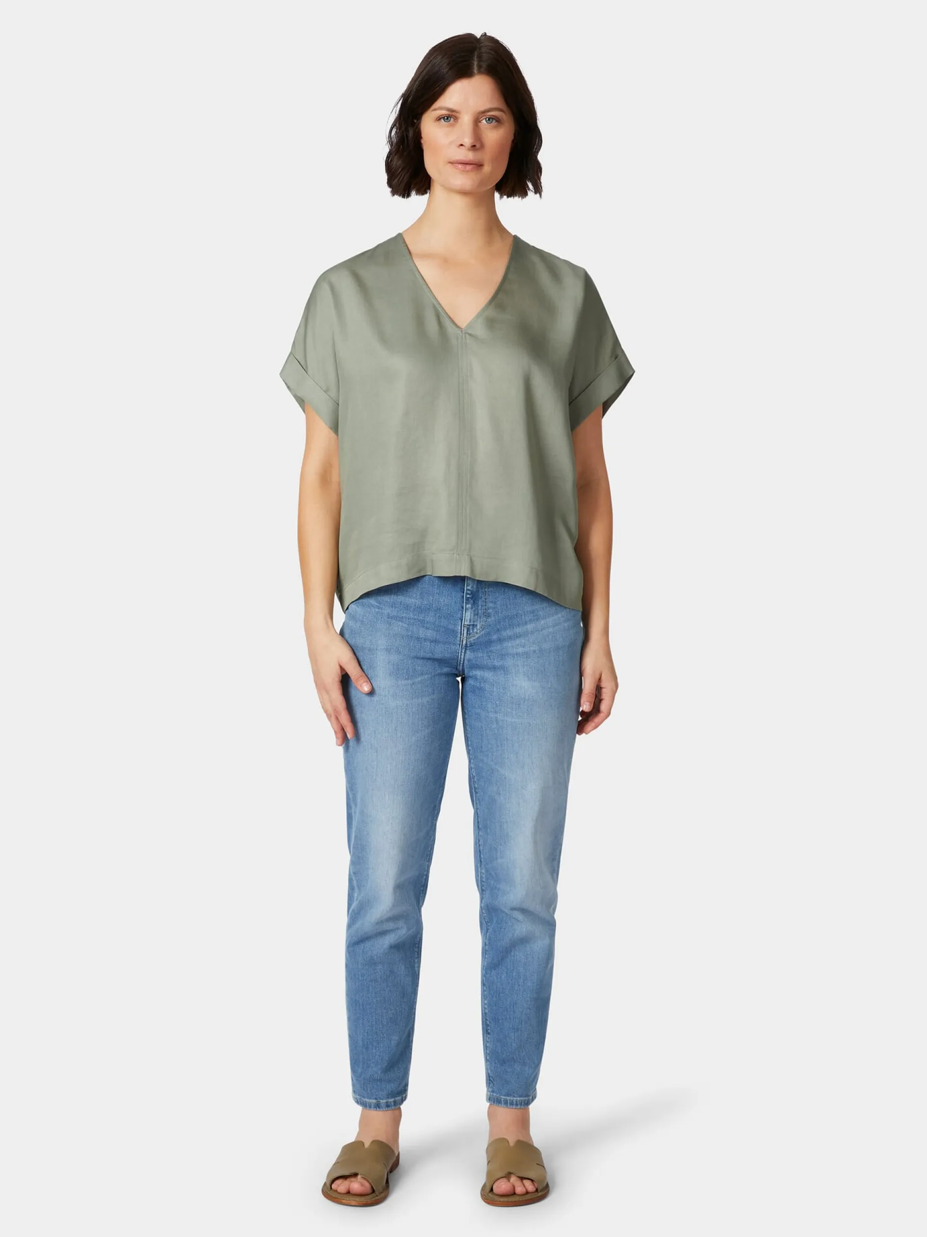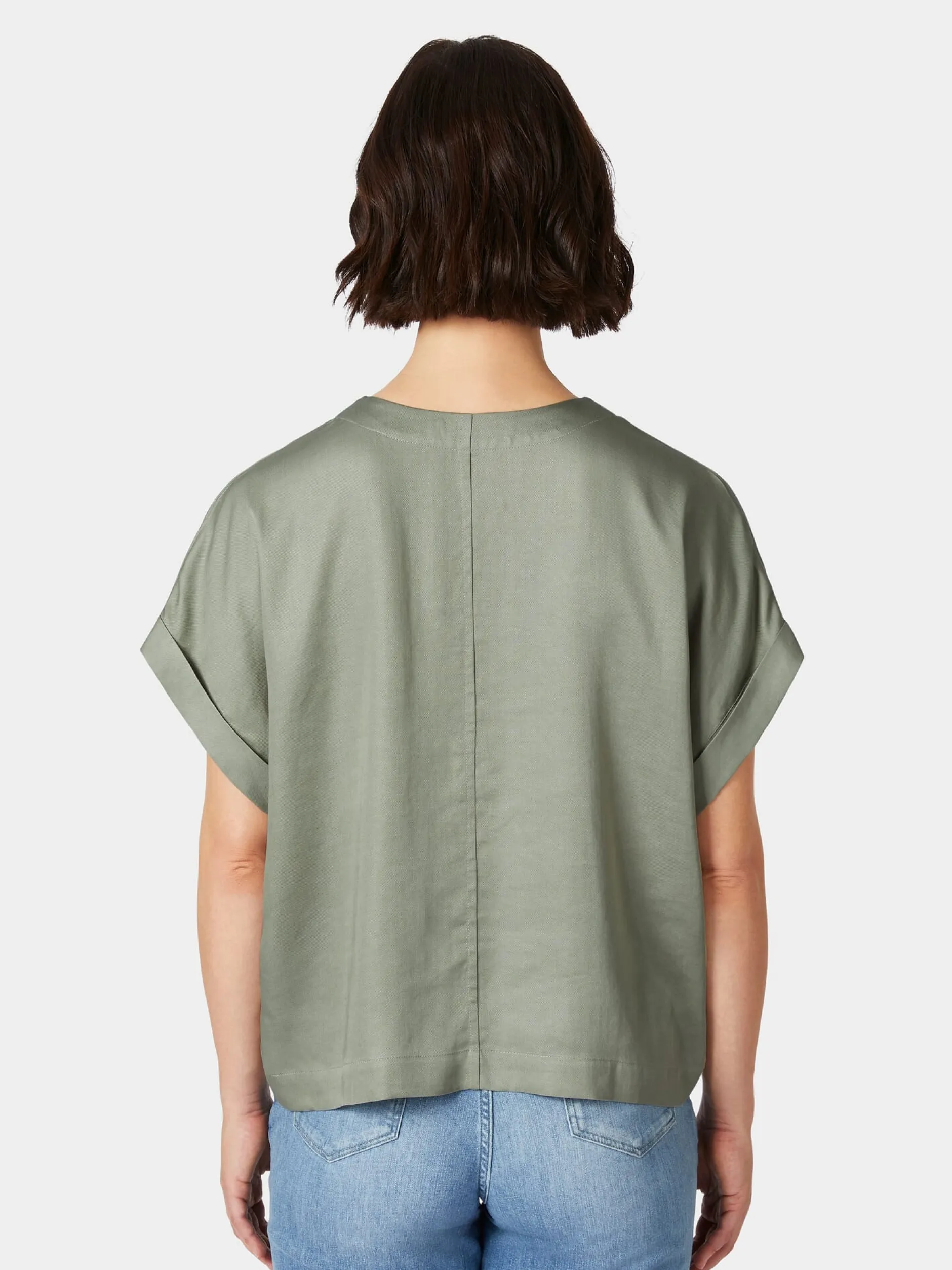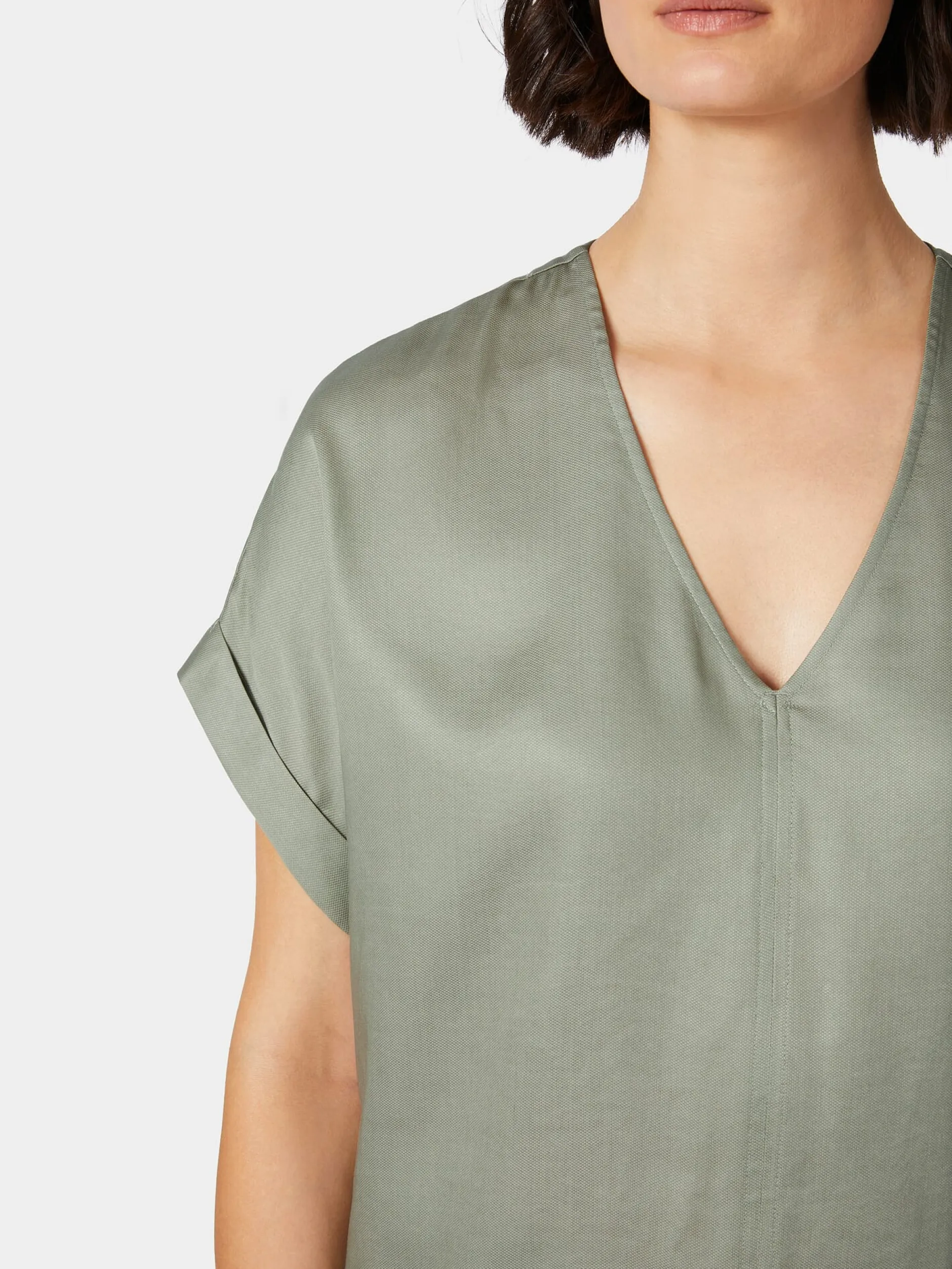 Mit seiner zart glänzenden Oberfläche mit leicht changierender Optik und seiner weichen Haptik wirkt der Stoff dieser Bluse fast wie Seide. Er besteht jedoch aus reinem Lyocell (TENCEL™), einer regenerativen Zellulosefaser, die aus Holz gewonnen wird, das aus kontrollierten Quellen stammt. Das hautsympathische und atmungsaktive Gewebe liegt angenehm glatt und schmiegsam auf der Haut und hat einen schönen, weich fließenden Fall. Gearbeitet ist die Bluse in lockerer, figurumspielender Passform mit überschnittenen Schultern, tiefem V-Ausschnitt und kurzen Ärmeln mit Aufschlag. Längsteilungsnähte vorn und hinten verschlanken die Silhouette.