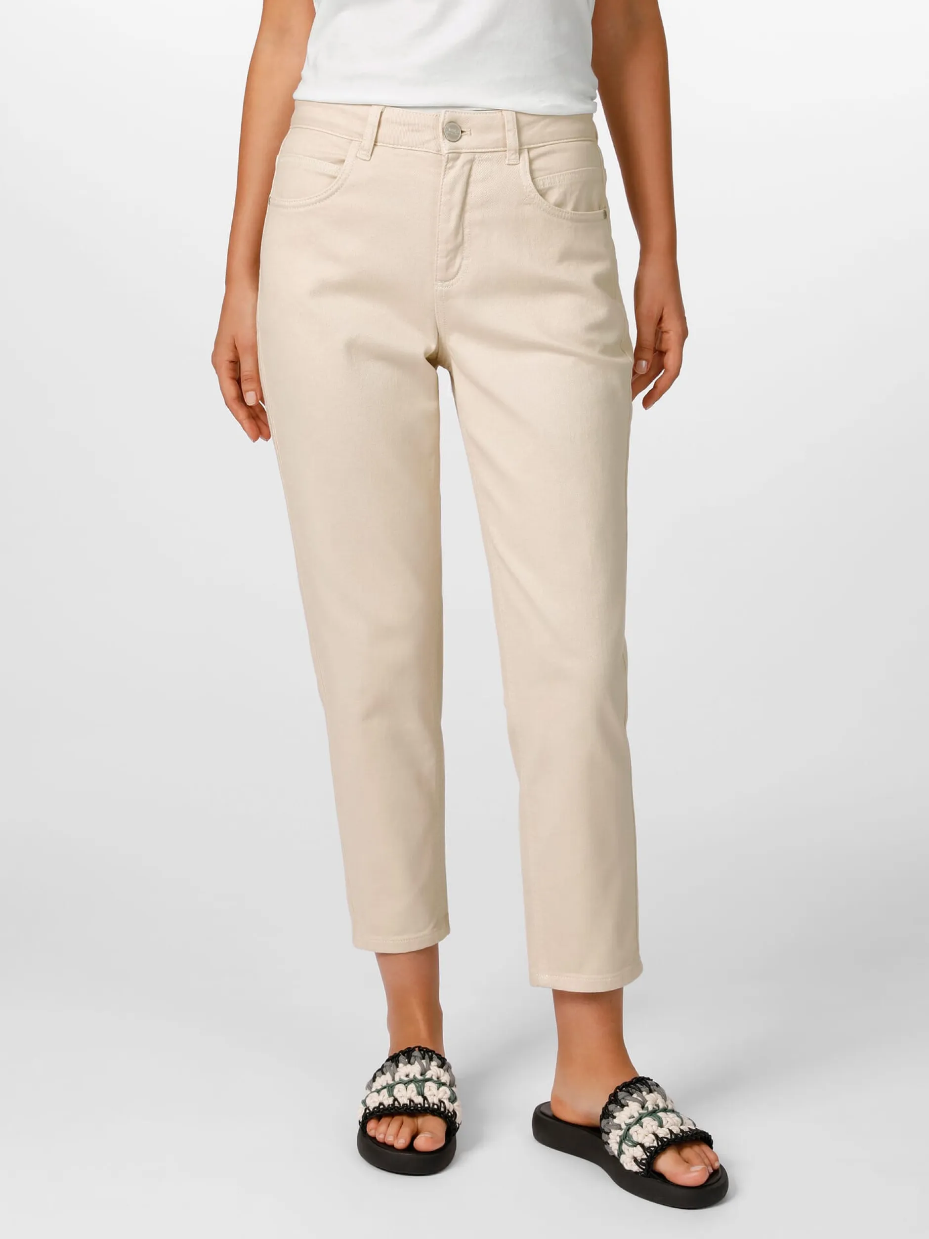 Hosen mit O-Form zeichnen sich durch großzügige, aber figurfreundliche Schnitte aus, wodurch sie bequem sind, ein hohes Maß an Bewegungsfreiheit bieten und zugleich die Figur optisch etwas schlanker wirken lassen. Lanius fertigt diese Hose in O-Form aus kontrolliert biologisch angebauter Baumwolle, etwas Elastan erhöht Tragekomfort und Formtreue. Der Stoff zeigt einen markanten Köpergrat, was der in 7/8-Länge gefertigten Hose einen sportlichen Charakter gibt. Die Hose wird mittels Reißverschluss und Knopf geschlossen, sie ist mit zwei Seitentaschen und zwei aufgesetzten Gesäßtaschen ausgestattet.
