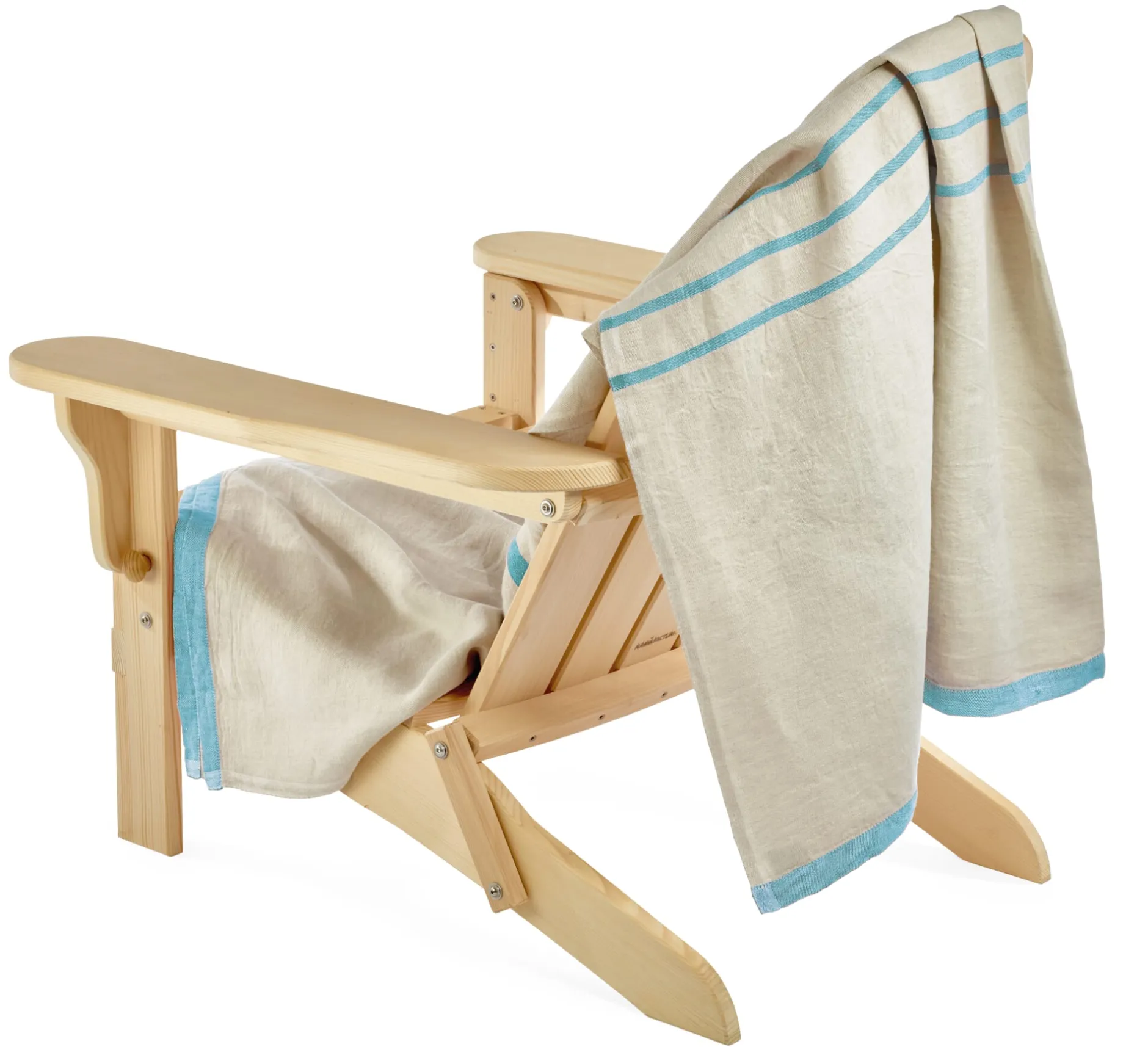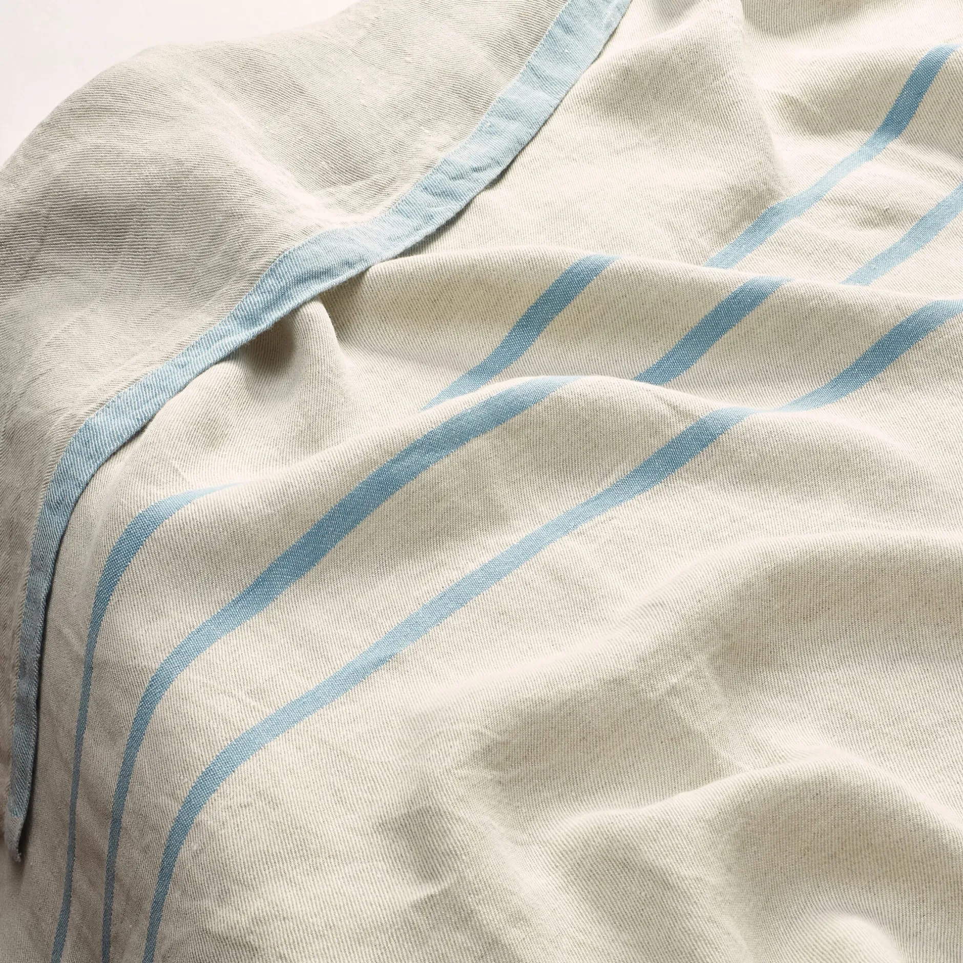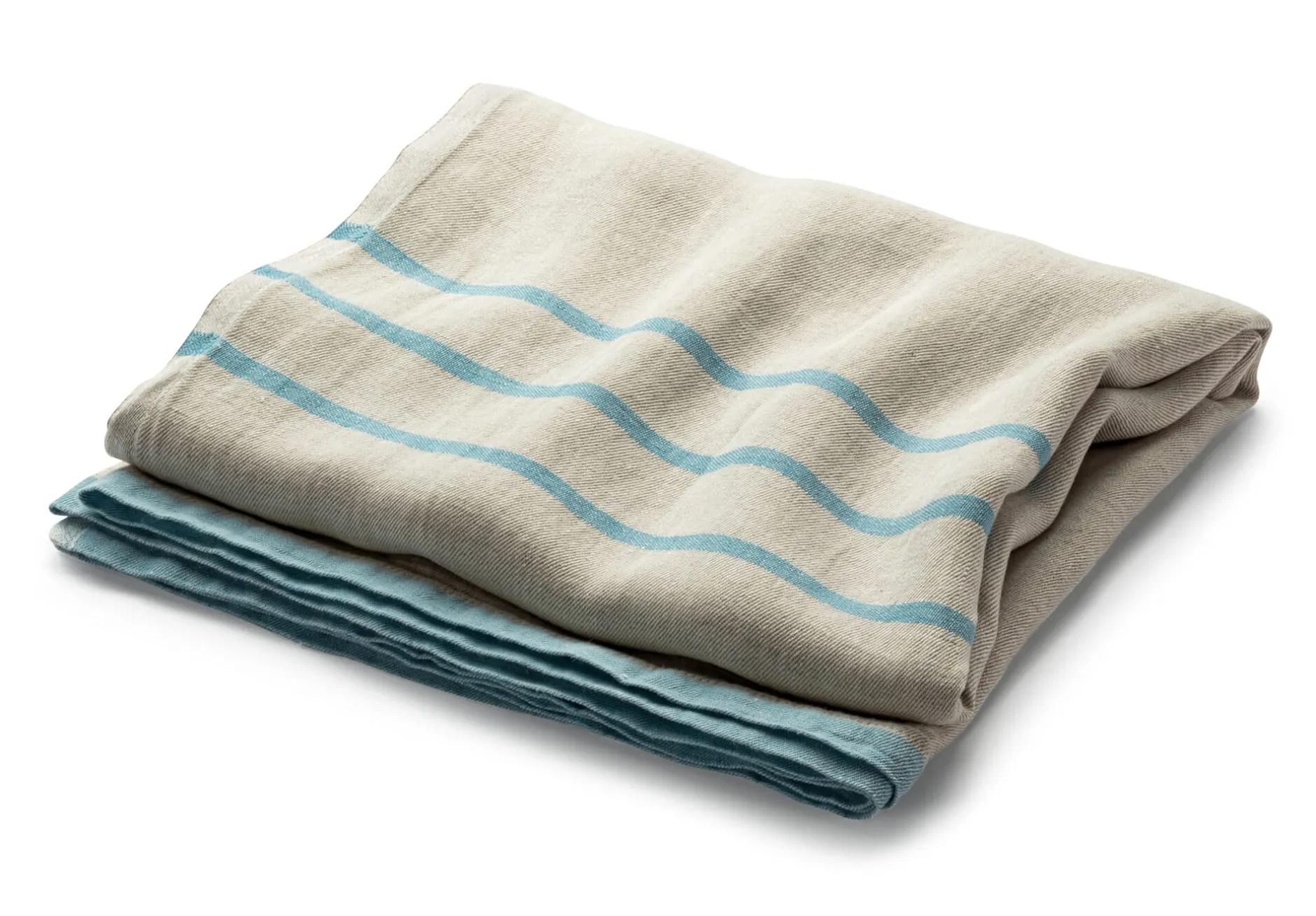 Die finnische Leinenweberei Lapuan Kankurit webt den Fond des Tuchs aus kräftigem, ungefärbtem Leinen, die Streifen aus gefärbtem Leinengarn. Mit einem Gesamtgewicht von etwa 780 g ist es nicht zu schwer fürs Gepäck, das Gewebe hingegen ist kräftig genug, um allen Anforderungen unterwegs standzuhalten. Leinen ist vor allem im Sommer angenehm, da es rasch viel Feuchtigkeit aufnehmen und ebenso schnell wieder abgeben kann – es fühlt sich angenehm kühlend an, ist zudem antistatisch und aufgrund der glatten Faseroberfläche pollen-, staub- und schmutzabweisend. Das Tuch ist sanforisiert und hat daher einen weichen, schmiegsamen Griff.