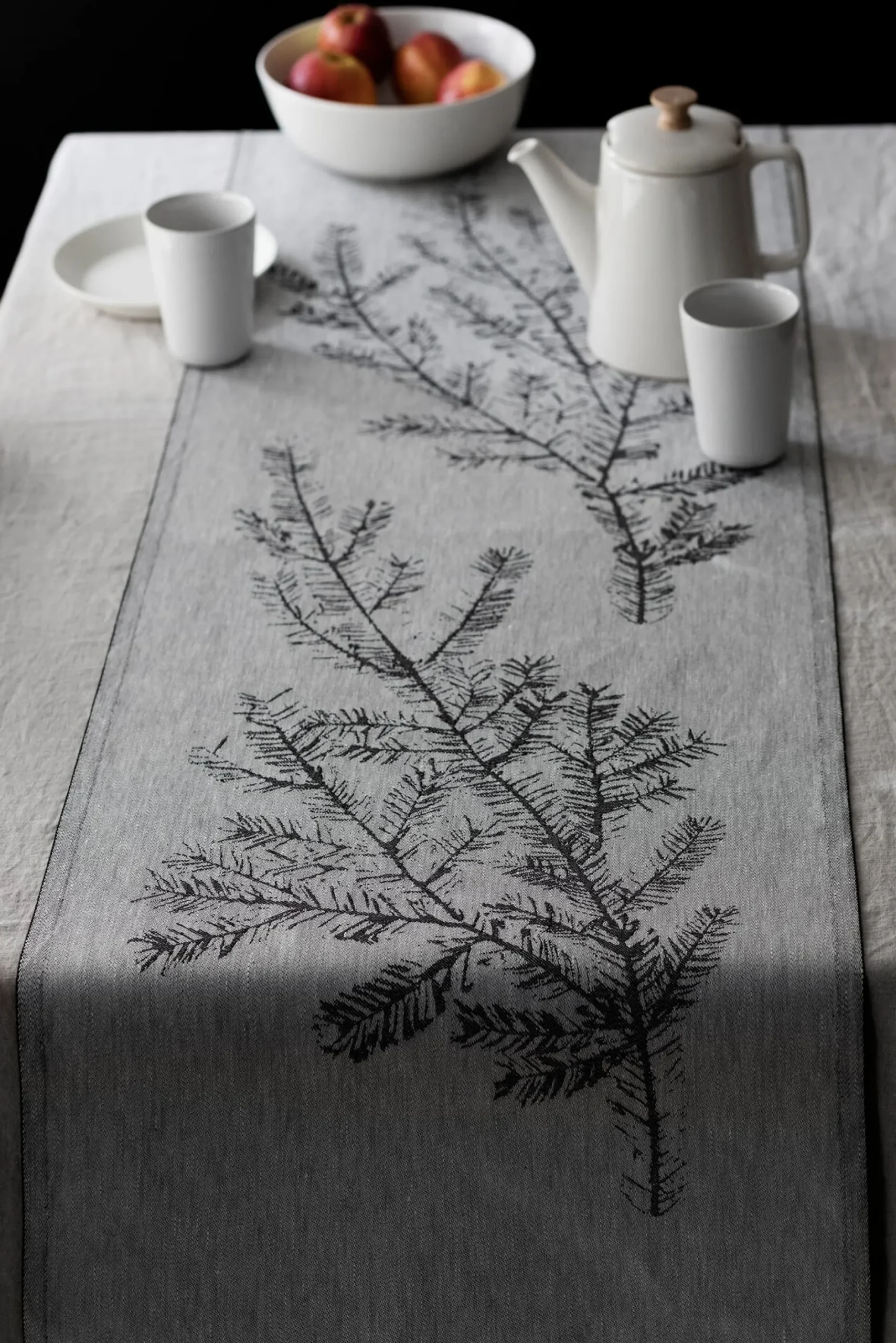 Die Illustration aus der Feder von Teemu Järvi scheint sich den Jahreszeiten anzupassen: Im Herbst sorgt der Tischläufer für herbstliche Stimmung, in der Adventszeit passt er zu Weihnachtskranz & Co., und genauso gut lässt er sich im Frühjahr und Sommer verwenden. Lapuan Kankurit verwendet Leinengarn aus bestem europäischem Langfaserflachs (mit dem Siegel Masters of Linen®). Der Anteil an Baumwolle (40%) sorgt für den weichen Griff des Gewebes. Mit einem mittleren Flächengewicht von 300 g/qm ist es recht robust und strapazierbar. Die jacquardgewebte Illustration zeigt sich auf der Rückseite in gegengleicher Farbe. Passende Tischsets und ein Geschirrtuch mit diesem Motiv finden Sie ebenfalls in unserem Sortiment.