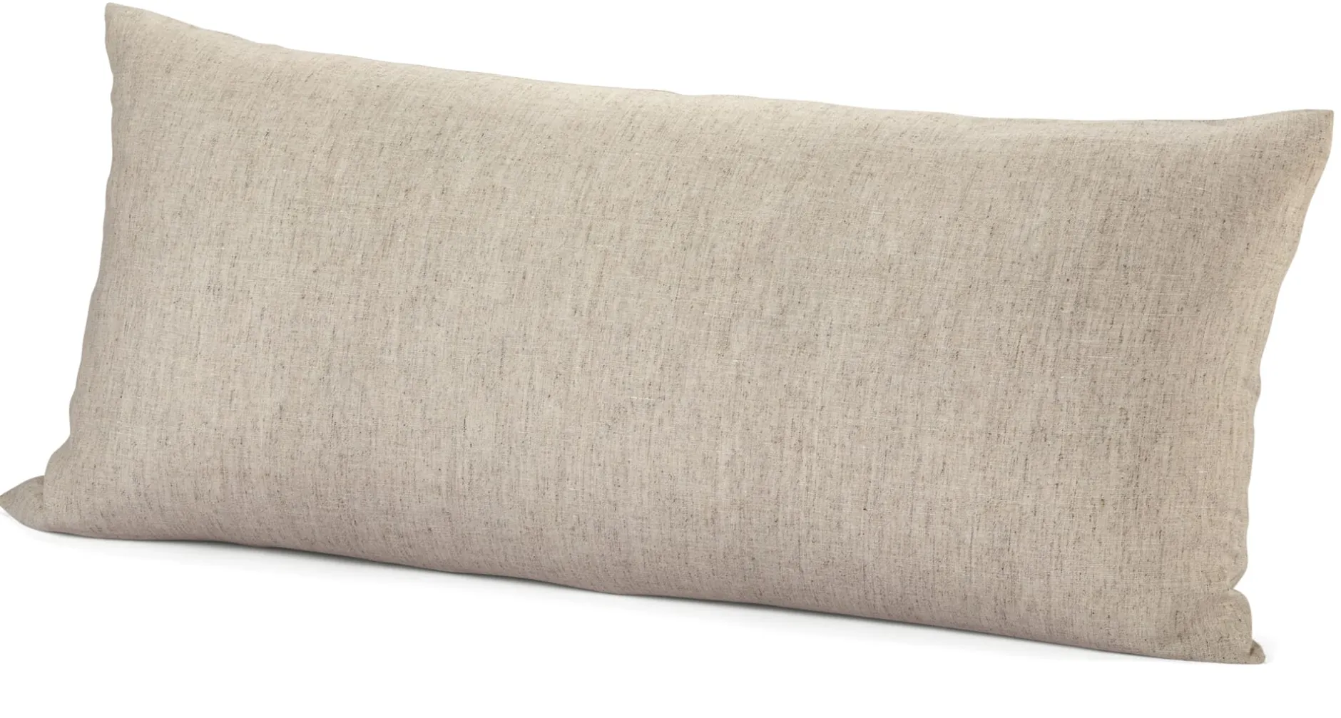 59% Hanf und 41% Leinen. Flächengewicht 178 g/qm. Die Bezüge sind vorgewaschen, der Resteinlauf beträgt 4%. Hergestellt in Österreich. Farbe Natur mit grau melierten Einwürfen und schwarzen Zwirnknöpfen.