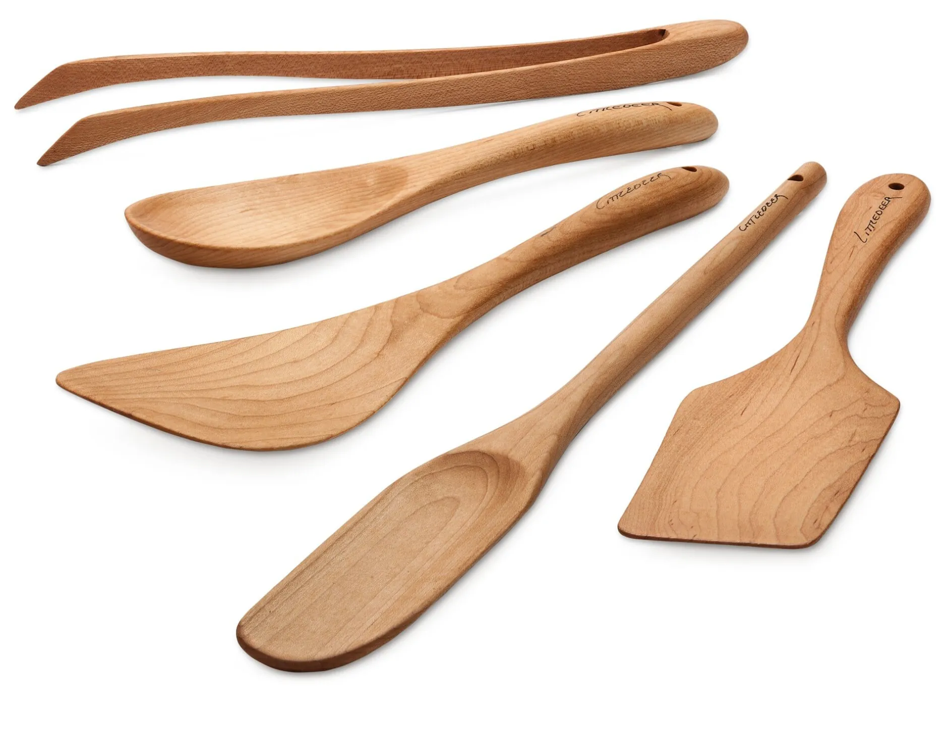 Bei dem Kochwerkzeug nun ist der Holzquerschnitt so ausgelegt, dass nicht nur die im Einsatz besonders belasteten Partien ausreichend dimensioniert sind. Die Gerätschaft unterstützt auch beim Rühren im Topf oder Wenden von Bratgut in der Pfanne eine dynamische Handbewegung. Das Ausformen aus dem vollen Holz geschieht mit der Hilfe von Bandsäge und Schleifmaschine noch in Handarbeit. Zur Verwendung kommt kanadisches Ahornholz aus der Umgebung des Betriebes, das nach dem Schleifen noch eine oberflächenschützende Behandlung mit Weißöl erfährt.